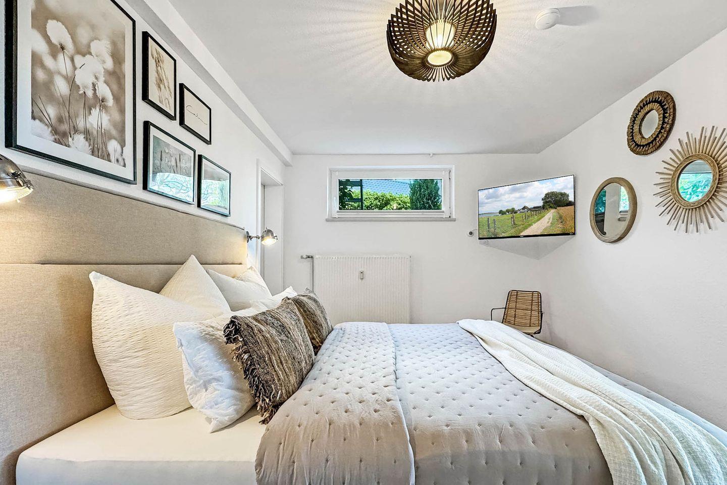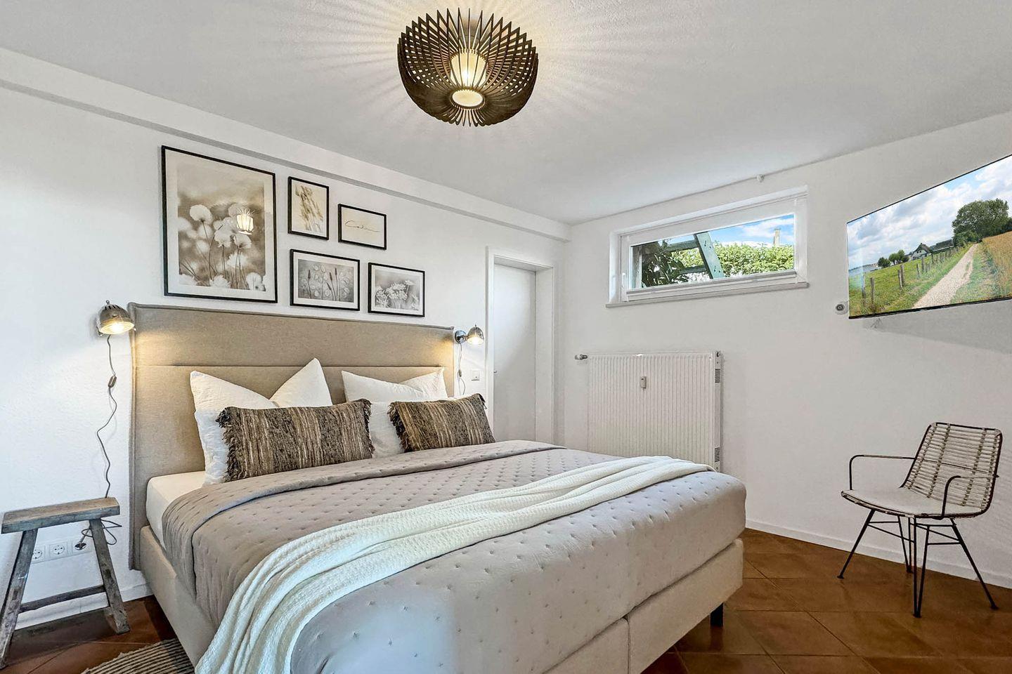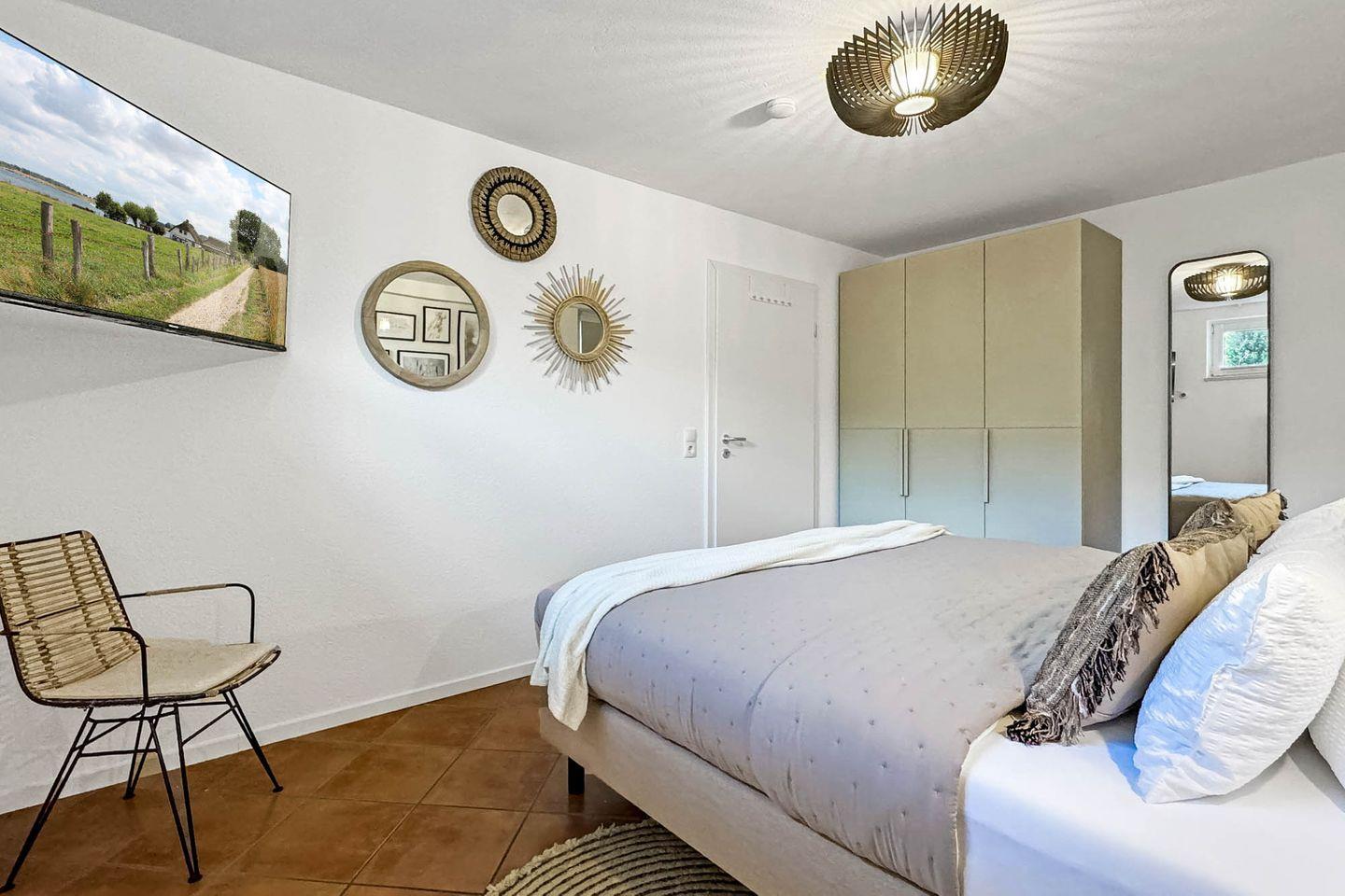 Auf dieser Etage befinden sich außerdem das zweite Schlafzimmer mit Doppelbett sowie ein weiteres Badezimmer mit Badewanne und Duscharmatur.
