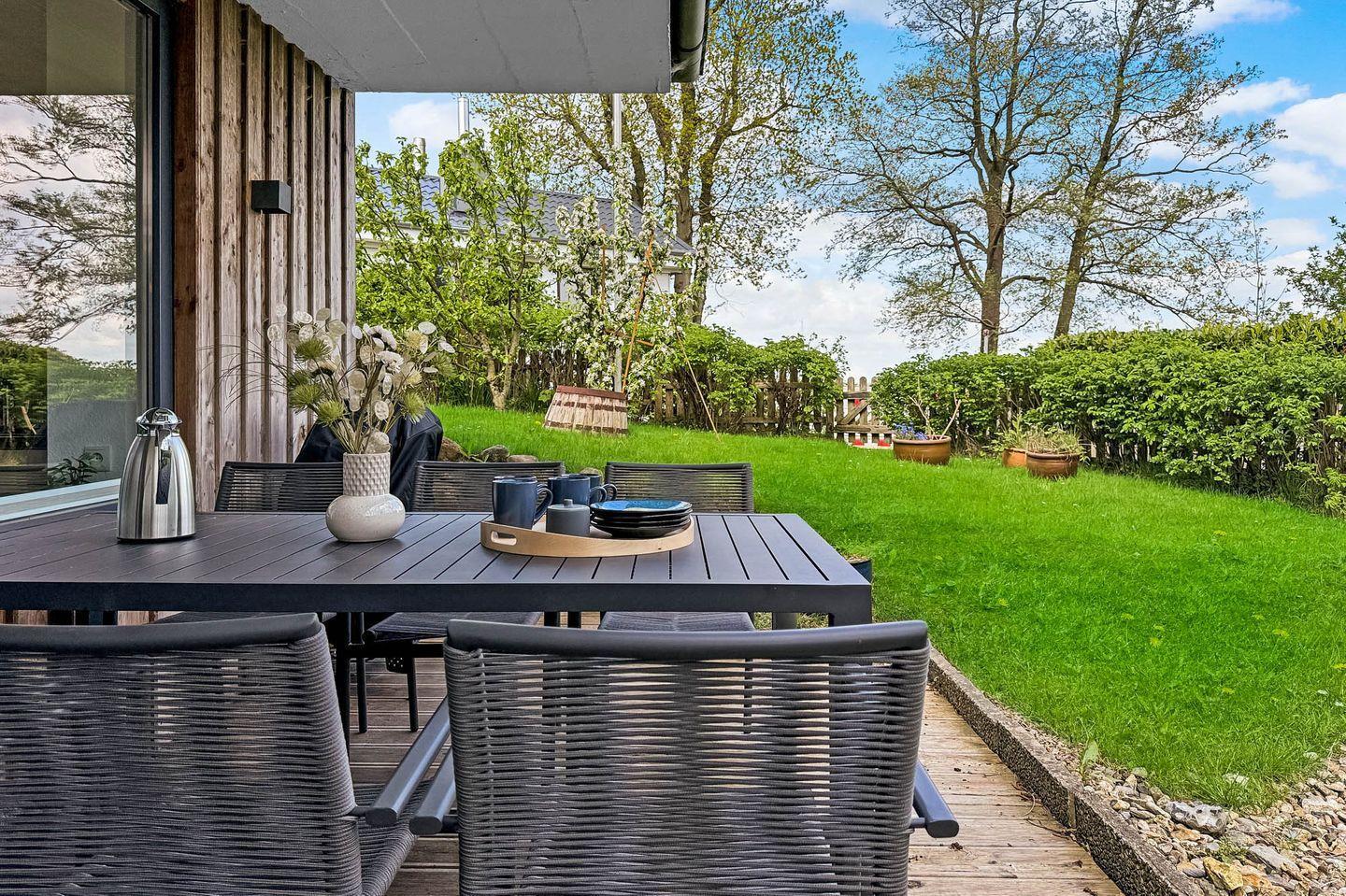 Zum Ferienhaus gehört ein kleiner Garten, in dem sich immer ein sonniges Plätzchen finden lässt. Von hier aus gelangt man auch direkt auf einen kleinen Wanderweg, der zum Schleiufer, zu einem kleinen Sportboothafen und zur Badestelle mit Spielplatz, Fußballtoren und Basketballkorb führt.