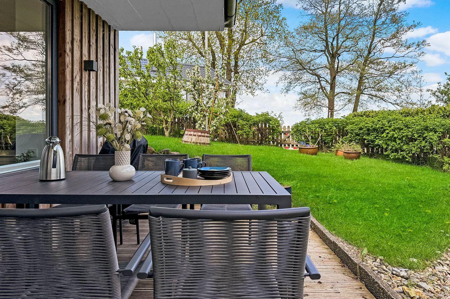 Von hier aus geht es auch auf die teilüberdachte Terrasse. Bequeme Gartenmöbel und ein Elektrogrill laden dazu ein, draußen zu essen, die Sonne zu genießen oder den Tag einfach entspannt ausklingen zu lassen.