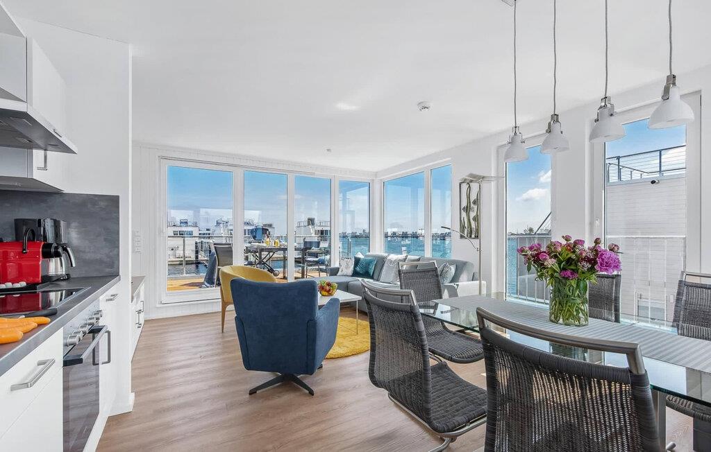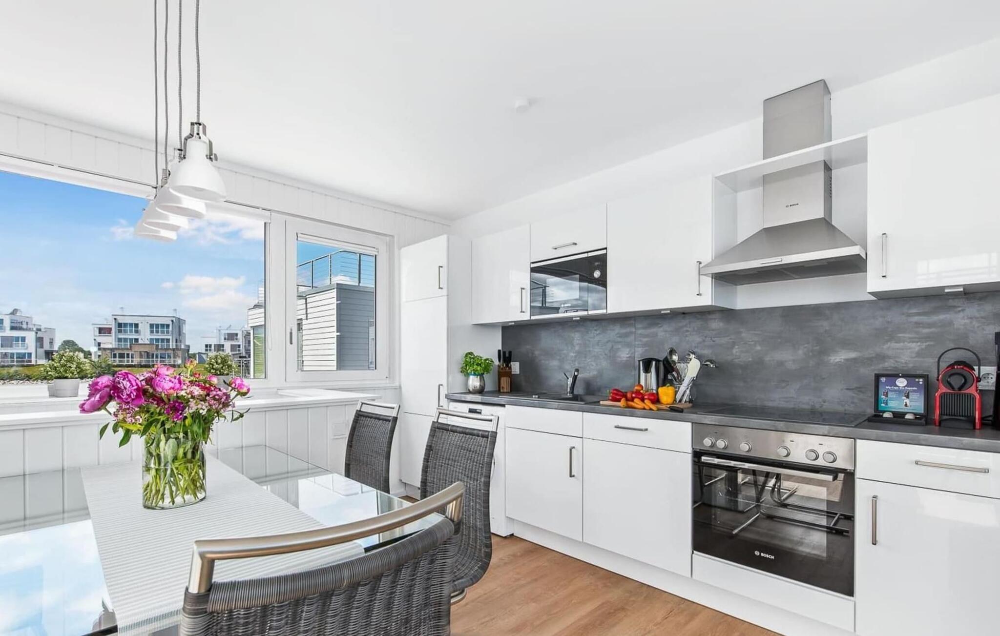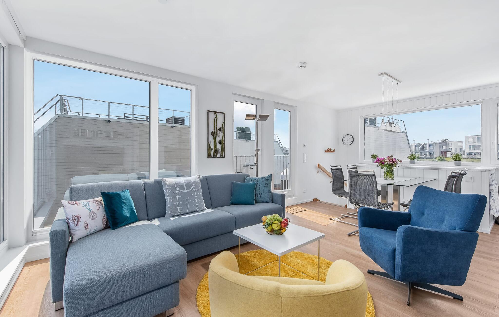 Der lichtdurchflutete und offen gestaltete Wohn- und Essbereich befindet sich in der oberen Wohnebene. Köstliche Urlaubsmahlzeiten lassen sich in der modernen und hochwertig ausgestatteten Wohnküche zubereiten. Während bodentiefe Fensterfronten einen phänomenalen Rundumblick ermöglichen, lädt die angrenzende Terrasse dazu ein, die frische Ostseebrise zu genießen.