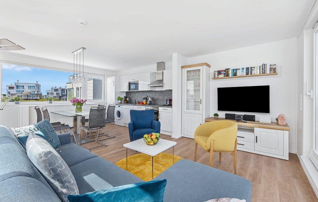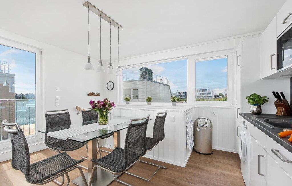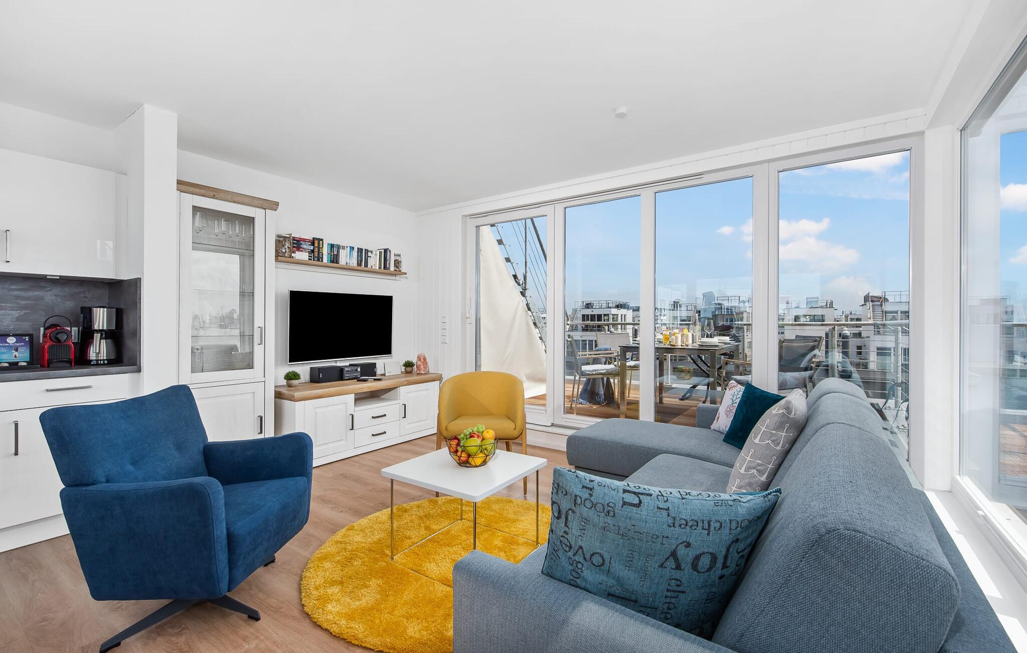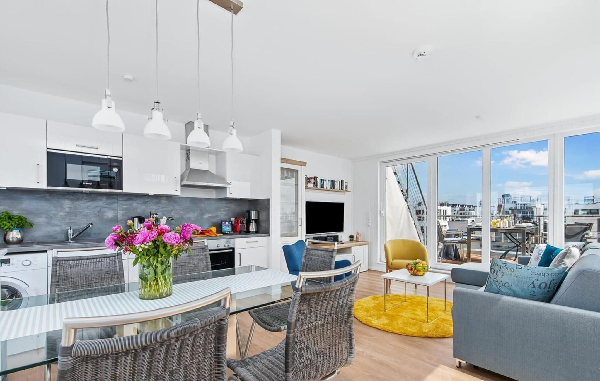 Der lichtdurchflutete und offen gestaltete Wohn- und Essbereich befindet sich in der oberen Wohnebene. Köstliche Urlaubsmahlzeiten lassen sich in der modernen und hochwertig ausgestatteten Wohnküche zubereiten. Während bodentiefe Fensterfronten einen phänomenalen Rundumblick ermöglichen, lädt die angrenzende Terrasse dazu ein, die frische Ostseebrise zu genießen.