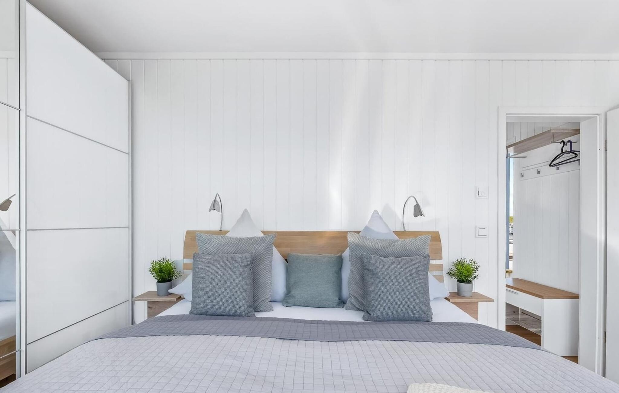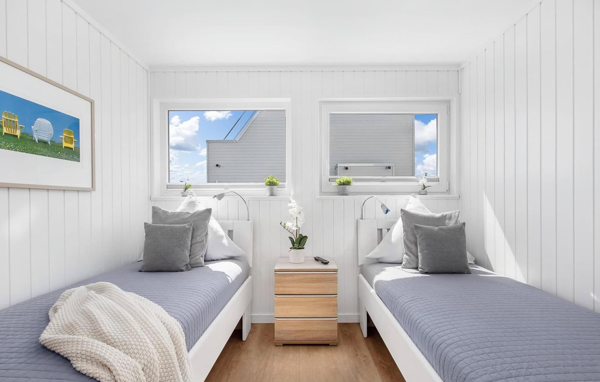 Unter Deck befindet sich der Schlafbereich des schwimmenden Hauses. Ein Erlebnis ist das Hauptschlafzimmer, denn von hier aus darf Gast vor unmittelbarer Wasserkulisse einschlafen und aufwachen. Bodentiefe Fenster und eine direkt an das Schlafzimmer angrenzende Terrasse machen die umläufige Begehung des Hauses möglich. Ein weiteres Schlafzimmer mit zwei Einzelbetten befindet sich ebenfalls auf der untersten Ebene des Ferienhauses.