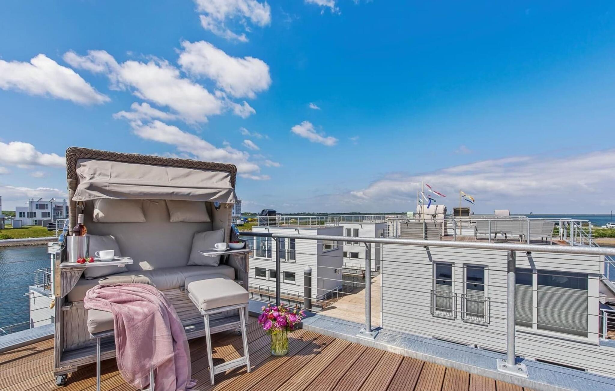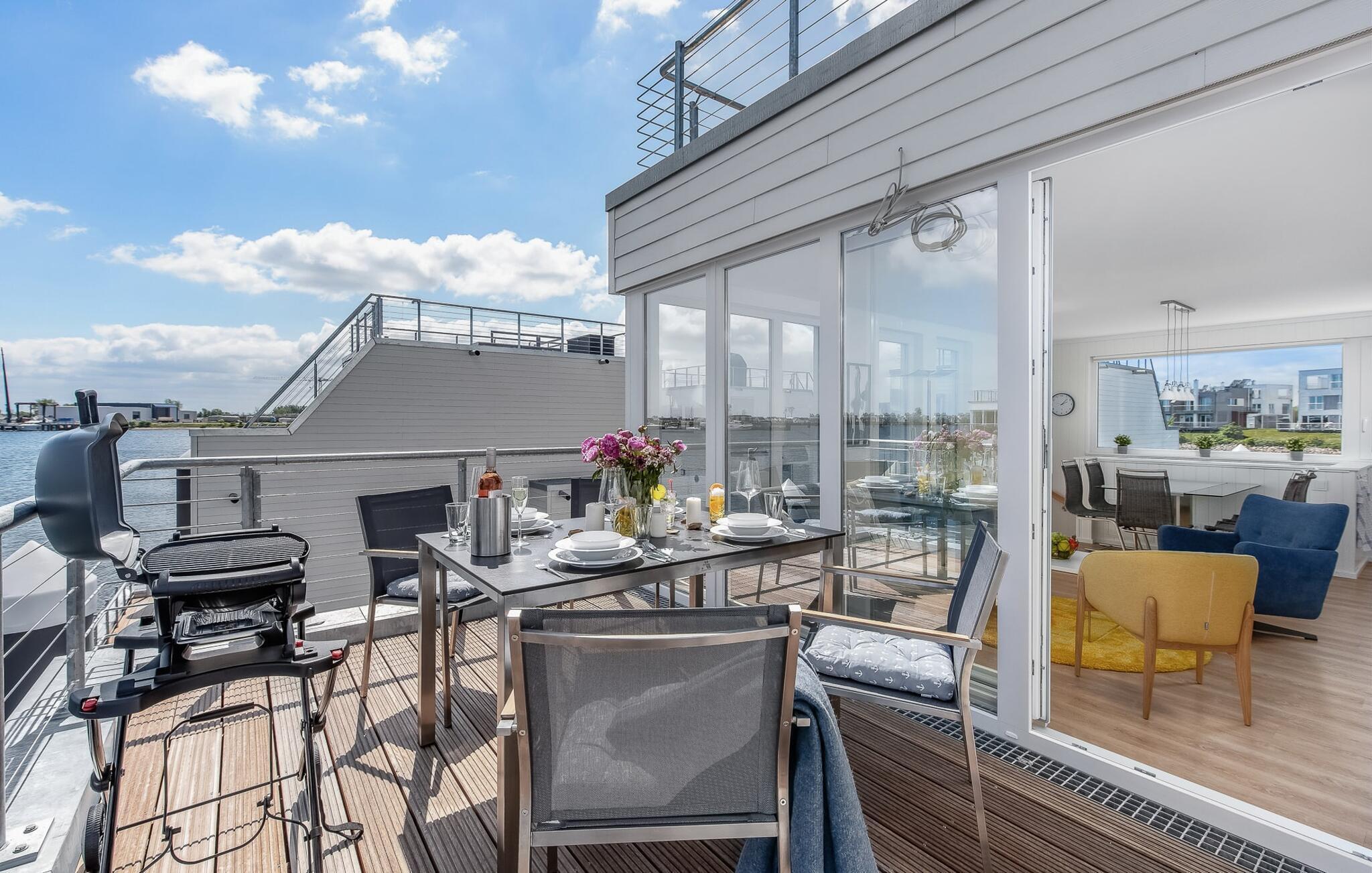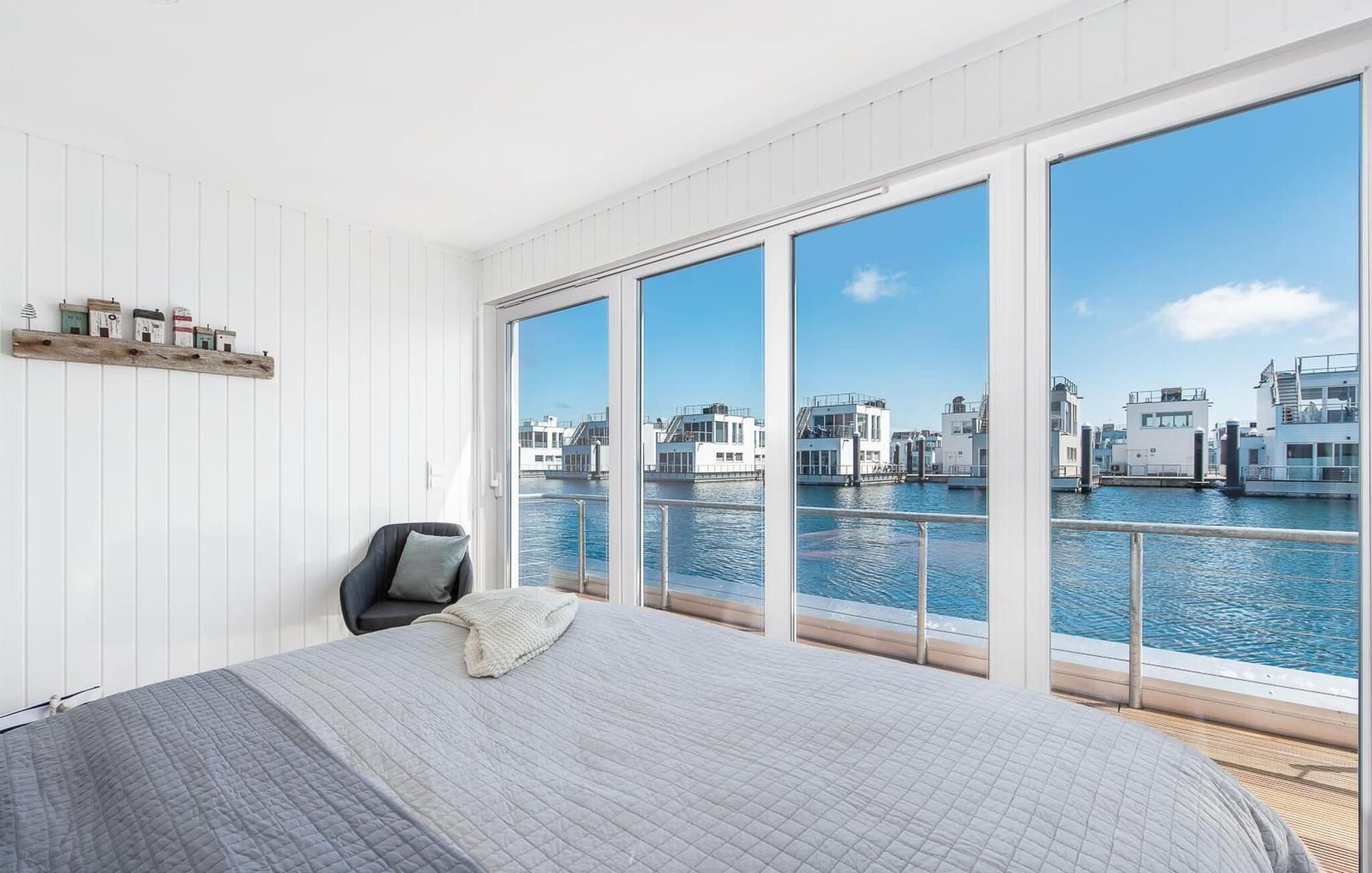 Erleben Sie Luxus und Wasserblick im schwimmenden Ferienhaus Stockholm im OstseeResort Olpenitz.