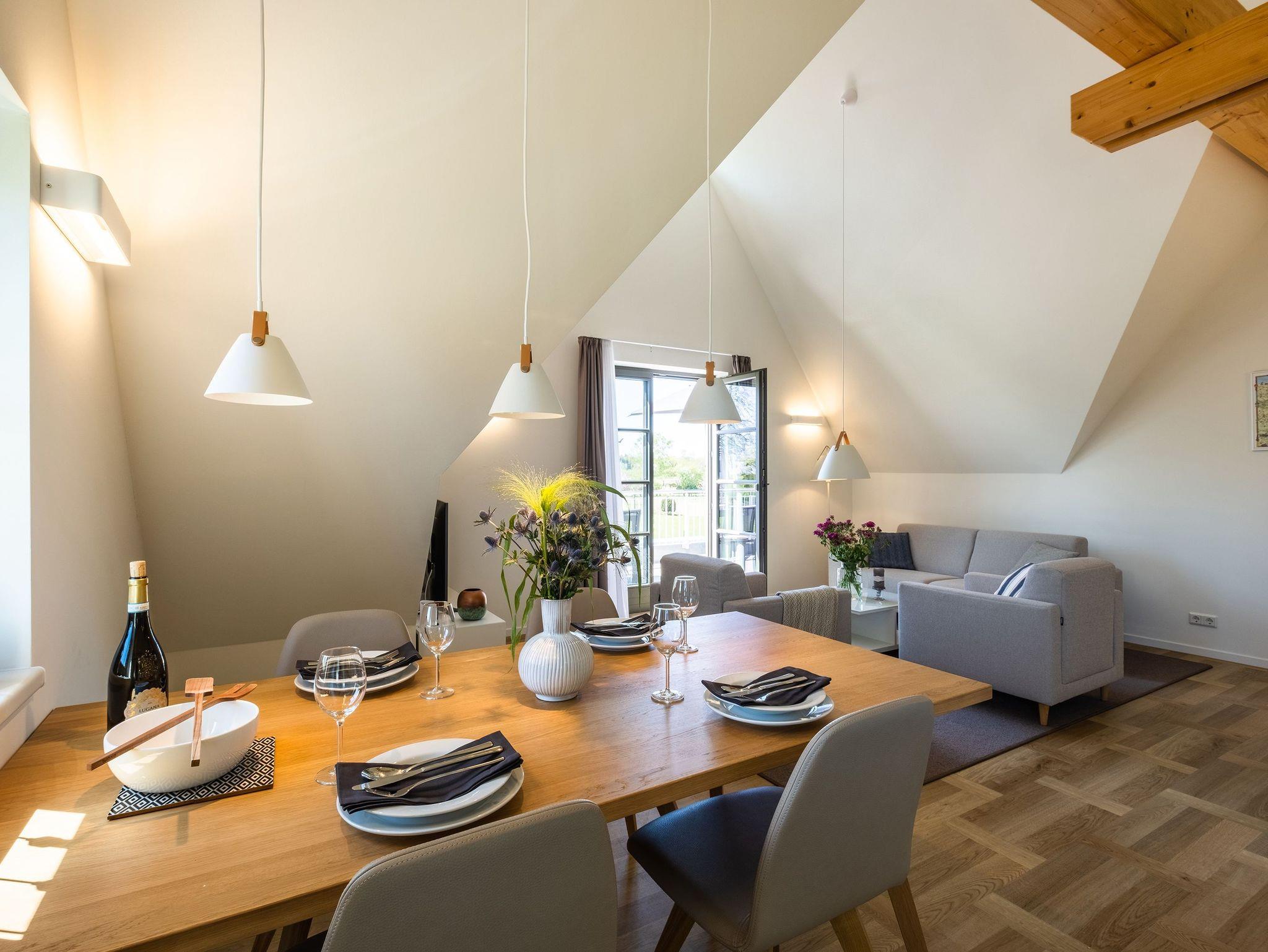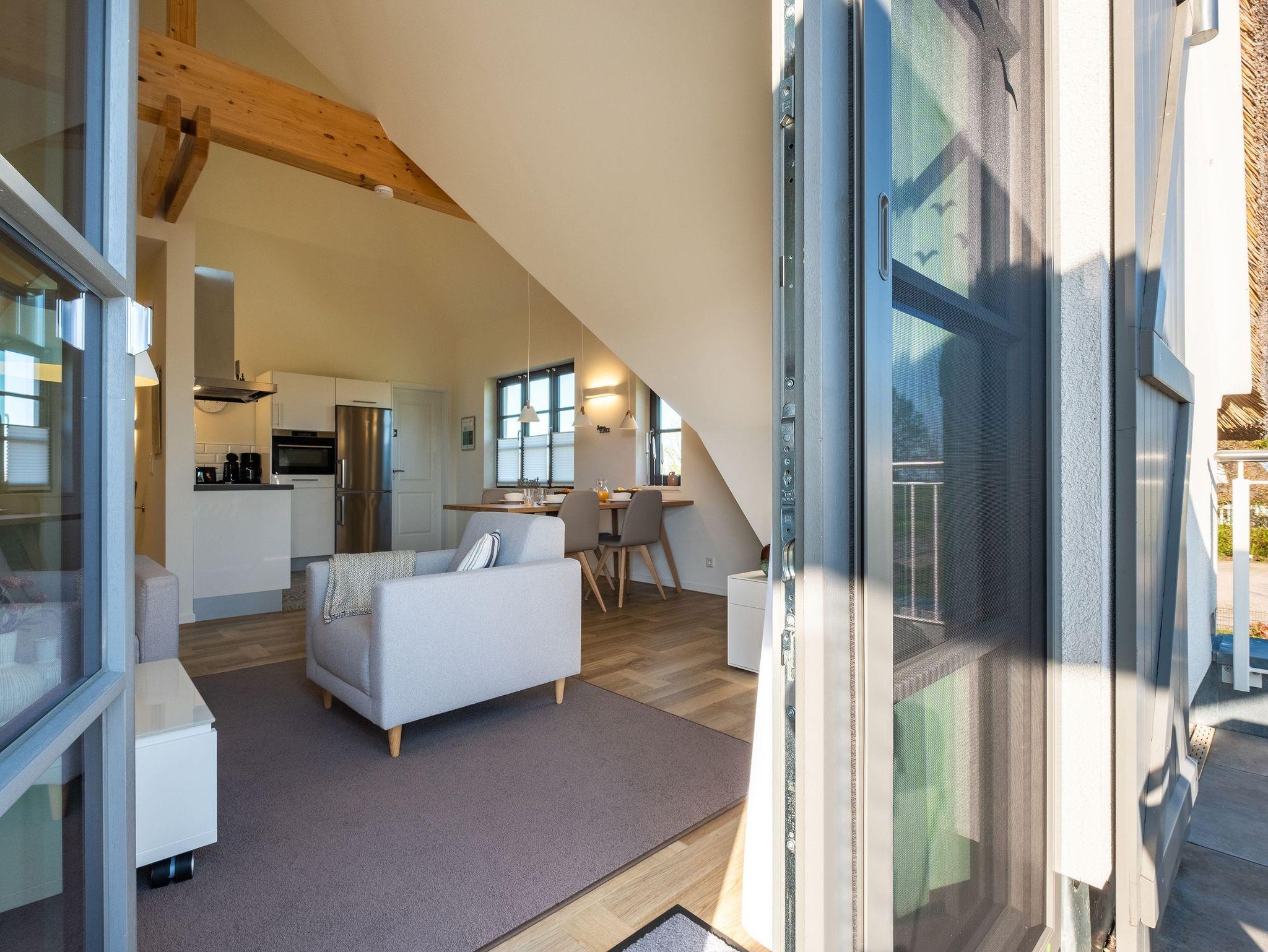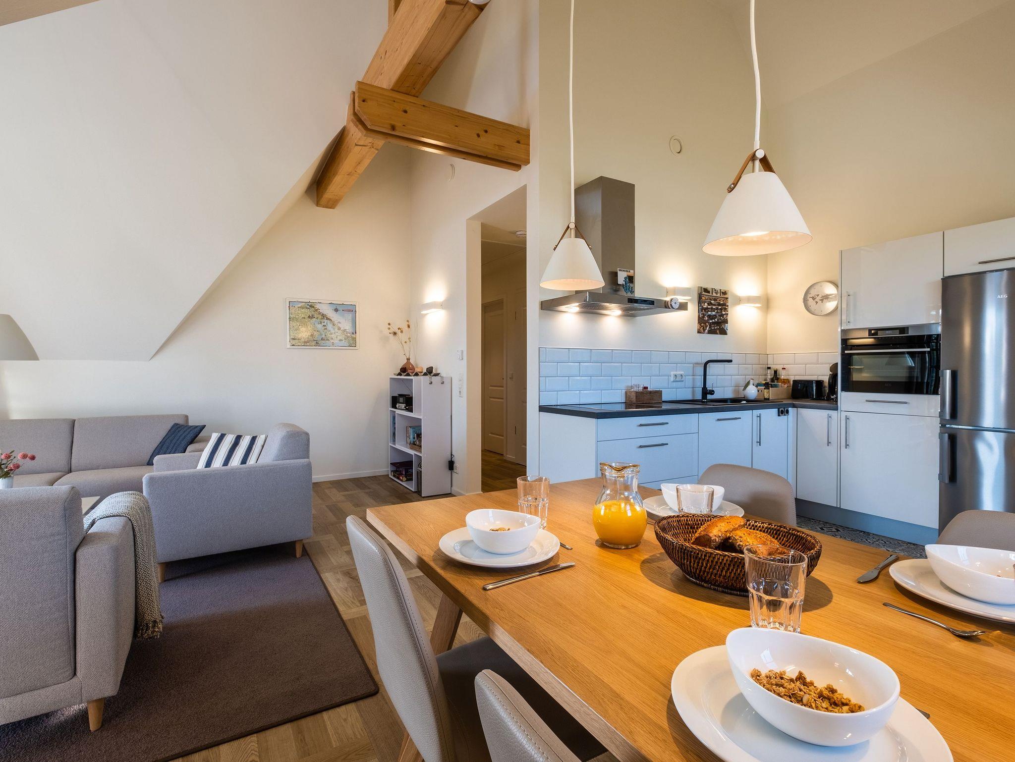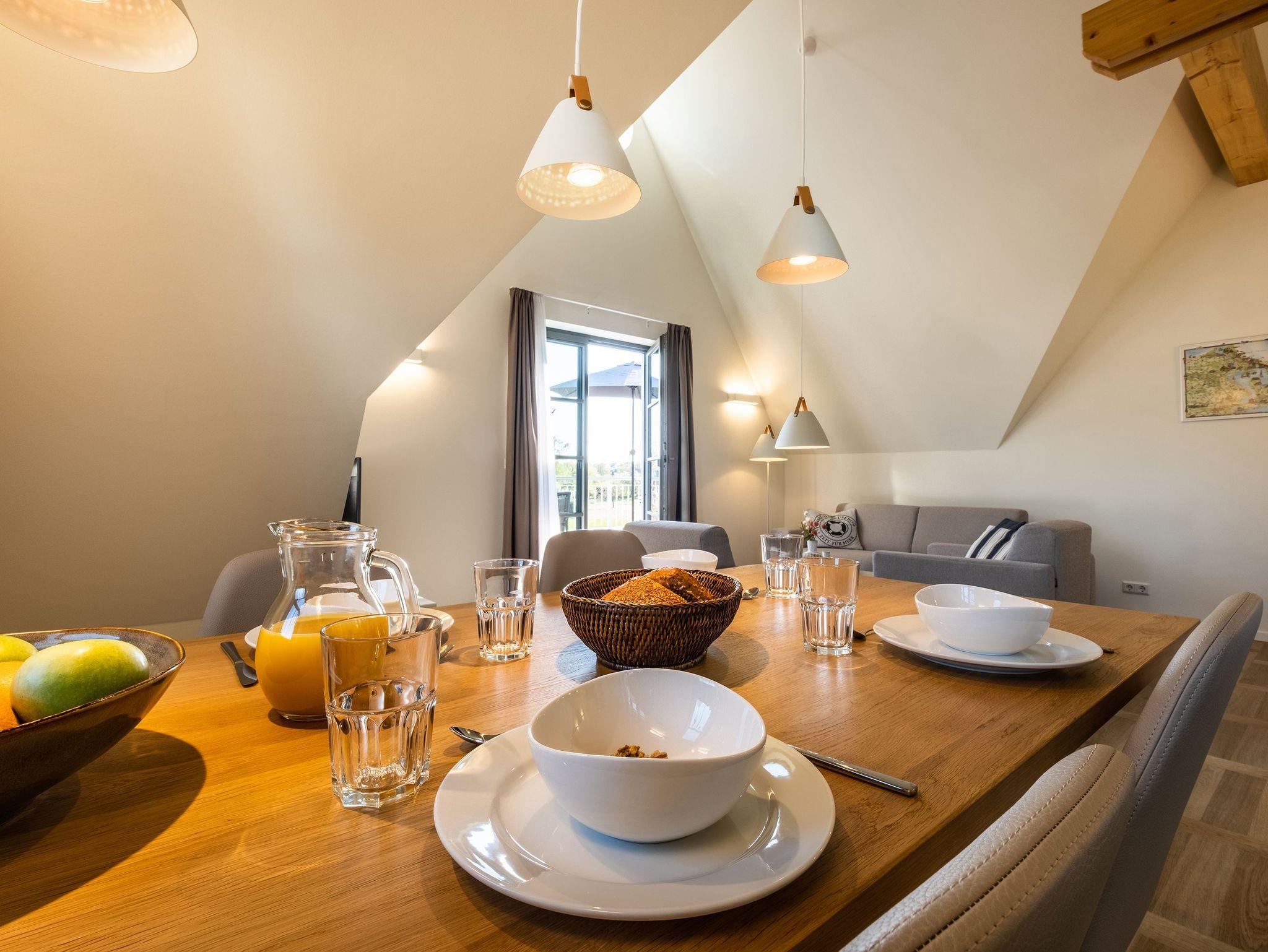 Die moderne und helle Ferienwohnung ist hochwertig ausgestattet. Sie verfügt über eine komplett eingerichtete Einbauküche mit Spülmaschine, Mikrowelle, Induktionsherd und großem Kühlraum mit separatem Gefrierabteil sowie Kaffeemaschine, Wasserkocher und Toaster. Ebenfalls verfügt die Wohnung über eine Waschmaschine. Der Wohnraum ist durch die ca. vier Meter hohe offene Decke geprägt und die fast 12m² große Dachterrasse bietet einen weiten Blick über die Felder, auf das Haff und Wasser. Das große Tageslichtbad ist mit einer bodentiefen Dusche mit Glasabtrennung ausgestattet. Das Hauptschlafzimmer verfügt über ein Doppelbett und das zweite Schlafzimmer über zwei Einzelbetten. Bei allen Betten handelt es sich um Boxspringbetten. Im Wohnzimmer, sowie in einem Schlafzimmer befinden sich jeweils ein Flachbildfernseher.