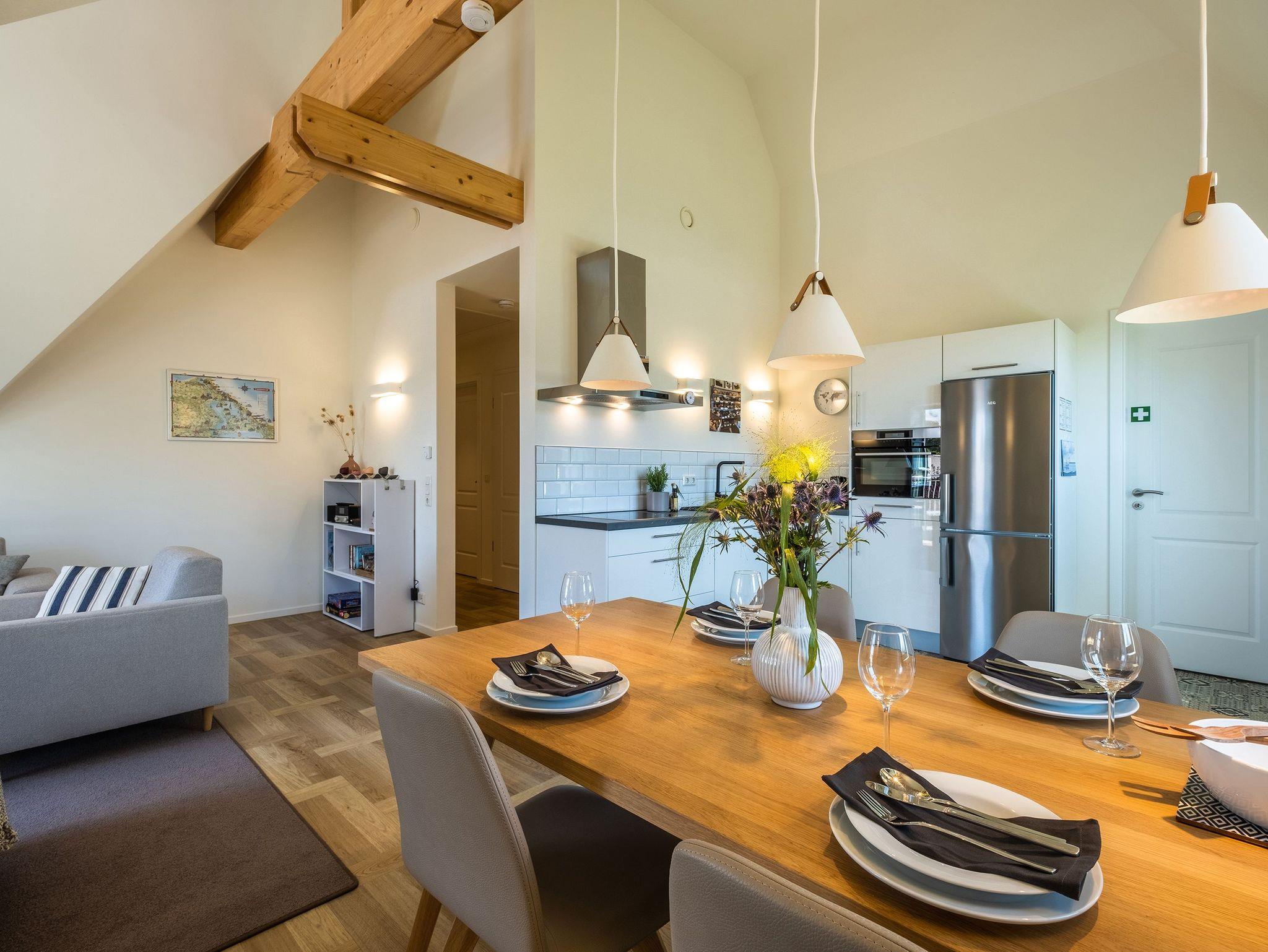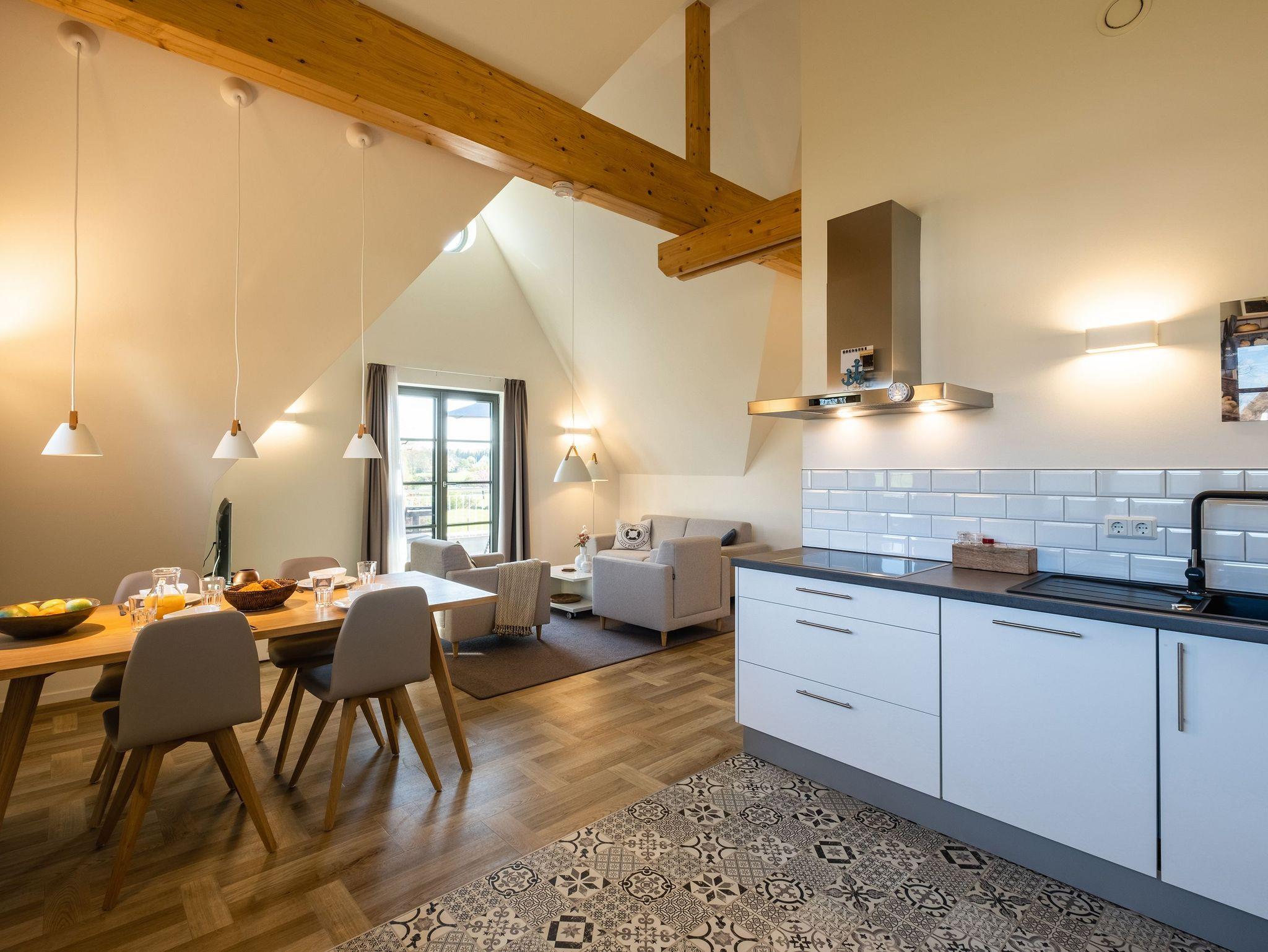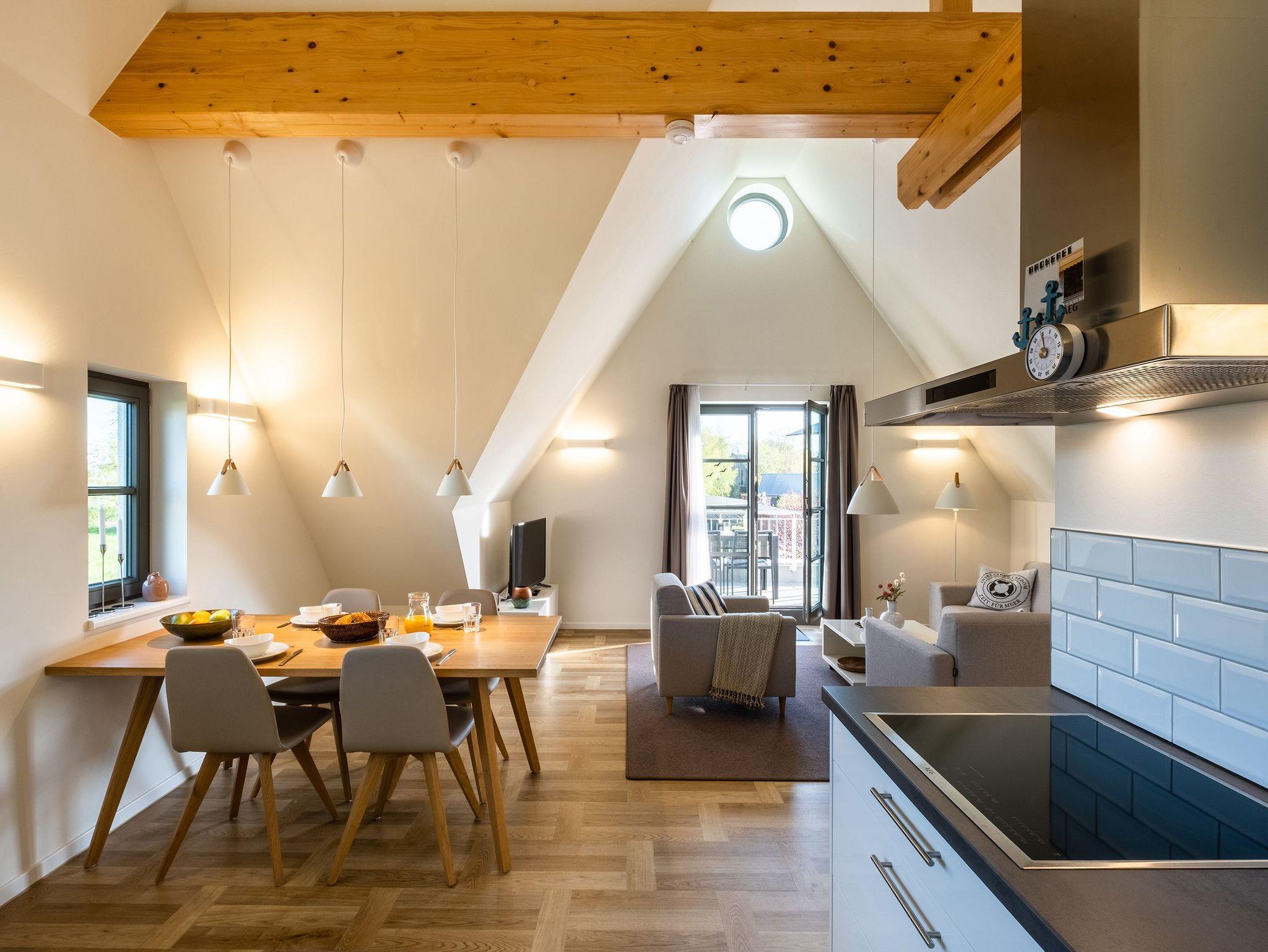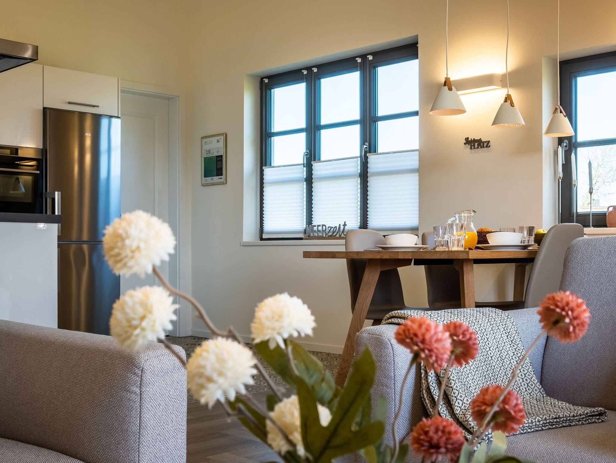 Die moderne und helle Ferienwohnung ist hochwertig ausgestattet. Sie verfügt über eine komplett eingerichtete Einbauküche mit Spülmaschine, Mikrowelle, Induktionsherd und großem Kühlraum mit separatem Gefrierabteil sowie Kaffeemaschine, Wasserkocher und Toaster. Ebenfalls verfügt die Wohnung über eine Waschmaschine. Der Wohnraum ist durch die ca. vier Meter hohe offene Decke geprägt und die fast 12m² große Dachterrasse bietet einen weiten Blick über die Felder, auf das Haff und Wasser. Das große Tageslichtbad ist mit einer bodentiefen Dusche mit Glasabtrennung ausgestattet. Das Hauptschlafzimmer verfügt über ein Doppelbett und das zweite Schlafzimmer über zwei Einzelbetten. Bei allen Betten handelt es sich um Boxspringbetten. Im Wohnzimmer, sowie in einem Schlafzimmer befinden sich jeweils ein Flachbildfernseher.