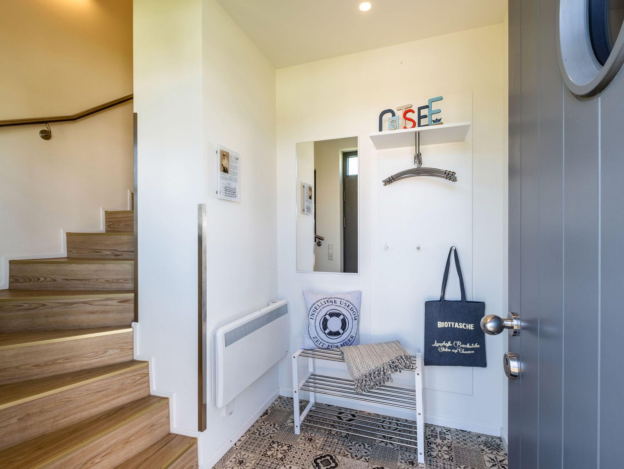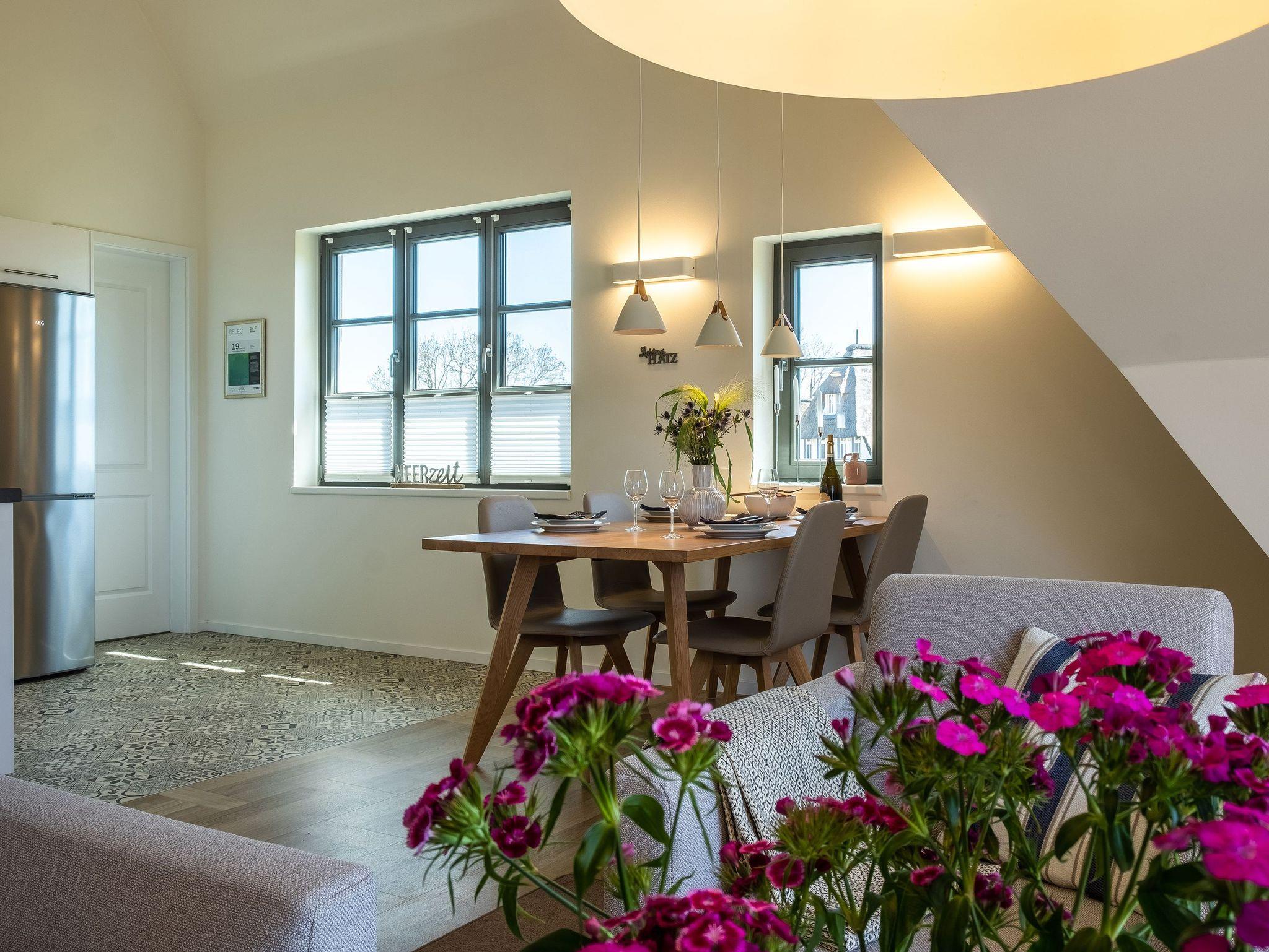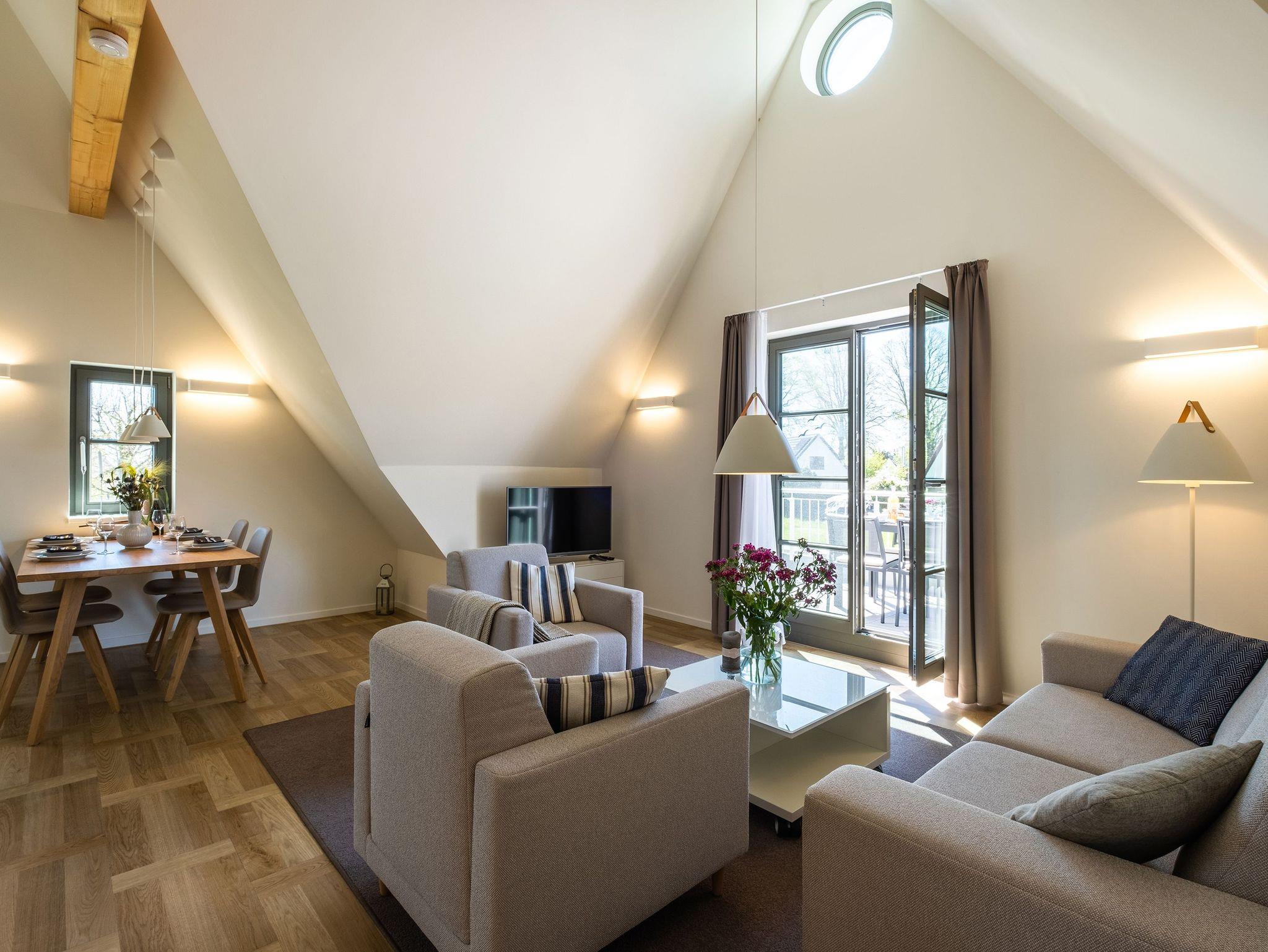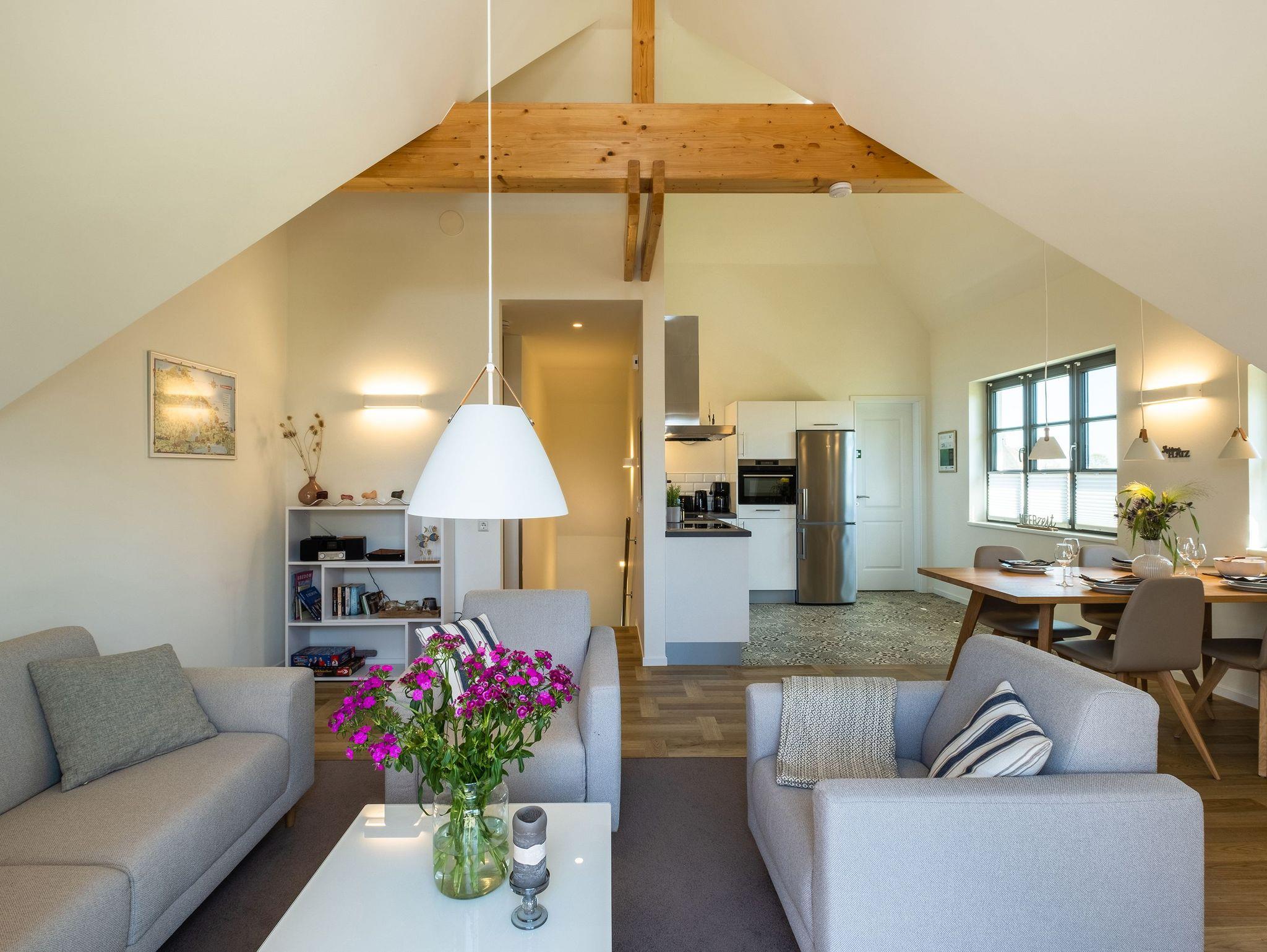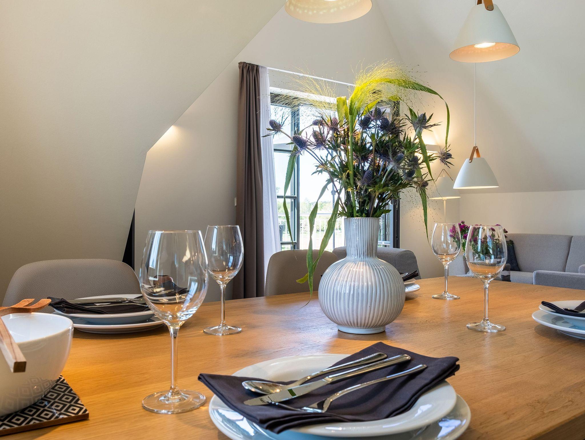 Die moderne und helle Ferienwohnung ist hochwertig ausgestattet. Sie verfügt über eine komplett eingerichtete Einbauküche mit Spülmaschine, Mikrowelle, Induktionsherd und großem Kühlraum mit separatem Gefrierabteil sowie Kaffeemaschine, Wasserkocher und Toaster. Ebenfalls verfügt die Wohnung über eine Waschmaschine. Der Wohnraum ist durch die ca. vier Meter hohe offene Decke geprägt und die fast 12m² große Dachterrasse bietet einen weiten Blick über die Felder, auf das Haff und Wasser. Das große Tageslichtbad ist mit einer bodentiefen Dusche mit Glasabtrennung ausgestattet. Das Hauptschlafzimmer verfügt über ein Doppelbett und das zweite Schlafzimmer über zwei Einzelbetten. Bei allen Betten handelt es sich um Boxspringbetten. Im Wohnzimmer, sowie in einem Schlafzimmer befinden sich jeweils ein Flachbildfernseher.
