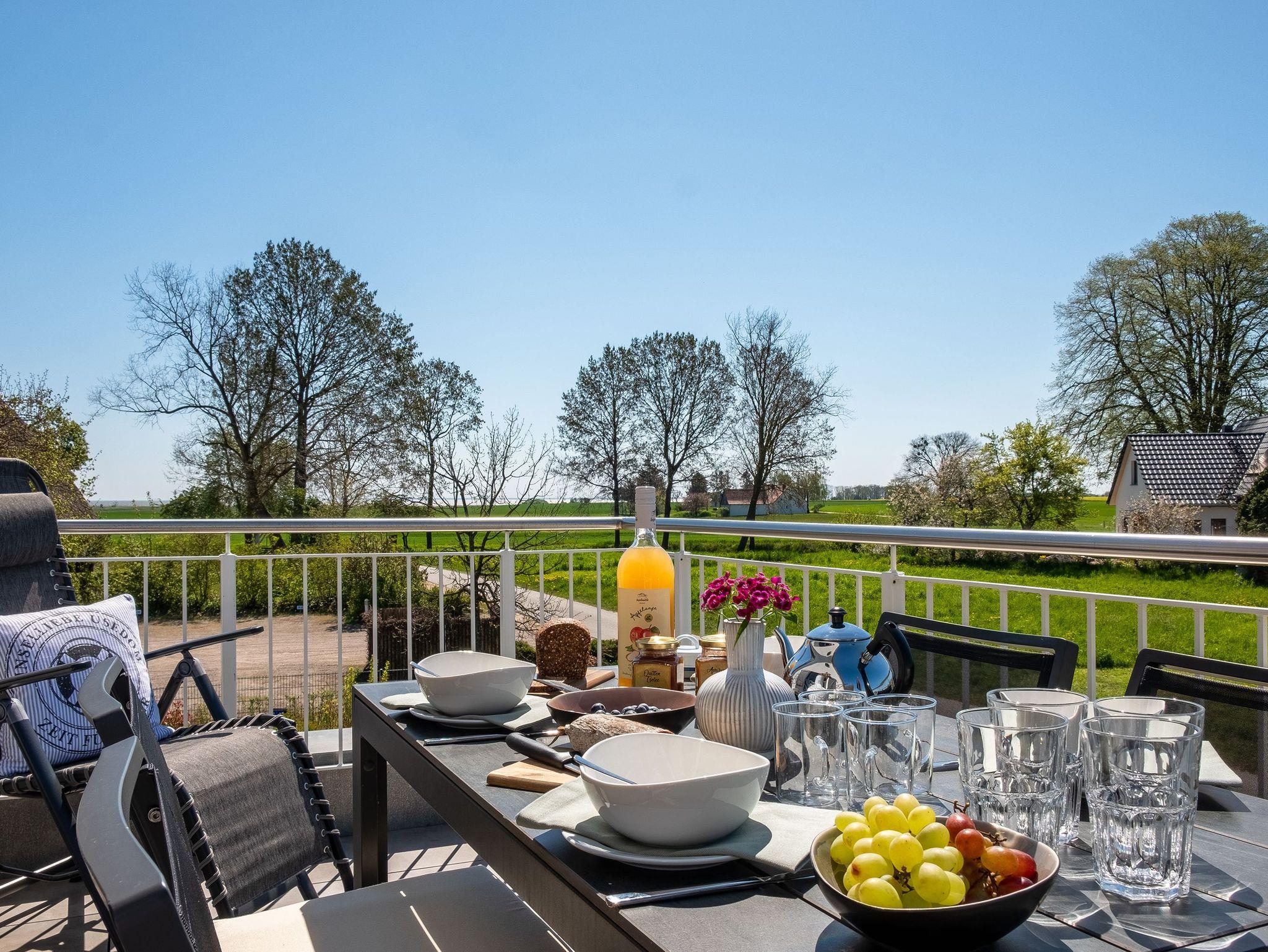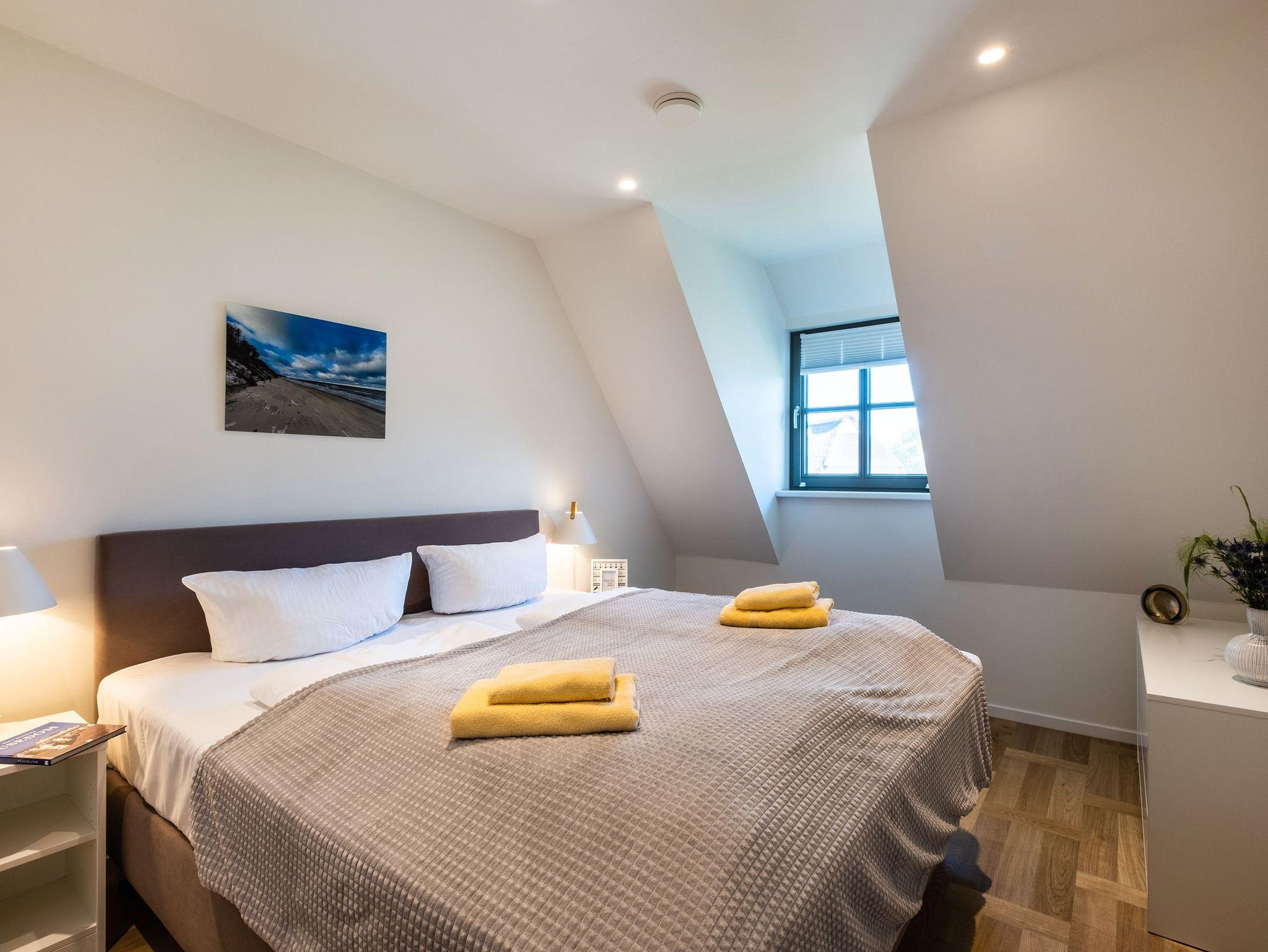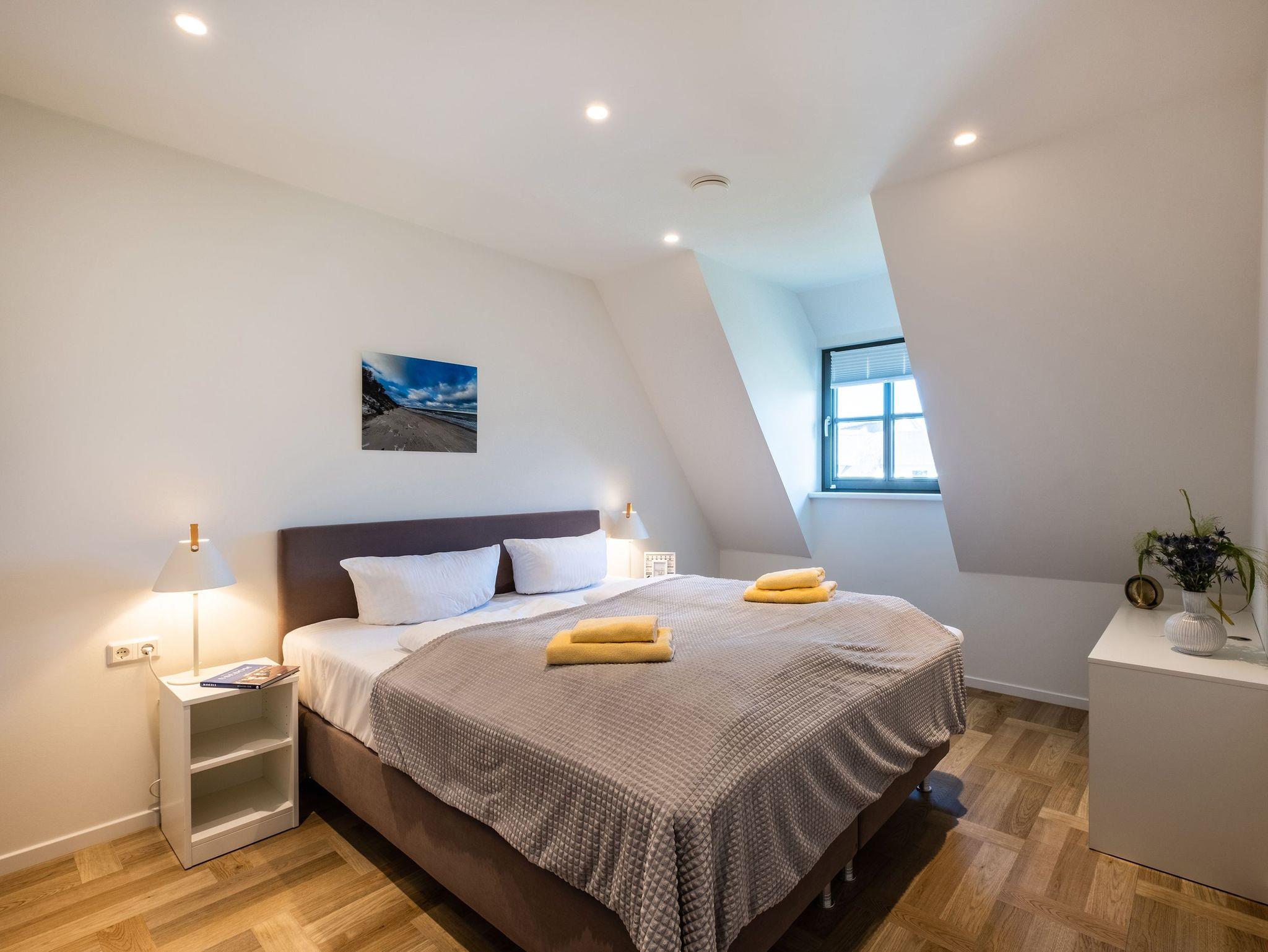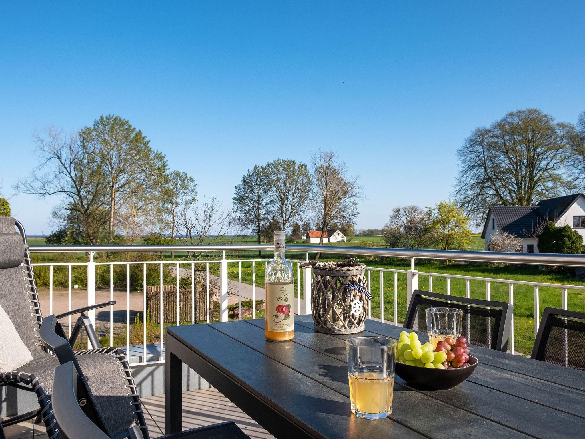Die moderne und helle Ferienwohnung ist hochwertig ausgestattet. Sie verfügt über eine komplett eingerichtete Einbauküche mit Spülmaschine, Mikrowelle, Induktionsherd und großem Kühlraum mit separatem Gefrierabteil sowie Kaffeemaschine, Wasserkocher und Toaster. Ebenfalls verfügt die Wohnung über eine Waschmaschine. Der Wohnraum ist durch die ca. vier Meter hohe offene Decke geprägt und die fast 12m² große Dachterrasse bietet einen weiten Blick über die Felder, auf das Haff und Wasser. Das große Tageslichtbad ist mit einer bodentiefen Dusche mit Glasabtrennung ausgestattet. Das Hauptschlafzimmer verfügt über ein Doppelbett und das zweite Schlafzimmer über zwei Einzelbetten. Bei allen Betten handelt es sich um Boxspringbetten. Im Wohnzimmer, sowie in einem Schlafzimmer befinden sich jeweils ein Flachbildfernseher.
