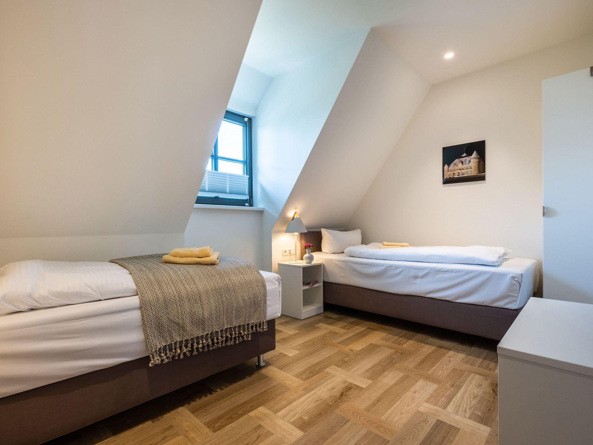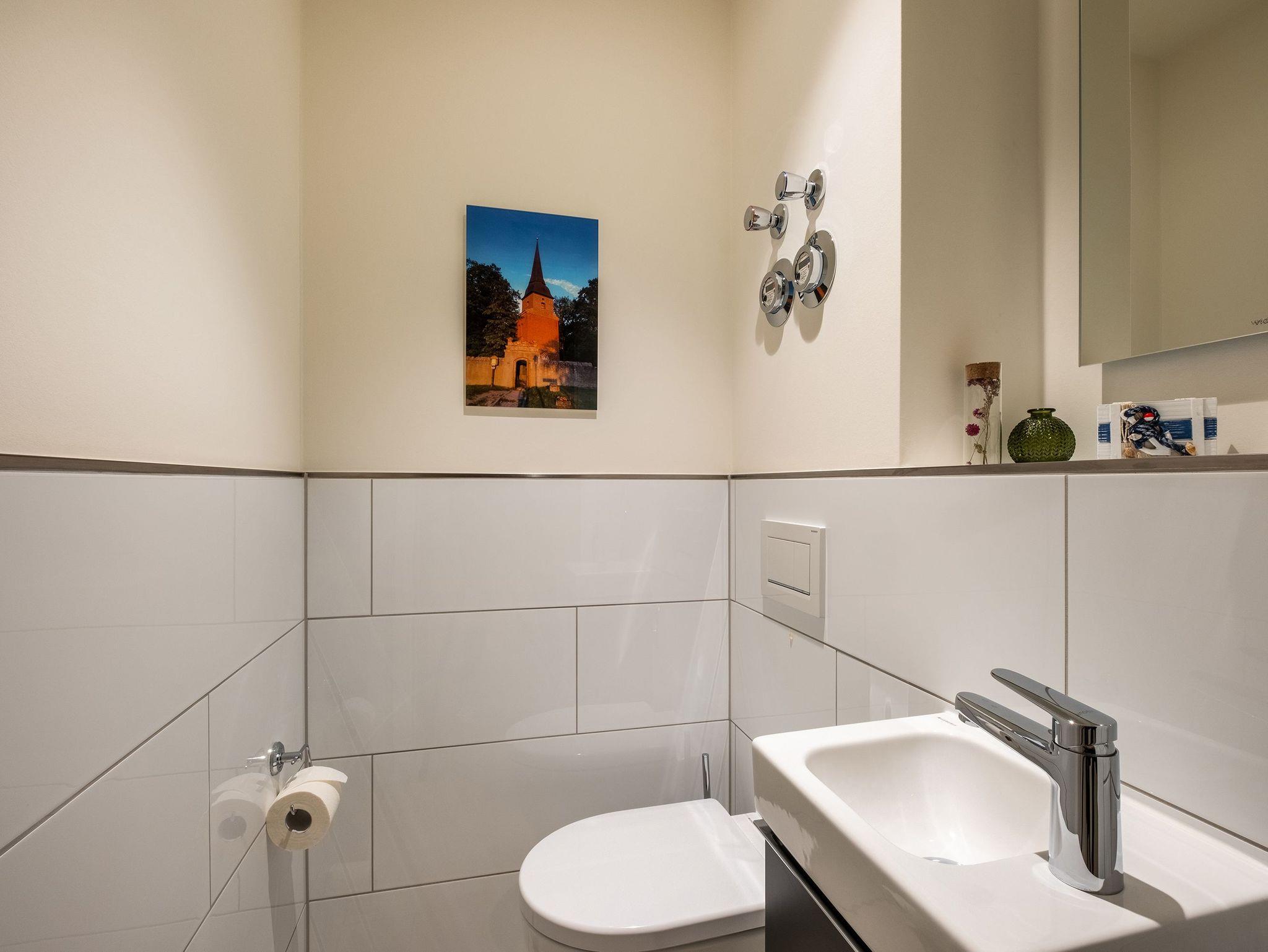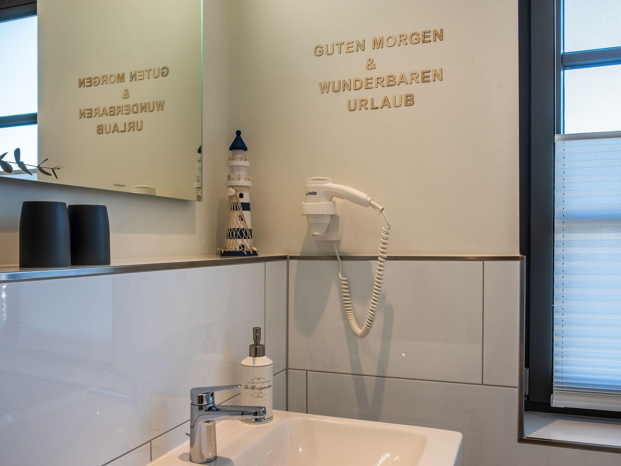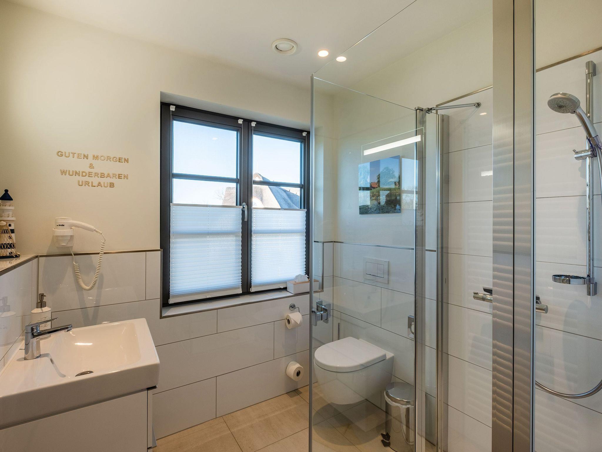 Die moderne und helle Ferienwohnung ist hochwertig ausgestattet. Sie verfügt über eine komplett eingerichtete Einbauküche mit Spülmaschine, Mikrowelle, Induktionsherd und großem Kühlraum mit separatem Gefrierabteil sowie Kaffeemaschine, Wasserkocher und Toaster. Ebenfalls verfügt die Wohnung über eine Waschmaschine. Der Wohnraum ist durch die ca. vier Meter hohe offene Decke geprägt und die fast 12m² große Dachterrasse bietet einen weiten Blick über die Felder, auf das Haff und Wasser. Das große Tageslichtbad ist mit einer bodentiefen Dusche mit Glasabtrennung ausgestattet. Das Hauptschlafzimmer verfügt über ein Doppelbett und das zweite Schlafzimmer über zwei Einzelbetten. Bei allen Betten handelt es sich um Boxspringbetten. Im Wohnzimmer, sowie in einem Schlafzimmer befinden sich jeweils ein Flachbildfernseher.