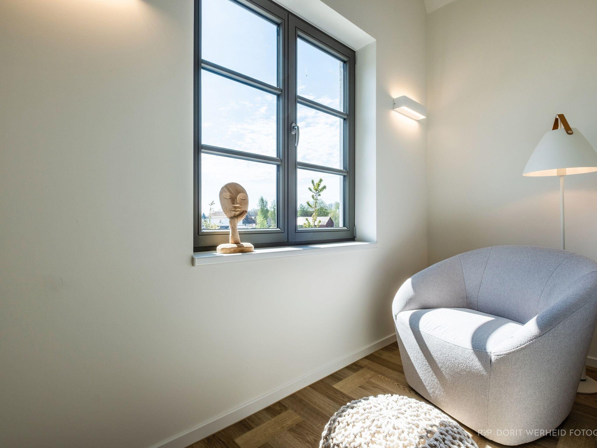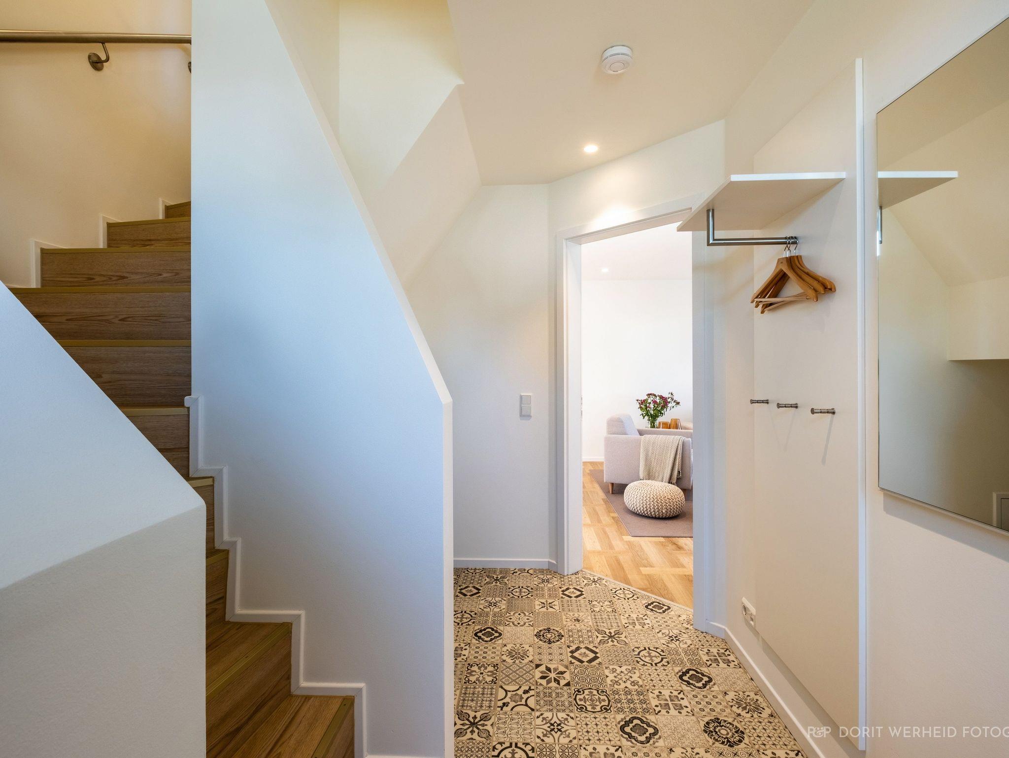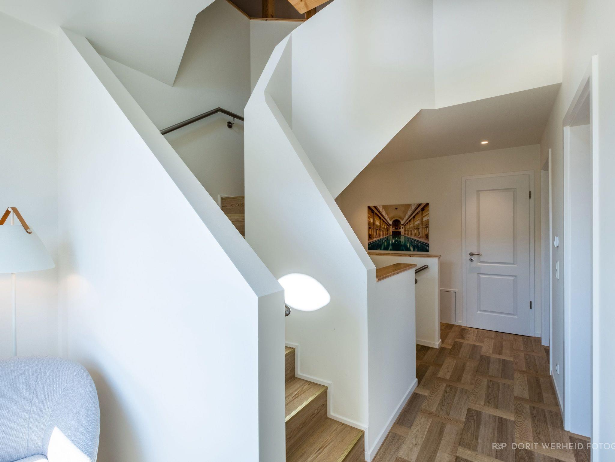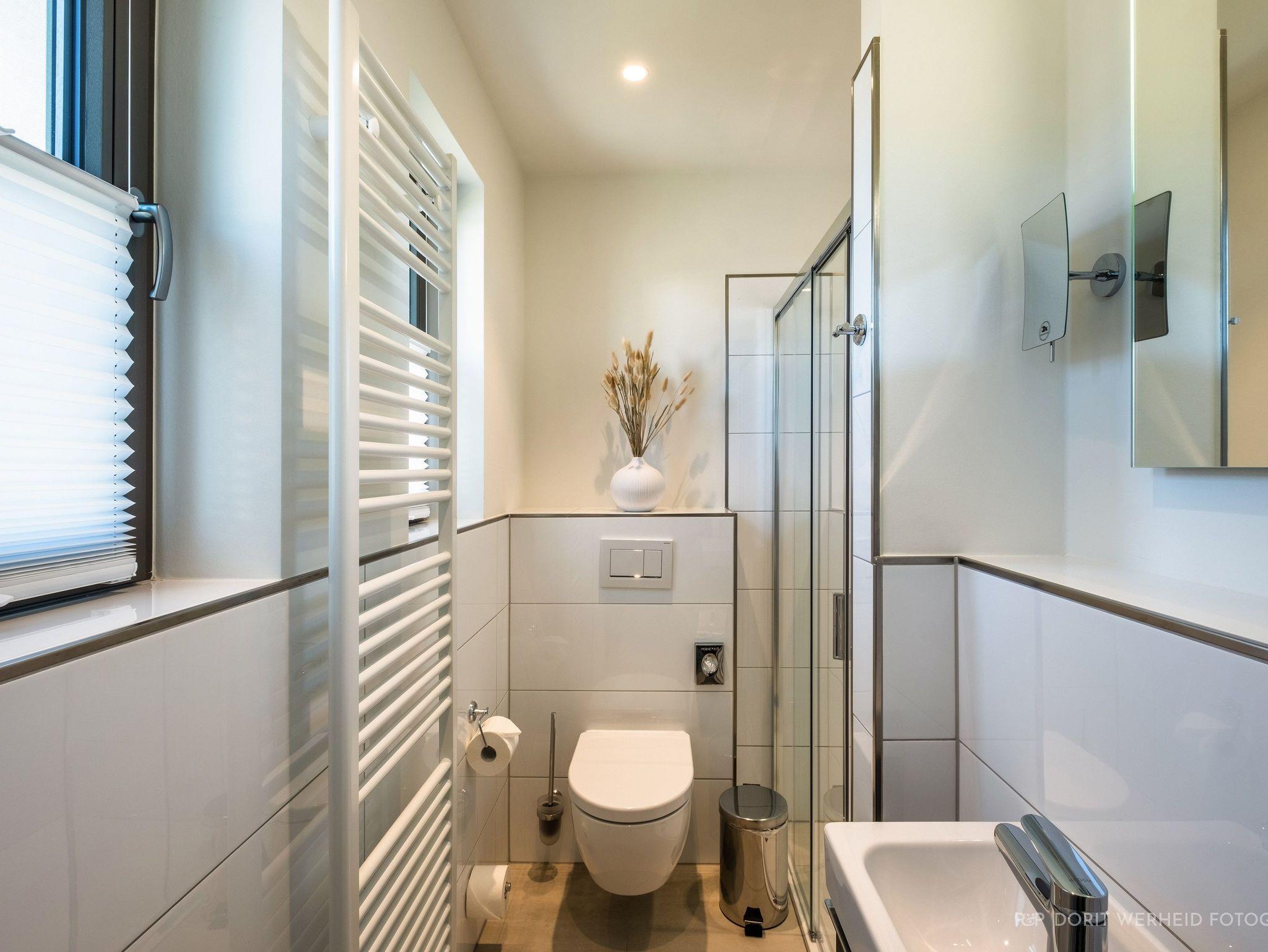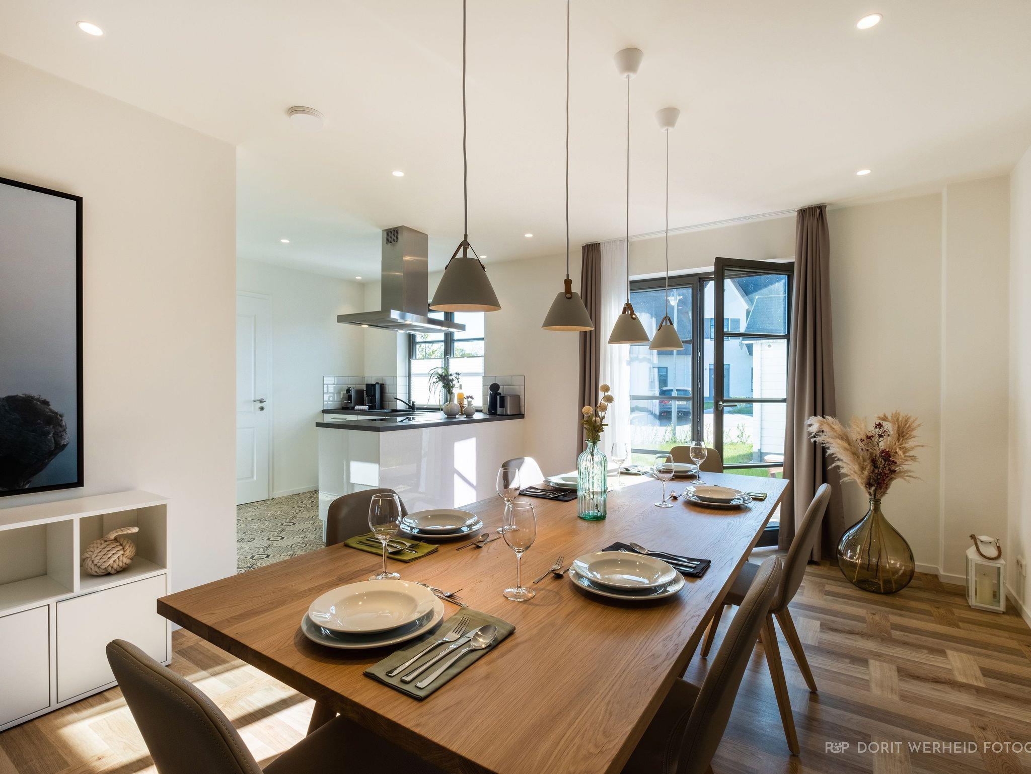 Der großzügige helle Wohnraum lädt zum Verweilen ein. Hier findest du ein bequemes Sofa mit Sesseln, ein Flachbild-TV für entspannte Abende und einen Esstisch, der Platz für bis zu 6 Personen bietet, perfekt für gemeinsame Mahlzeiten und gesellige Stunden. Die moderne Küche ist offen gestaltet und verfügt über ein Induktionskochfeld, Backofen, einen Kombi-Gefrierschrank, eine Spülmaschine, Nespresso Kapselmaschine, Filtermaschine, Mikrowelle, Wasserkocher und Toaster. Ein Schlafzimmer befindet sich ebenfalls im Erdgeschoss mit einen Boxspringbett. Gegenüber befindet sich das kleine Badezimmer mit Waschbecken, WC und bodentiefer Dusche.