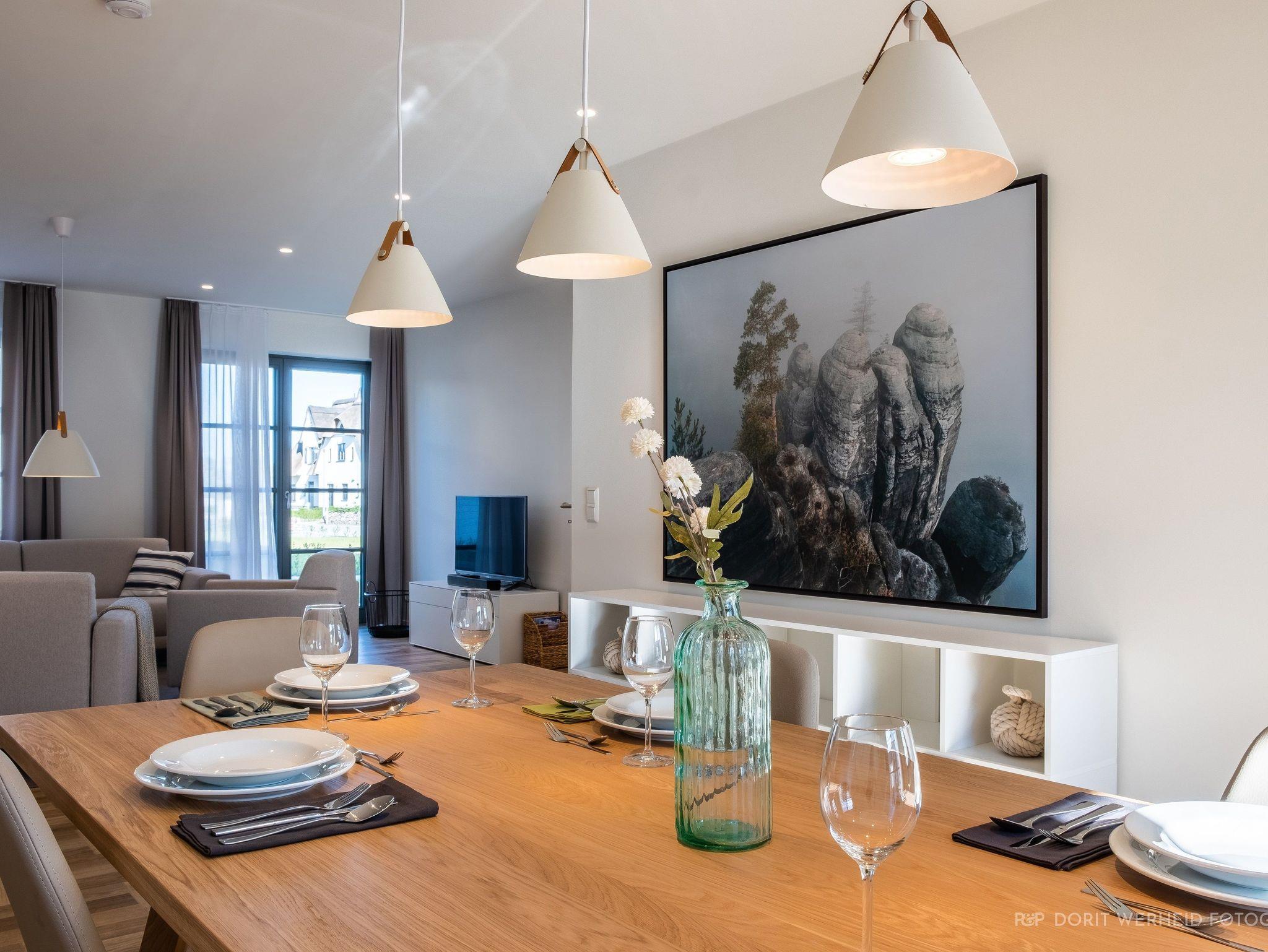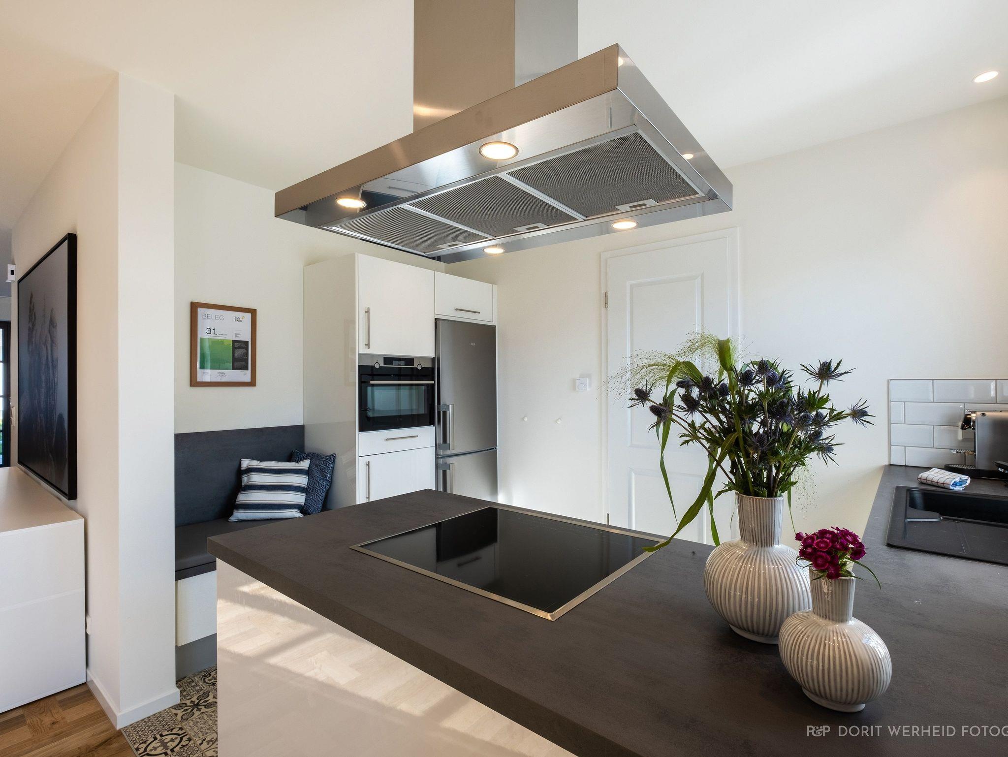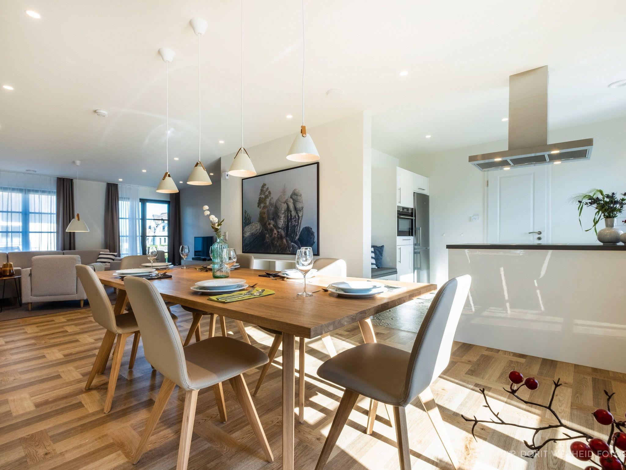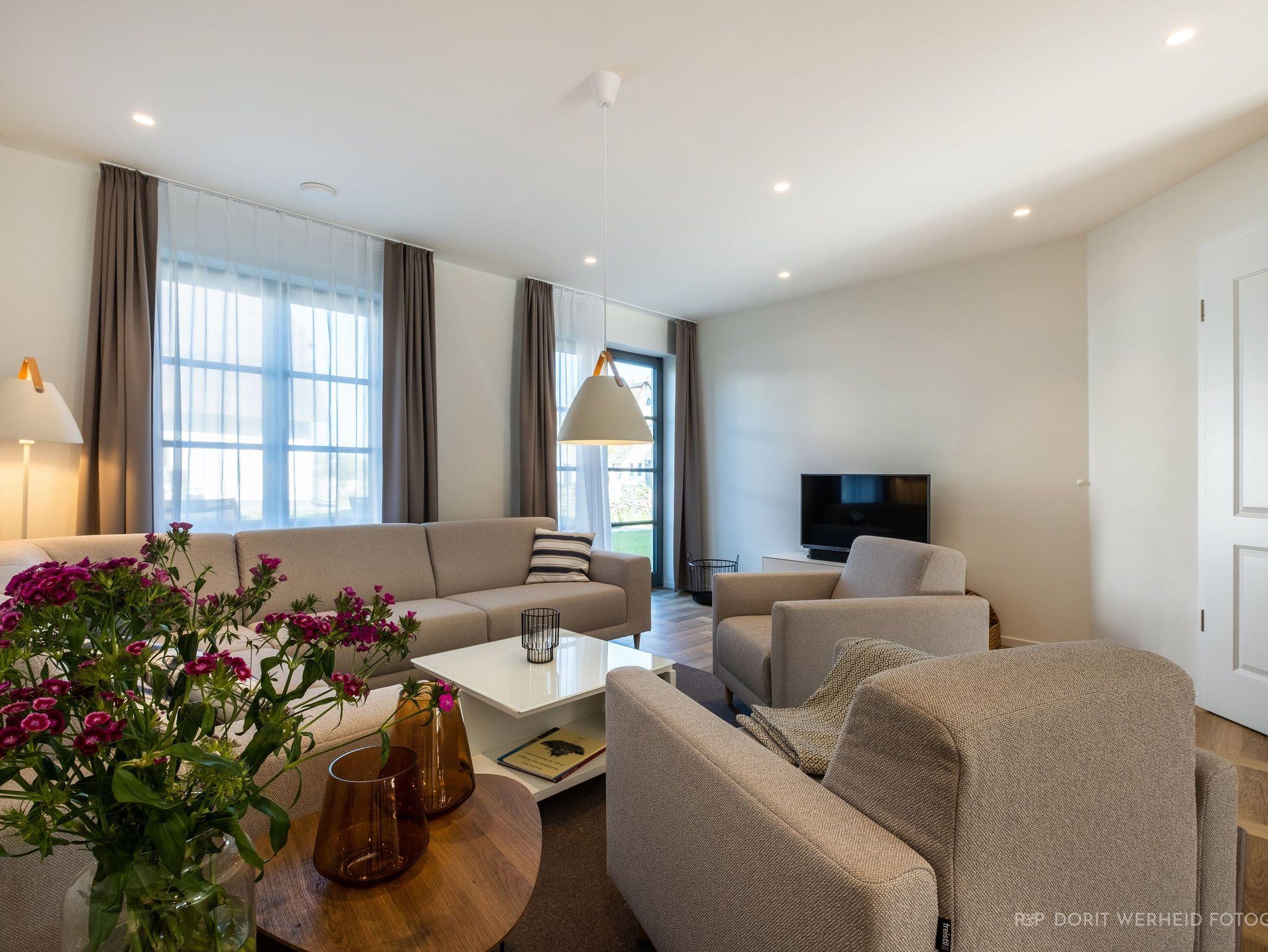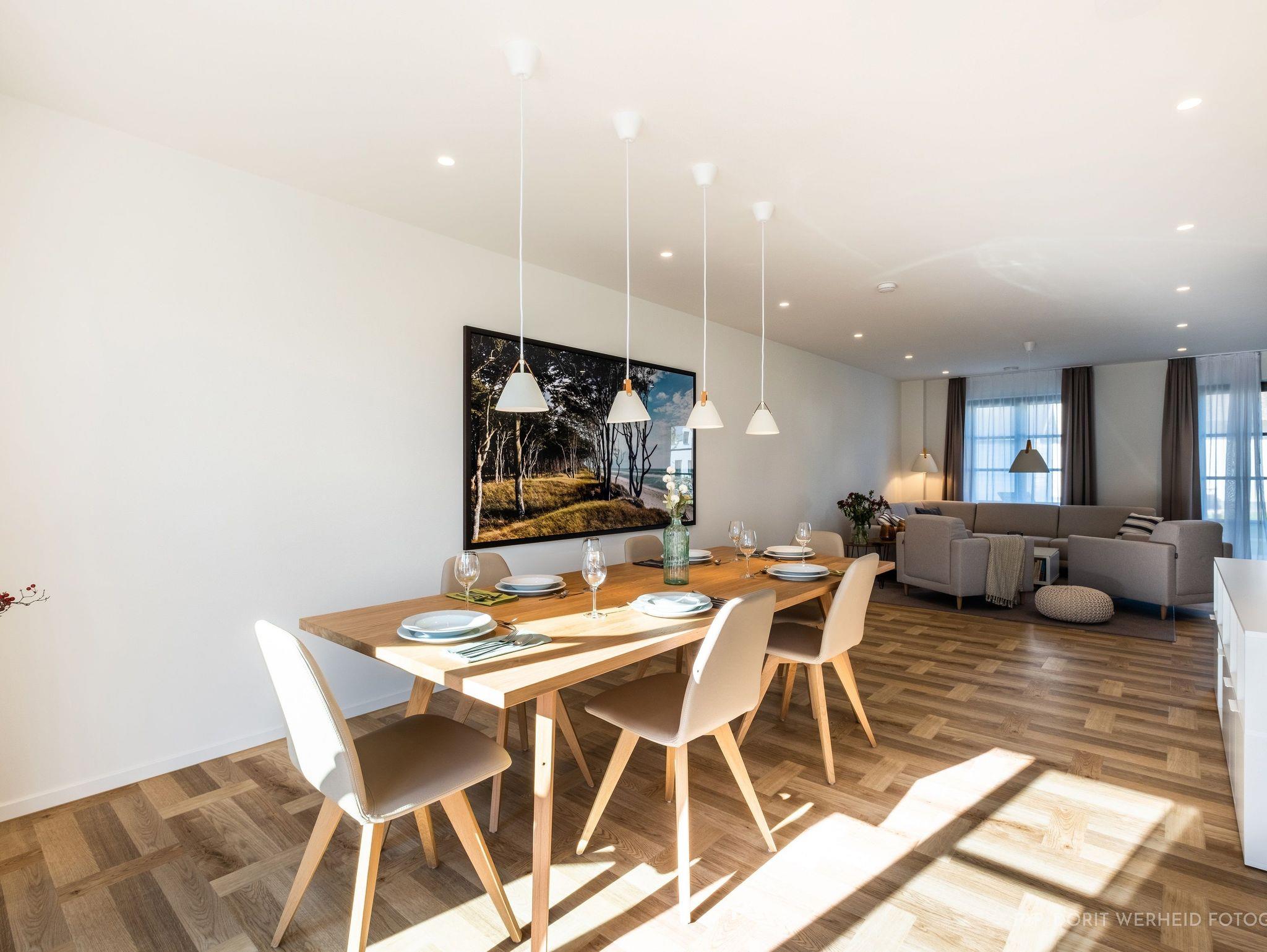 Der großzügige helle Wohnraum lädt zum Verweilen ein. Hier findest du ein bequemes Sofa mit Sesseln, ein Flachbild-TV für entspannte Abende und einen Esstisch, der Platz für bis zu 6 Personen bietet, perfekt für gemeinsame Mahlzeiten und gesellige Stunden. Die moderne Küche ist offen gestaltet und verfügt über ein Induktionskochfeld, Backofen, einen Kombi-Gefrierschrank, eine Spülmaschine, Nespresso Kapselmaschine, Filtermaschine, Mikrowelle, Wasserkocher und Toaster. Ein Schlafzimmer befindet sich ebenfalls im Erdgeschoss mit einen Boxspringbett. Gegenüber befindet sich das kleine Badezimmer mit Waschbecken, WC und bodentiefer Dusche.