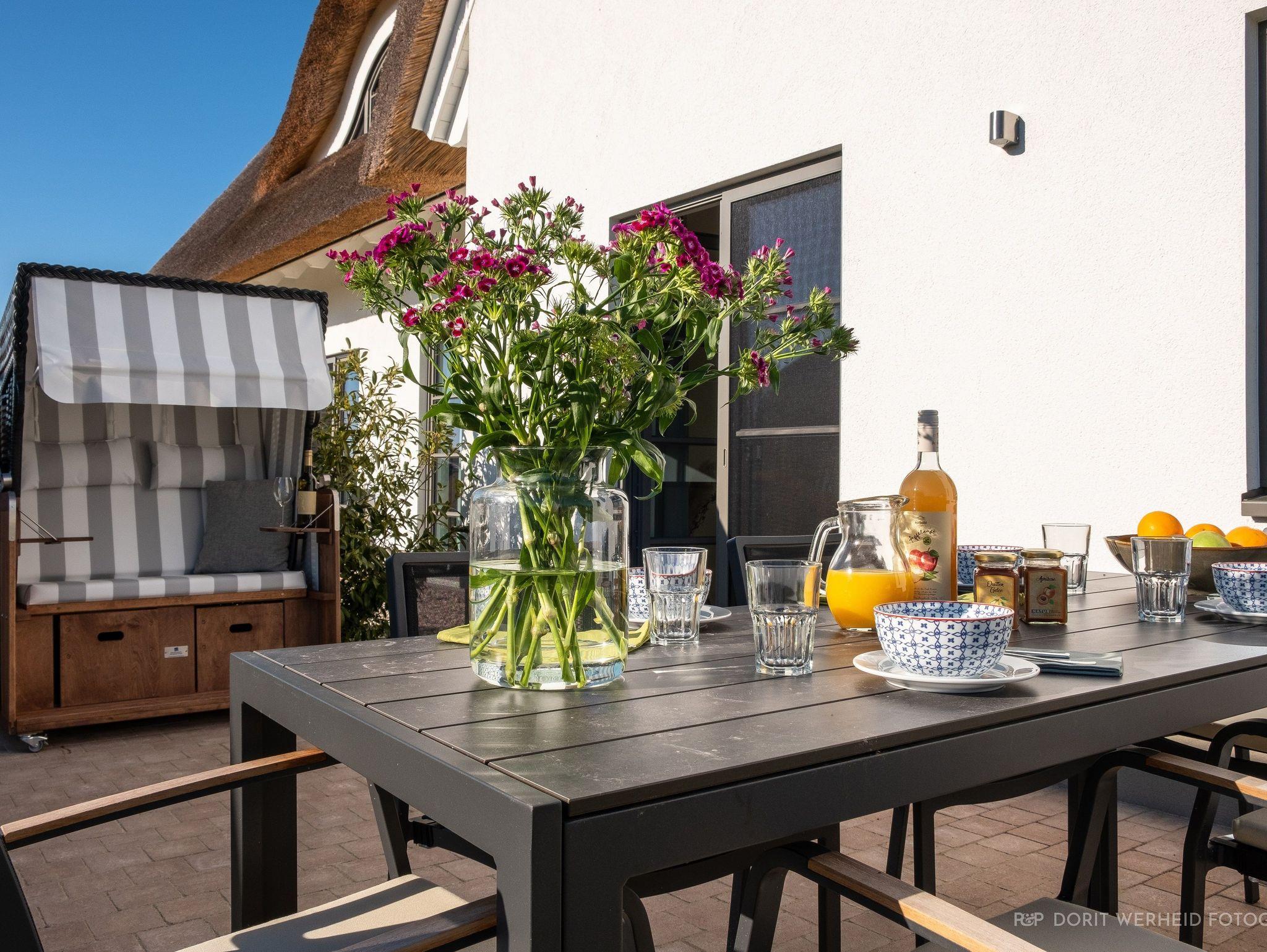 Vor dem Ferienhaus befinden sich zwei möblierte Terrassen, von denen Sie einen wunderschönen Blick auf die unberührte Natur von Usedom haben. Eine Terrasse verfügt sogar über einen hauseigenen Strandkorb.