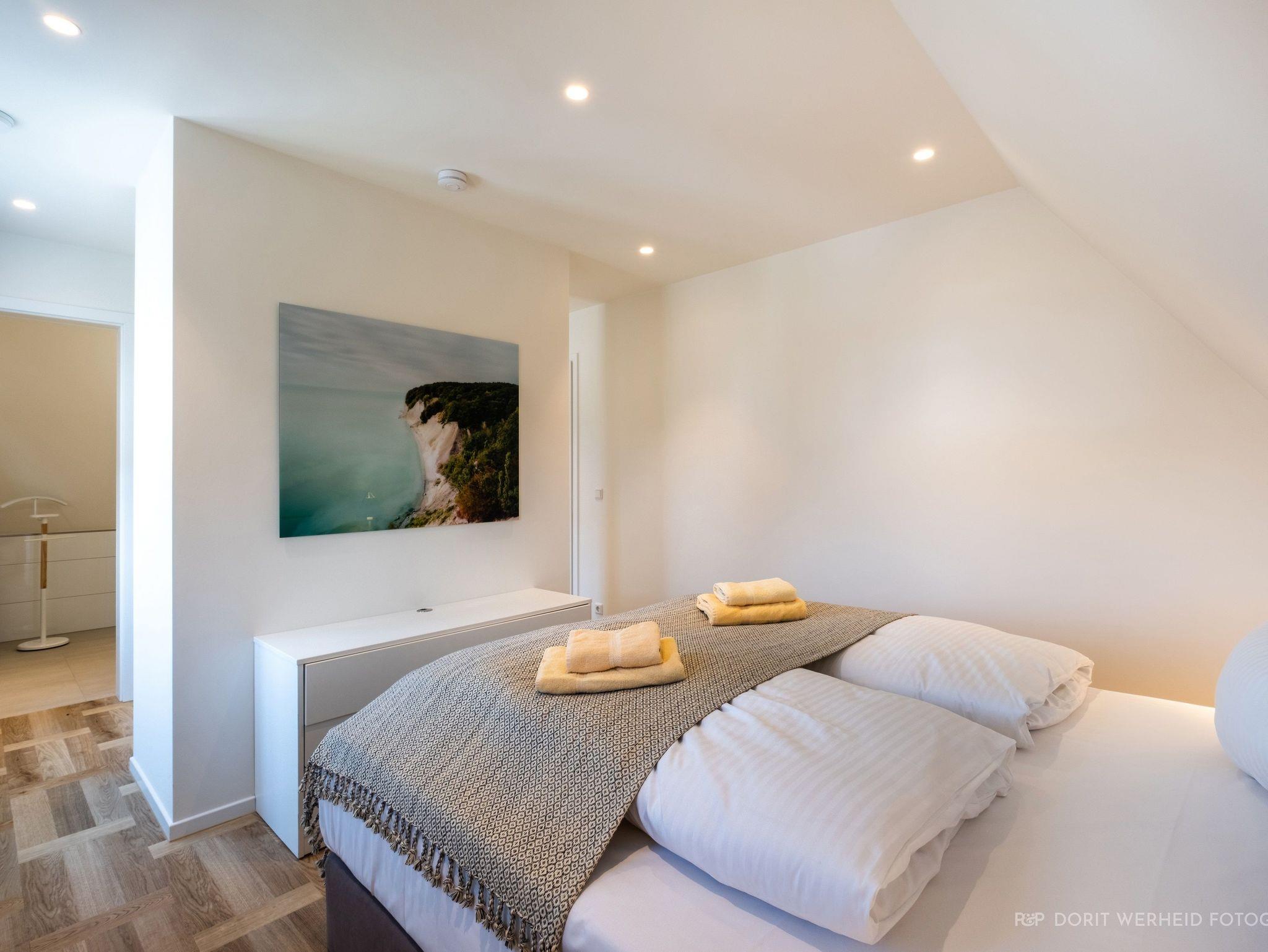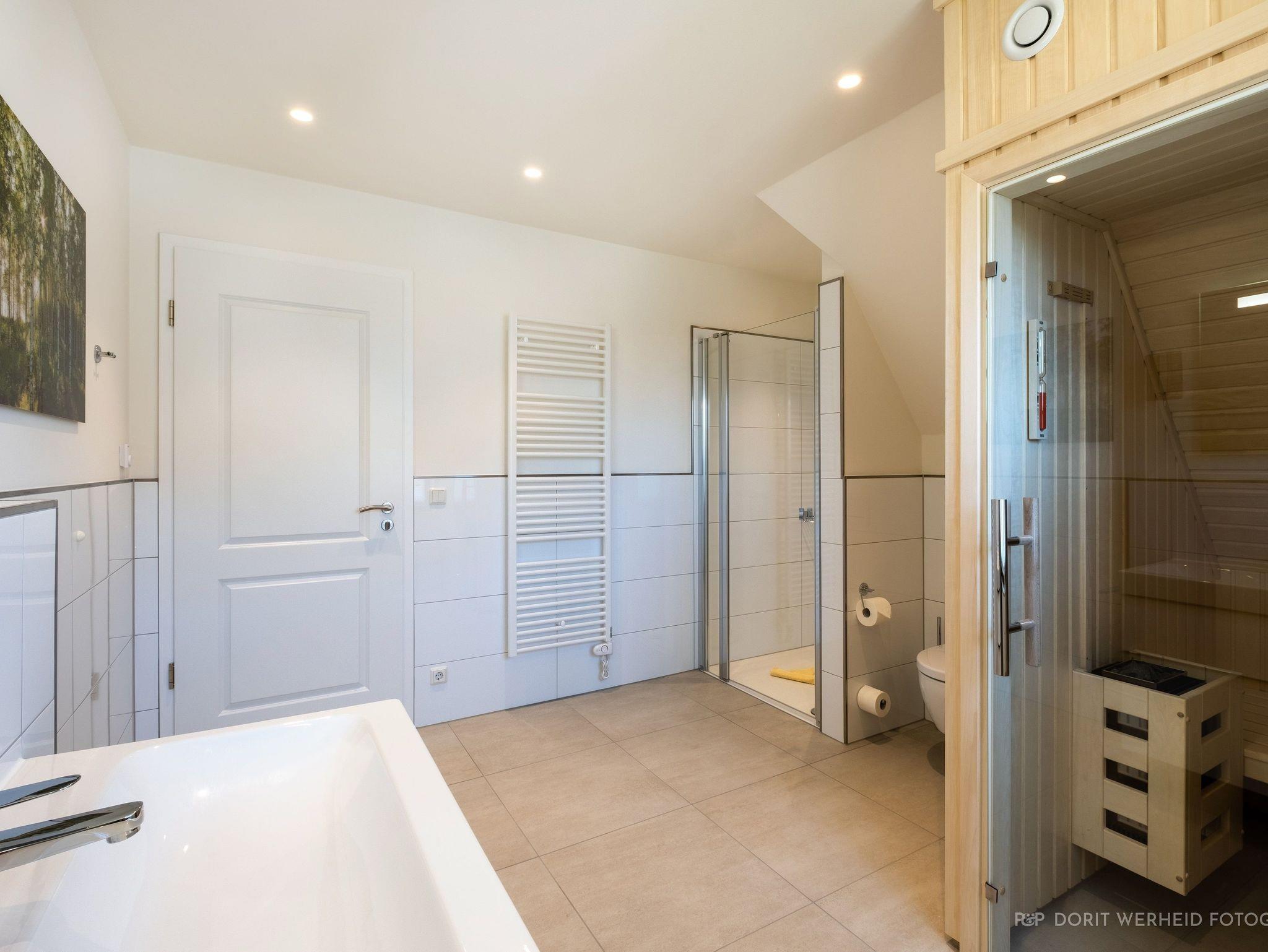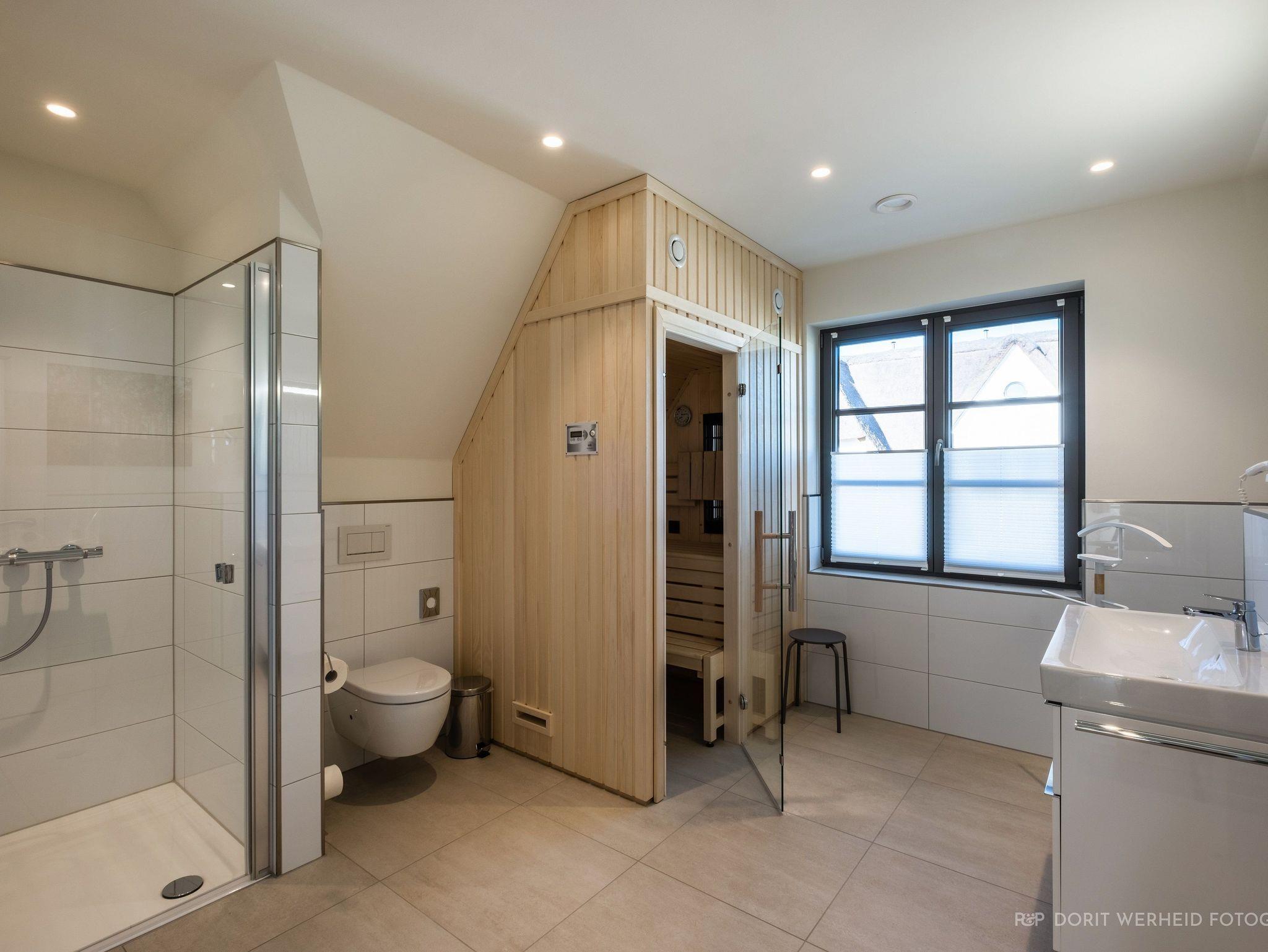 Im Obergeschoss befinden sich die zwei weiteren Schlafzimmer sowie zwei Bäder. Das Master- Schlafzimmer verfügt über ein Boxspringbett und über ein Badezimmer en Suite mit Waschbecken, WC, bodentiefer Dusche und Haartrockner. Das andere Badezimmer verfügt ebenfalls über ein Boxspringbett. Das weitere Badezimmer ist mit einer ebenerdigen Dusche, WC und Waschbecken ausgestattet. Als besonderes Highlight befindet sich hier Ihre hauseigene finnische Sauna mit Infrarot Kabine.