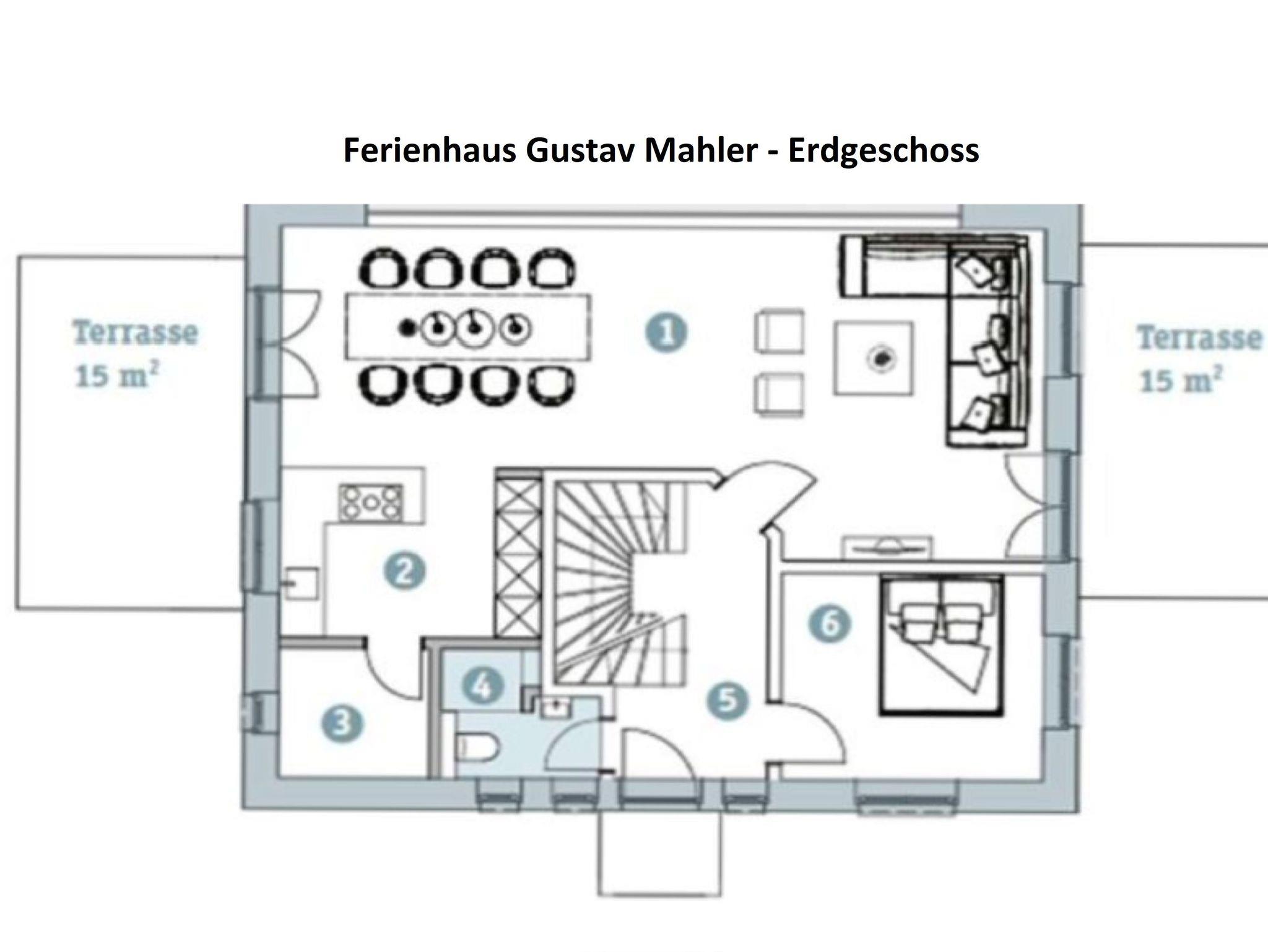 Willkommen im Ferienhaus Gustav Mahler! Das 172 m² große Ferienhaus auf 3 Etagen ist für max. 6 Erwachsene + 1 Kind (max. 3 Jahre) geeignet und stilvoll-modern ausgestattet. Es verfügt über eine Wohnküche mit angrenzenden Terrassen, 3 Schlafzimmer, 3 Badezimmer und einer finnischen Sauna mit Infrarot Kabine.
