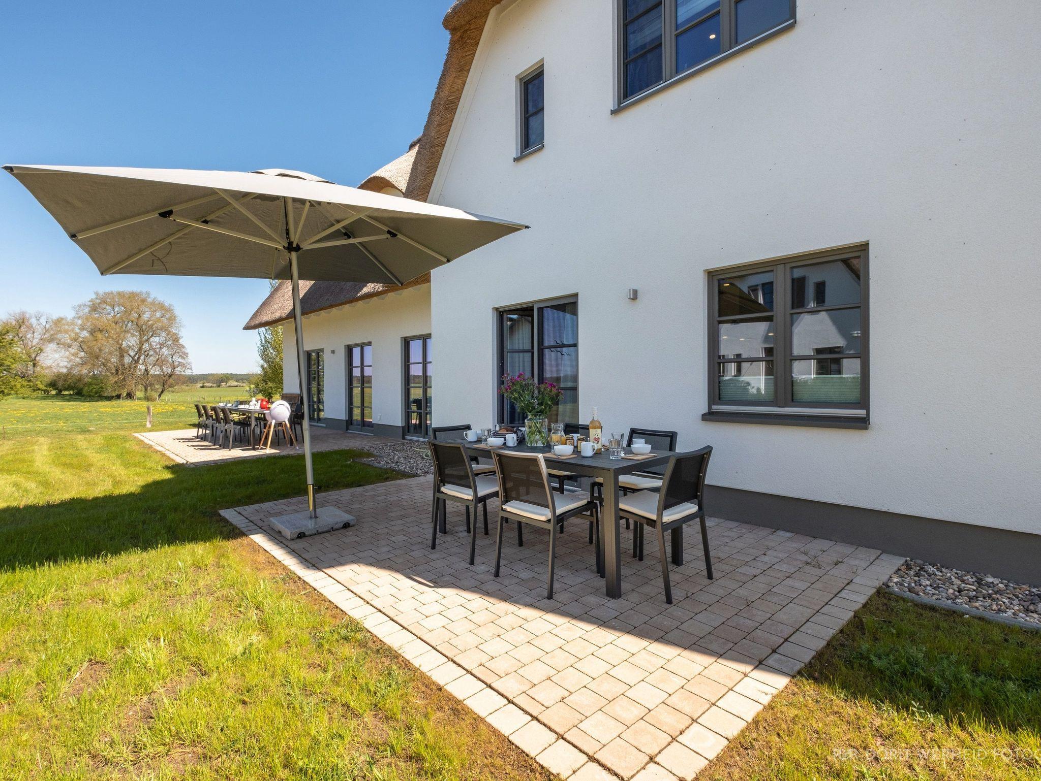 Modernes Ferienhaus Carl Reinecke 32 mit Sauna und Garten auf Usedom unter Reetdach.