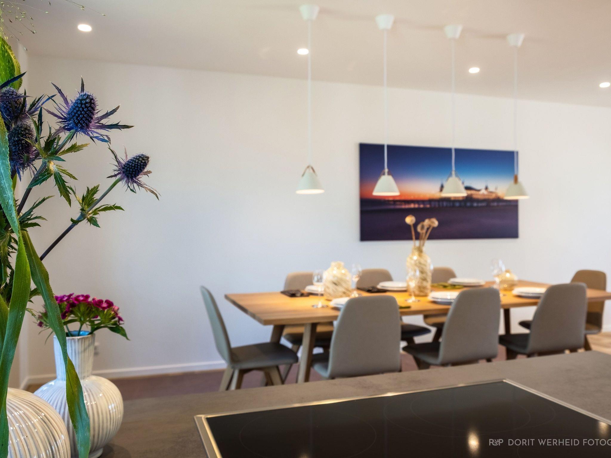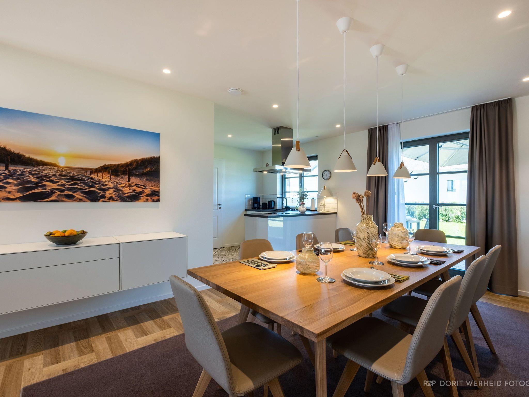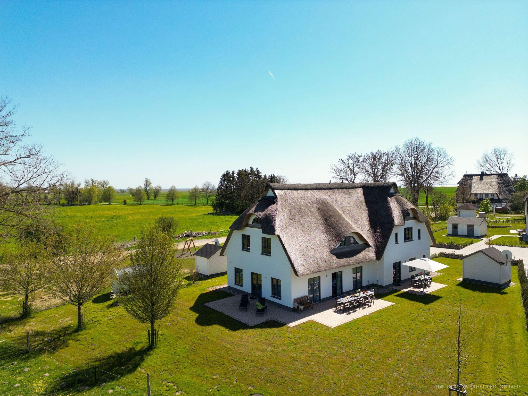 Das sehr hochwertig ausgestattete Ferienhaus verfügt über eine komplette eingerichtete Einbauküche mit Spülmaschine, Mikrowelle, Induktionsherd, großem Kühlschrank mit separatem Gefrierabteil und Kaffeemaschine sowie Wasserkocher und Toaster. Ebenfalls verfügt das Haus über eine Waschmaschine und einen Wäschetrockner. Der Wohnraum bietet durch die großzügige Verglasung einen weiten Blick über die Felder und das Haff. Es gibt zwei Terrassen (30m²) und einen großen Garten. Die drei großen Bäder verfügen jeweils über eine bodentiefe Dusche mit Glastrennung. Eines der Bäder ist zusätzlich mit einer Kombisauna (Ofen und Infrarot) ausgestattet.