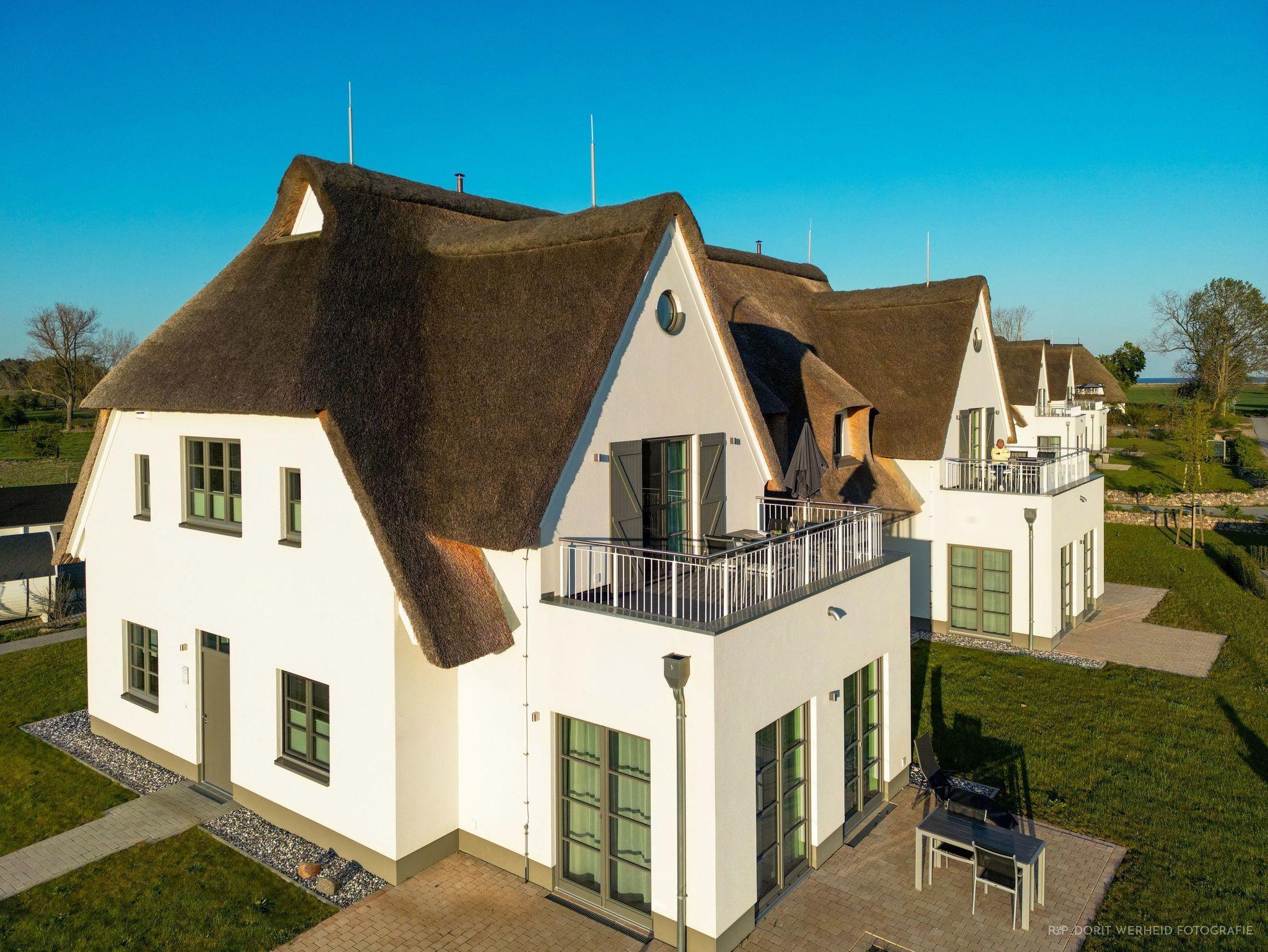Erleben Sie nachhaltigen Komfort und Panoramablick in diesem Reetdach-Apartment auf Usedom mit Sauna und Balkon.
