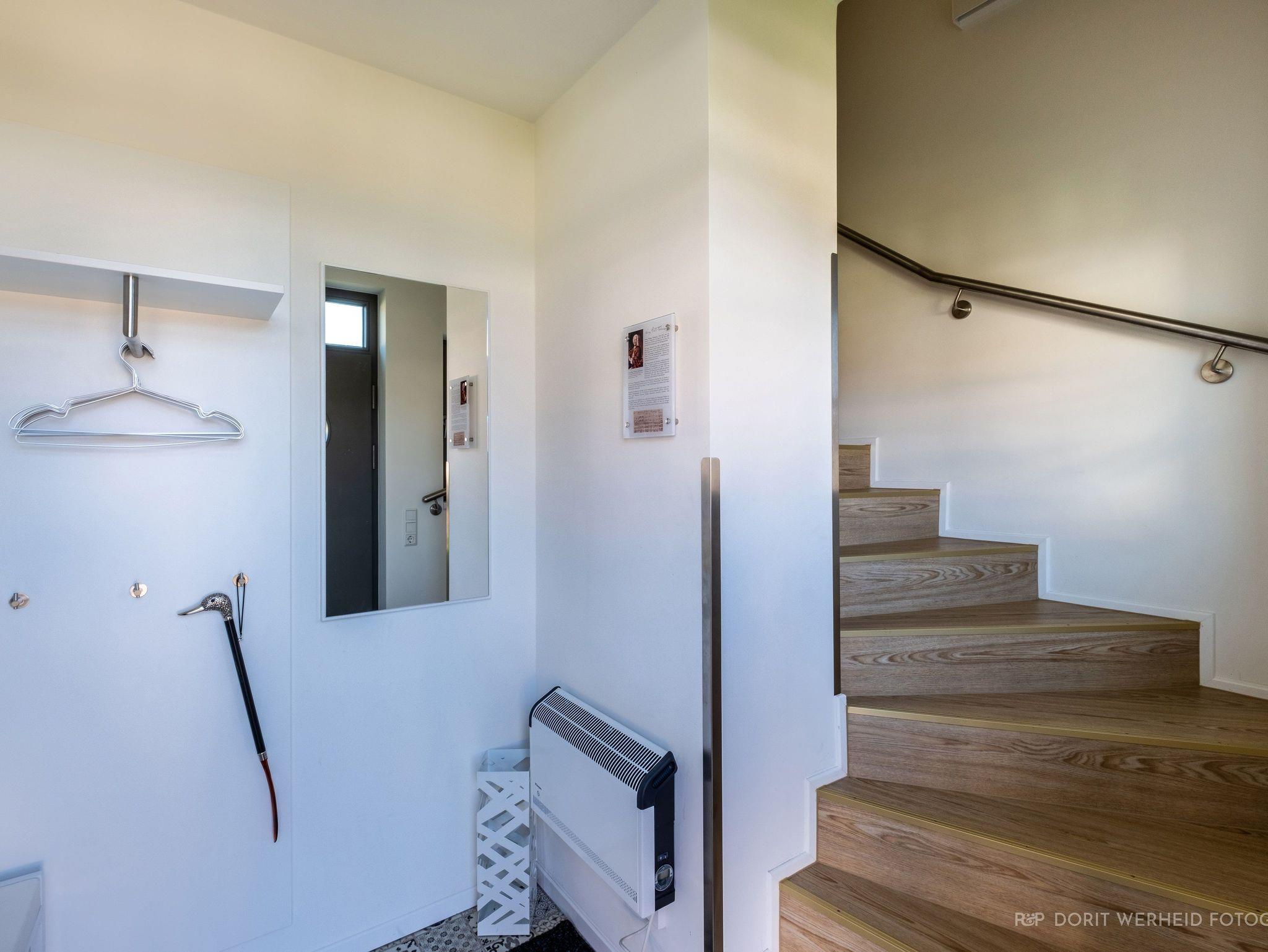 Die Wohnung hat W-LAN und LAN und ist hochwertig ausgestattet. Sie verfügt über eine komplett eingerichtete Einbauküche mit Spülmaschine, Mikrowelle, Toaster, Kaffeemaschine, Wasserkocher, Induktionsherd und großem Kühlraum mit separatem Gefrierabteil. Ebenfalls verfügt die Wohnung über eine Waschmaschine. Der Wohnraum ist durch die ca. vier Meter hohe offene Decke geprägt und die fast 12 qm große Dachterrasse mit Elektrogrill bietet einen weiten Blick über die Felder auf das Haff und das Wasser.