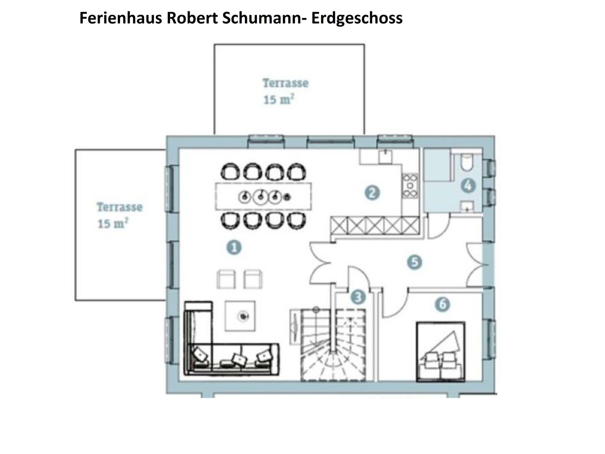 Willkommen im Ferienhaus Robert Schumann! Das 179 m² große Ferienhaus erstreckt sich auf 3 Etagen und ist für max. 7 Erwachsene + 2 Kinder von max. 3 Jahren geeignet und stilvoll-modern ausgestattet. Es verfügt über eine Wohnküche mit angrenzenden Terrassen, 4 Schlafzimmer und 3 Badezimmer.