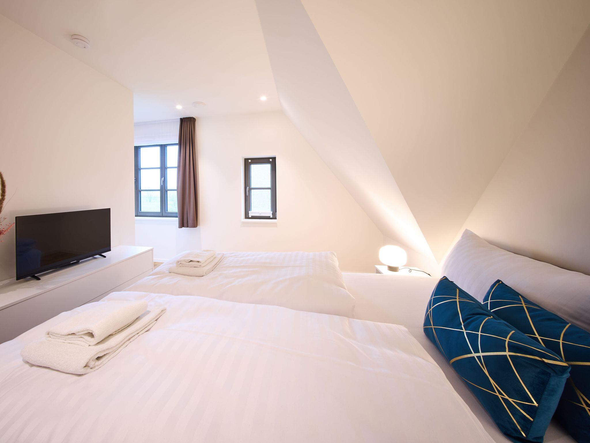 Im Obergeschoss befinden sich drei weitere Schlafzimmer sowie 2 weiter Badezimmer. Alle Schlafzimmer verfügen über ein Doppelbett (Boxspringbett 1x 1,80m & 2x 1,60m). Das Master- Schlafzimmer verfügt über einen zusätzlichen TV und über ein Badezimmer en Suite mit Waschbecken, WC, bodentiefer Dusche und Badewanne. Das andere Badezimmer verfügt ebenfalls über ein Waschbecken, WC, bodentiefe Dusche und zusätzlich über eine Waschmaschine. Ein Fön steht Ihnen ebenfalls zur Verfügung. Die Schlafzimmer sind zudem verdunkelbar.