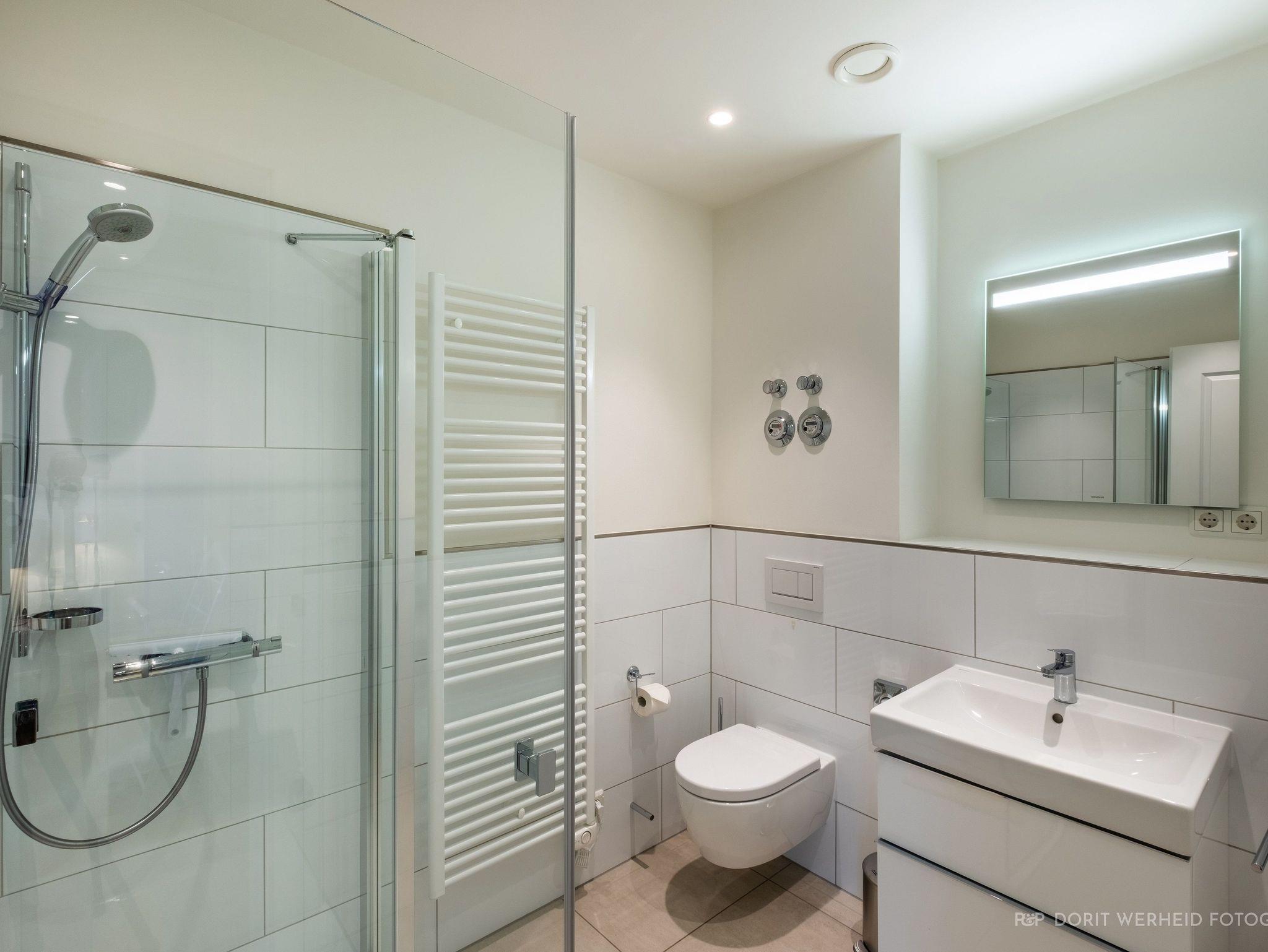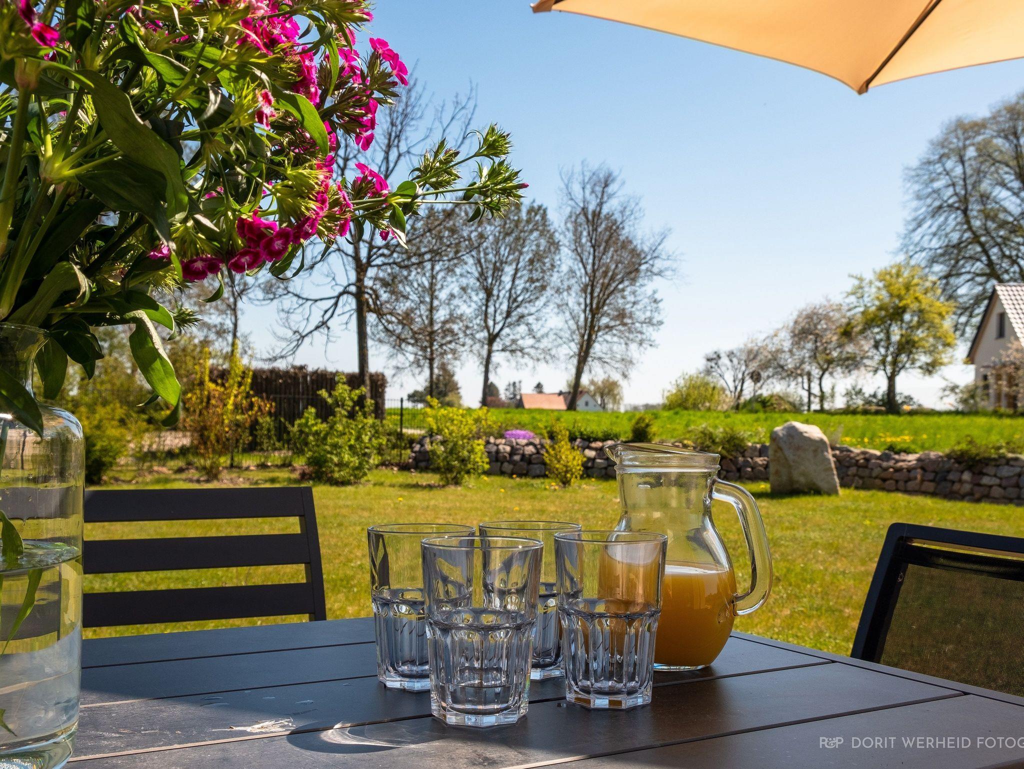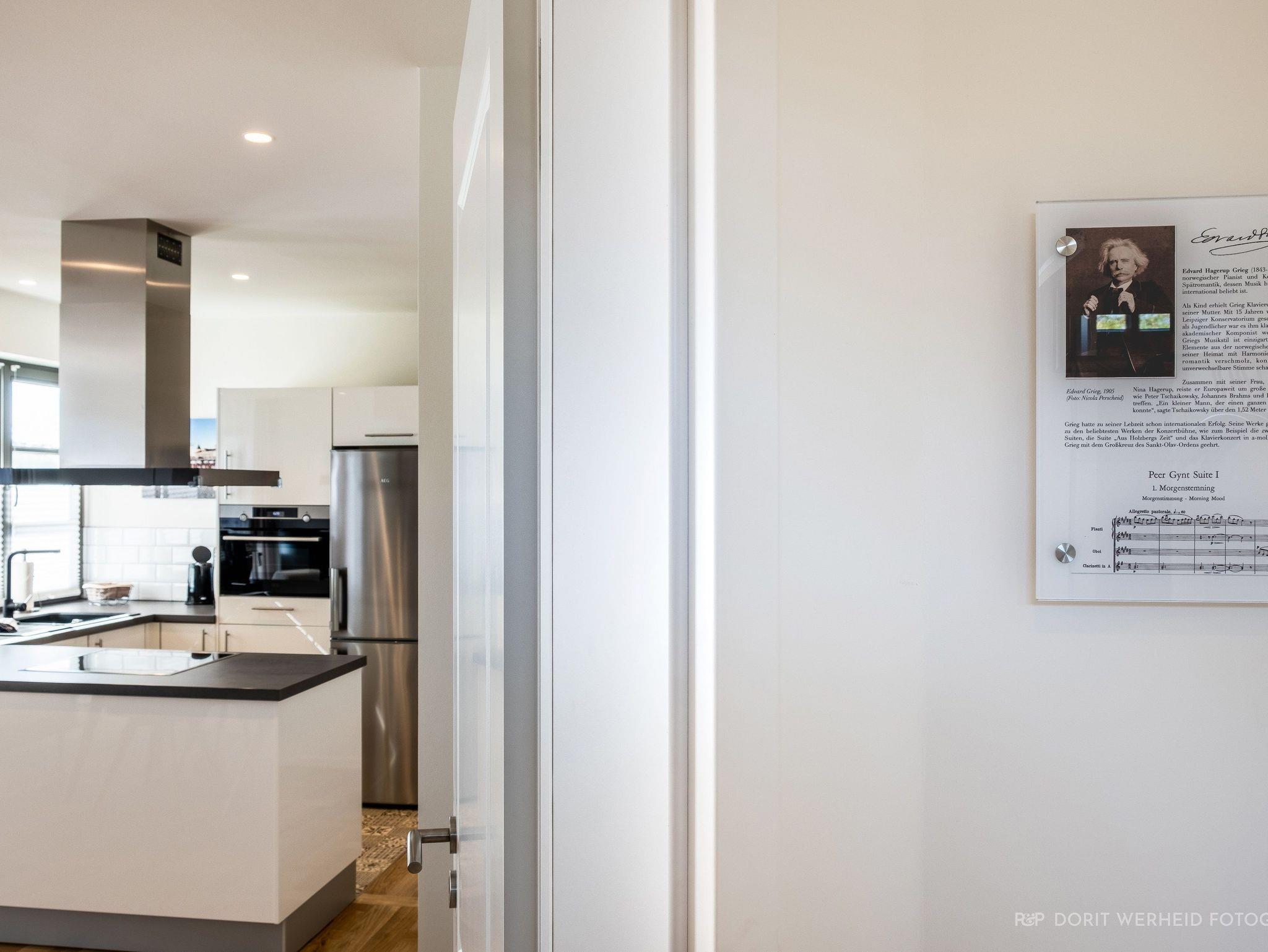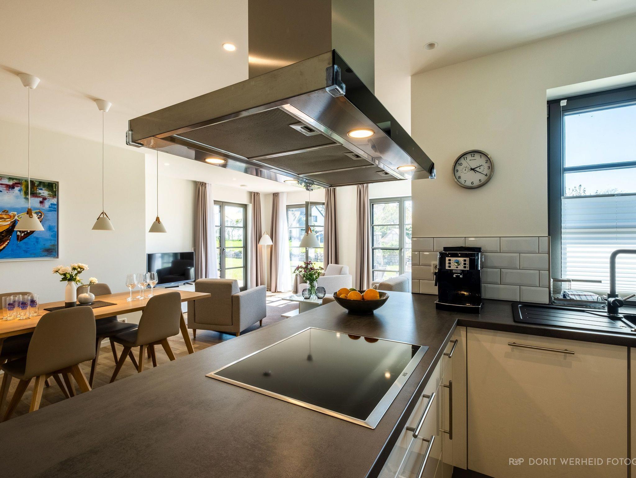 Die Wohnung ist sehr hochwertig ausgestattet. Sie verfügt über eine komplett eingerichtete Einbauküche mit Spülmaschine, Mikrowelle, Induktionsherd, großem Kühlschrank mit separatem Gefrierabteil und Kaffeevollautomat. Ebenfalls verfügt die Wohnung über eine Waschmaschine. Der Wohnraum bietet durch die großzügige Verglasung einen weiten Blick über die Felder und das Haff. Es gibt zwei Terrassen (30m²) und einen großen Garten, die nach Süden ausgerichtet sind. Zwei große Bäder sind mit einer bodentiefen Dusche mit Glastrennung ausgestattet.