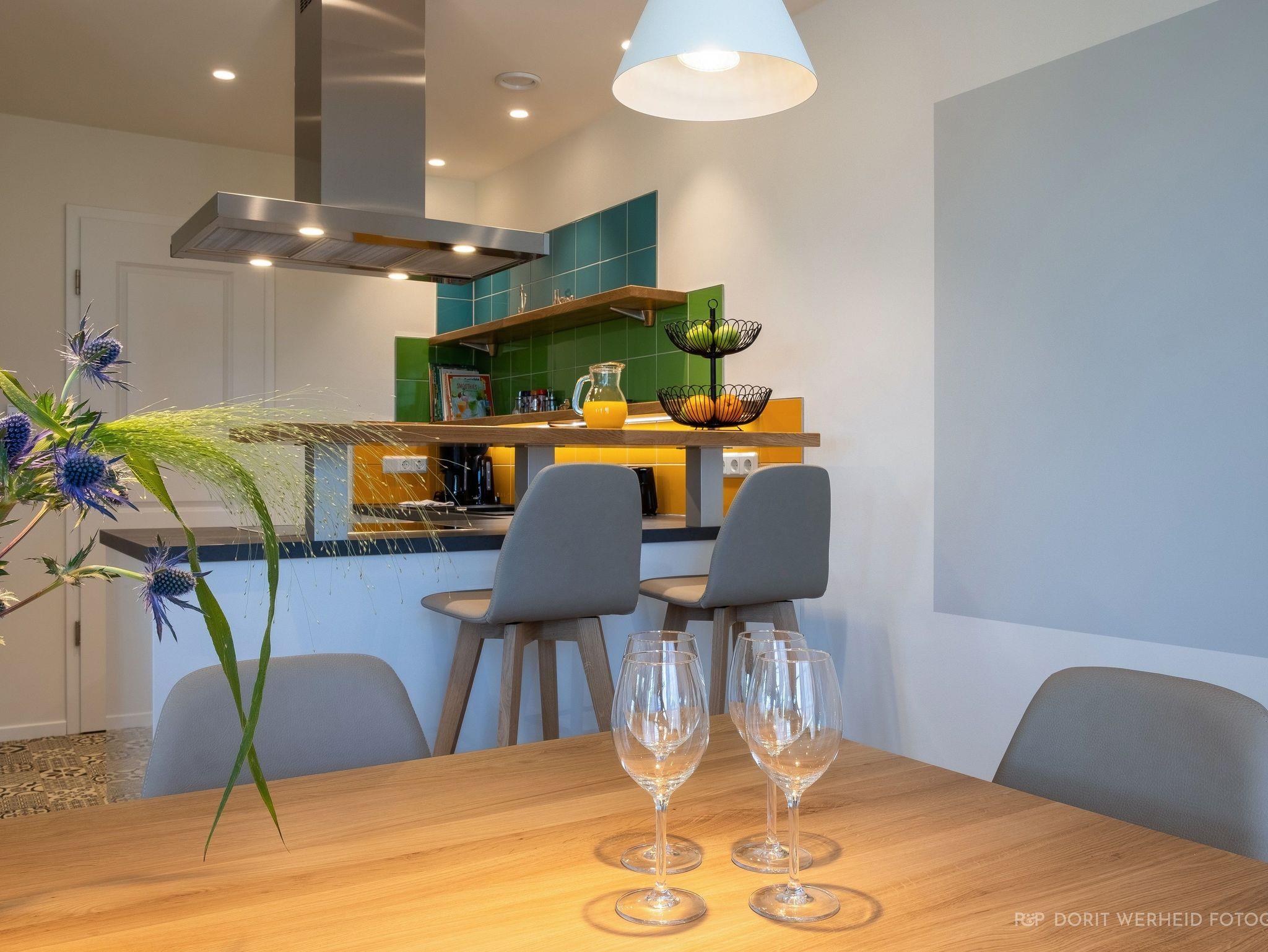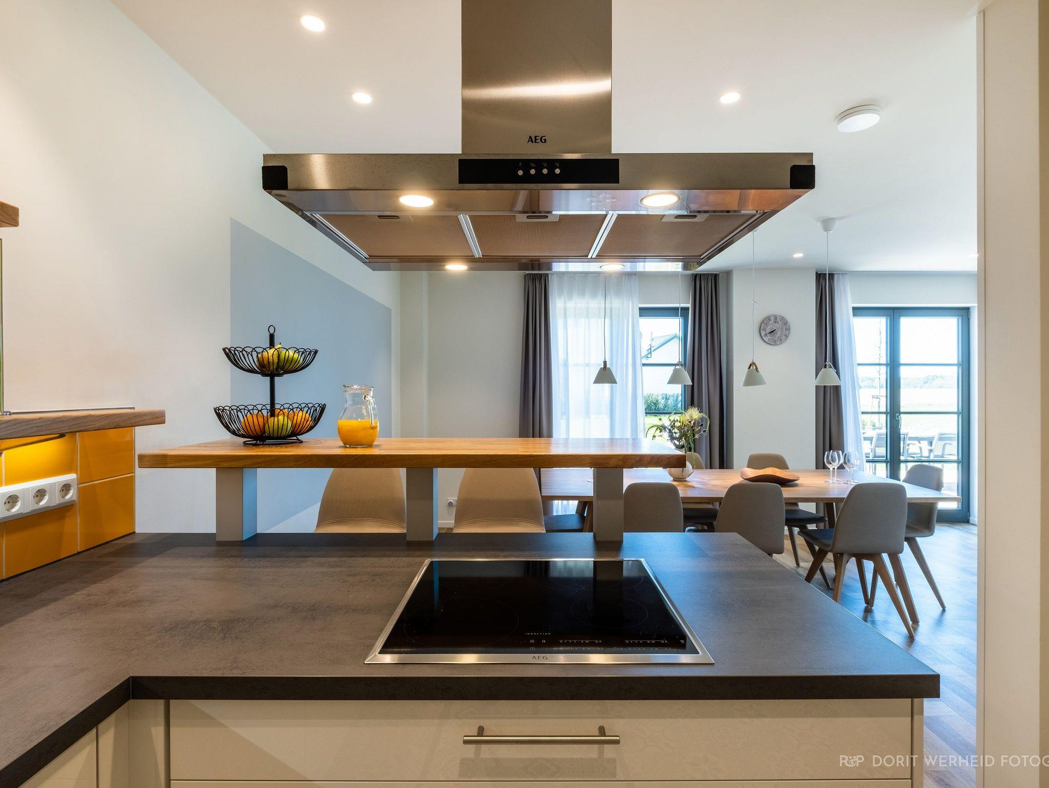 Der geräumige Wohn-Essbereich im Erdgeschoss bietet ausreichend Platz für gemeinsame Essen und gesellige Fernseh- oder Spielabende. Ihnen stehen Gesellschaftsspiele, DVDs und eine kleine Auswahl an Büchern zur Verfügung. Die Wohnküche mit Vollausstattung verfügt über alle Standardgeräte, wie Spülmaschine, Mikrowelle, Backofen, Induktionsherd, Kaffeemaschine, Wasserkocher und Toaster. Von diesem Bereich gelangen Sie direkt auf die beiden Terrassen mit herrlichem Blick ins Grüne. Für gemütliche Grillfeste auf der Terrasse steht ein elektrischer Kontaktgrill bereit. Im Garten steht Ihnen außerdem die Fasssauna (gegen Gebühr) zur Verfügung. Ebenfalls befindet sich ein Schlafzimmer mit einem Boxspringbett, TV und ein Badezimmer mit Waschbecken, WC und bodentiefer Dusche zur Verfügung.