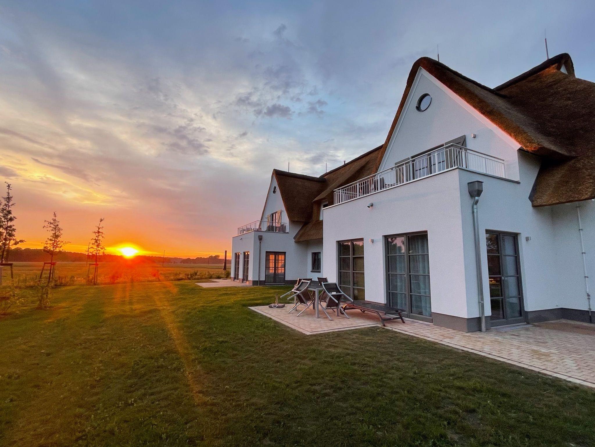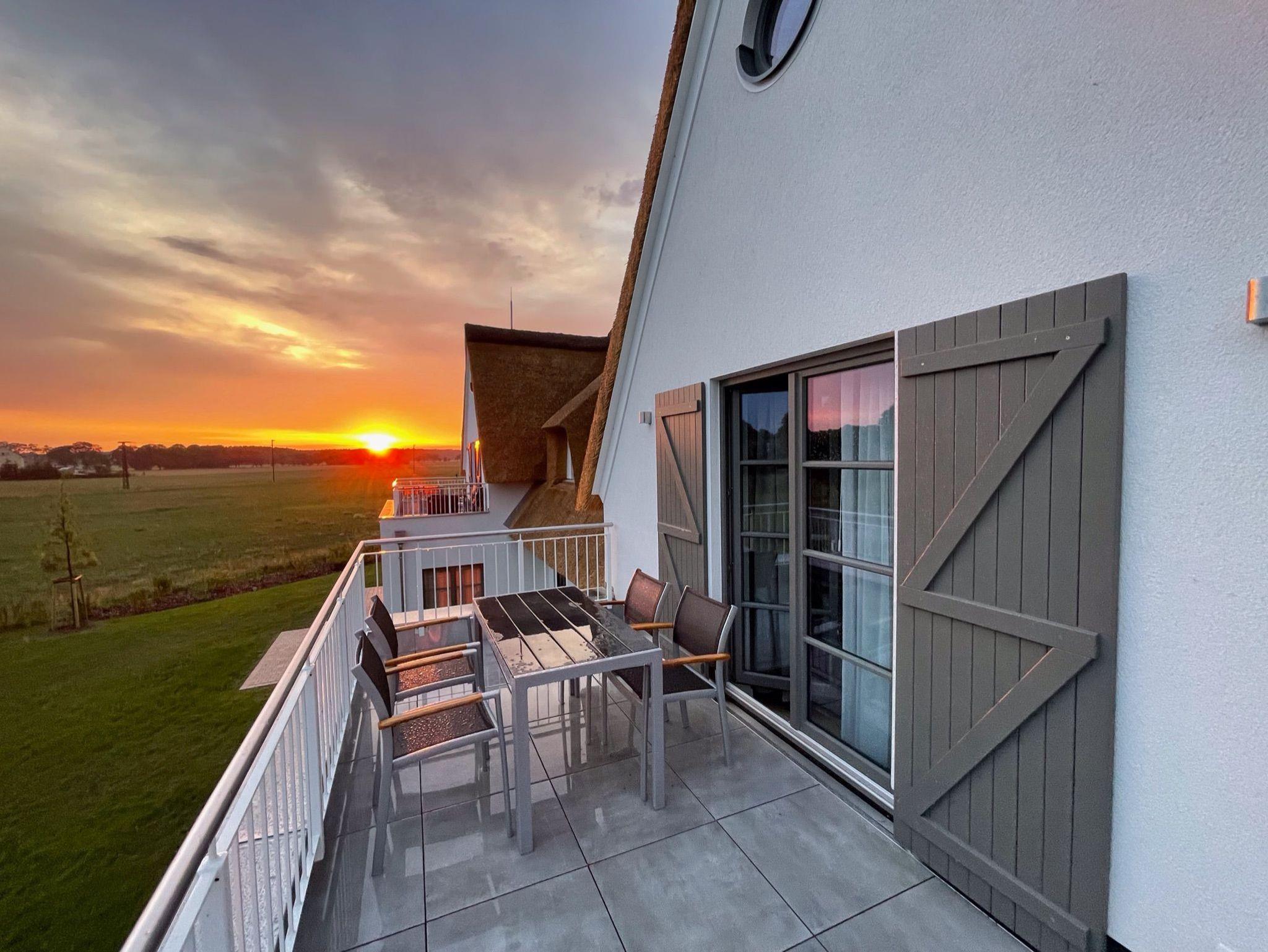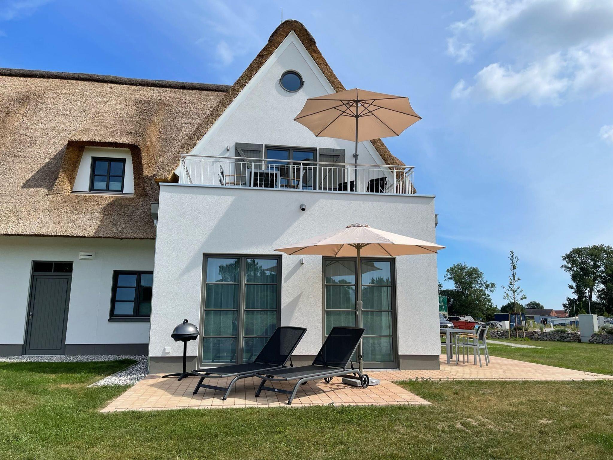 Modernes Apartment mit Reetdach, Balkon und Sauna auf Usedom, ideal für naturnahe Erholung.