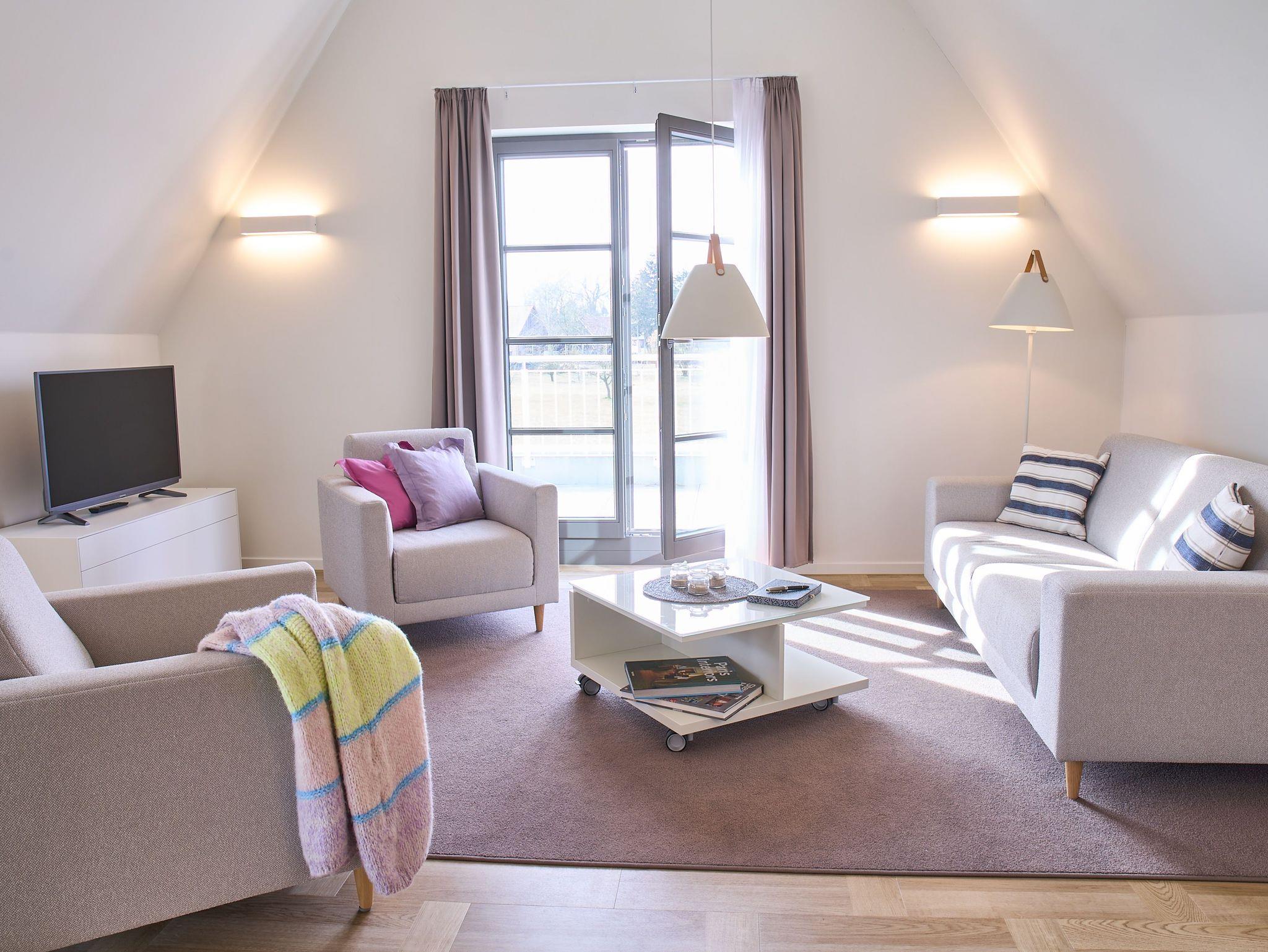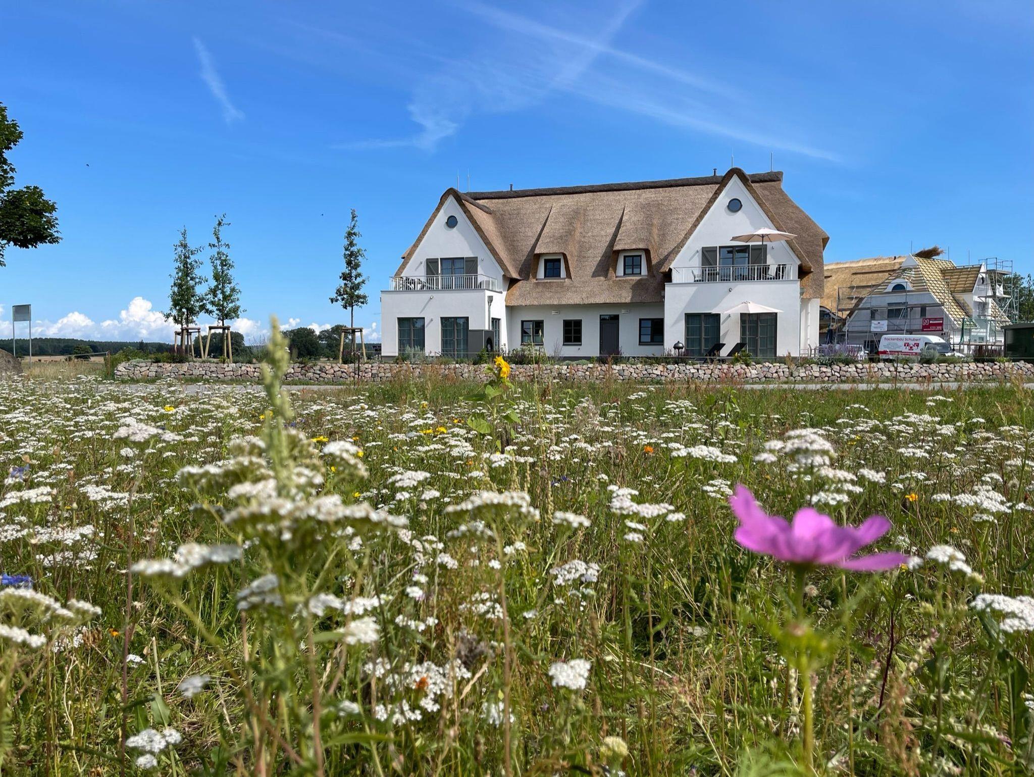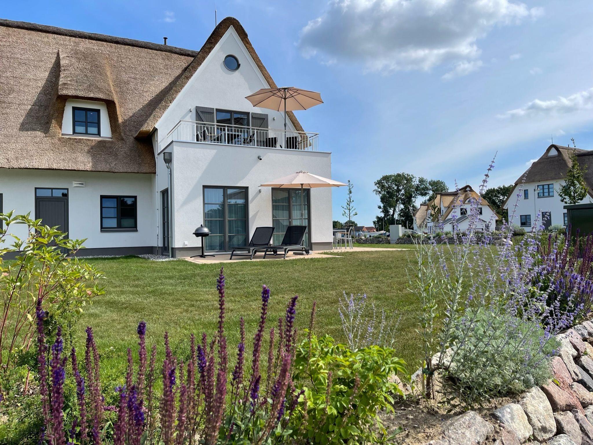 Modernes Apartment mit Reetdach, Balkon und Sauna auf Usedom, ideal für naturnahe Erholung.