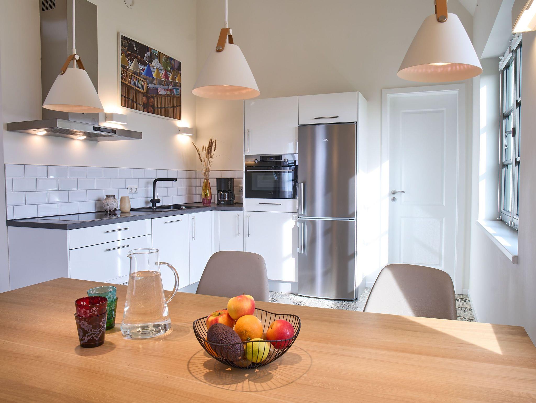 Die Wohnung ist hochwertig ausgestattet. Sie verfügt über eine komplett eingerichtete Einbauküche mit Spülmaschine, Mikrowelle, Induktionsherd und großem Kühlraum mit separatem Gefrierabteil sowie Kaffeemaschine, Wasserkocher und Toaster, Mixer und Pürierstab.