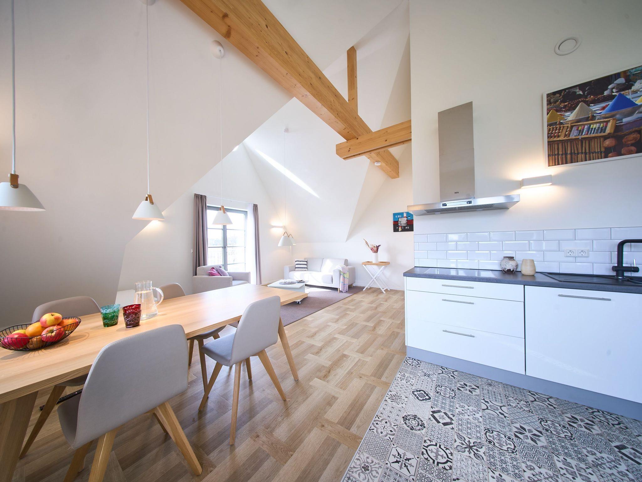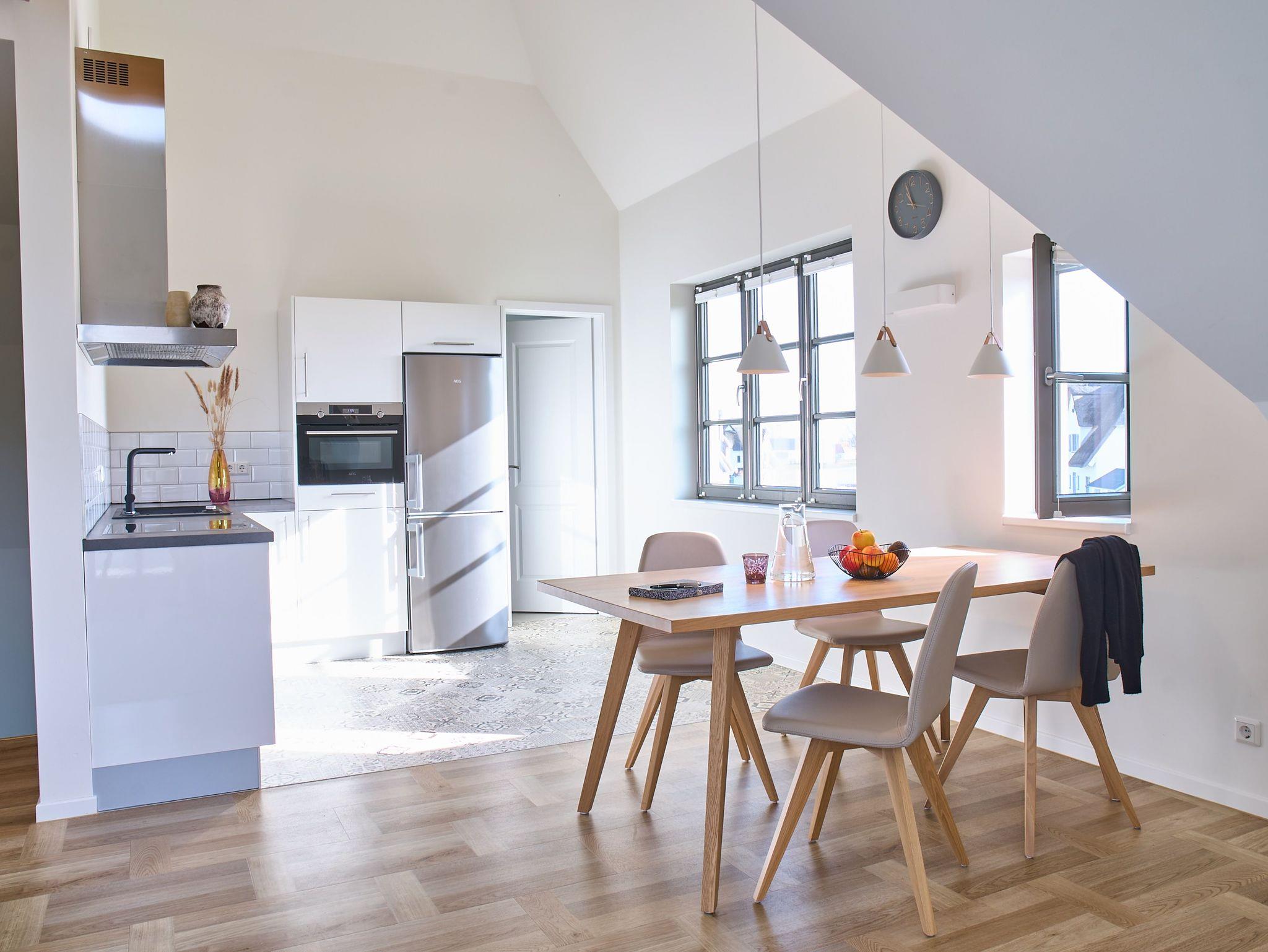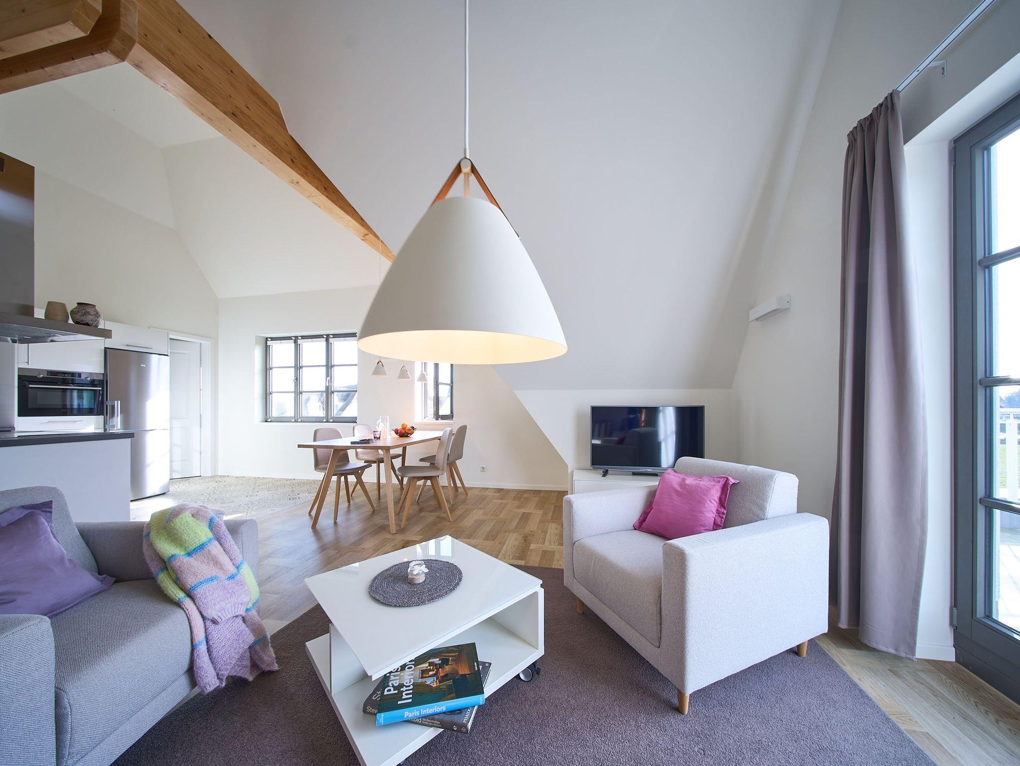 Ebenfalls verfügt die Wohnung über eine Waschmaschine. Der Wohnraum ist durch die ca. vier Meter hohe offene Decke geprägt und die fast 12 qm große Dachterrasse bietet einen weiten Blick über die Felder auf das Haff und das Wasser. Das große Tageslichtbad ist mit einer bodentiefen Dusche mit Glasabtrennung ausgestattet. Das Hauptschlafzimmer verfügt über ein Doppelbett und das zweite Schlafzimmer über zwei Einzelbetten. Bei allen Betten handelt es sich um Boxspringbetten. Im Wohnzimmer, sowie in einem Schlafzimmer befindet sich jeweils ein Flachbildschirm. Kinderreisebett sowie Hochstuhl können nach Verfügbarkeit bei der Verwalterin telefonisch gegen Gebühr bestellt werden.