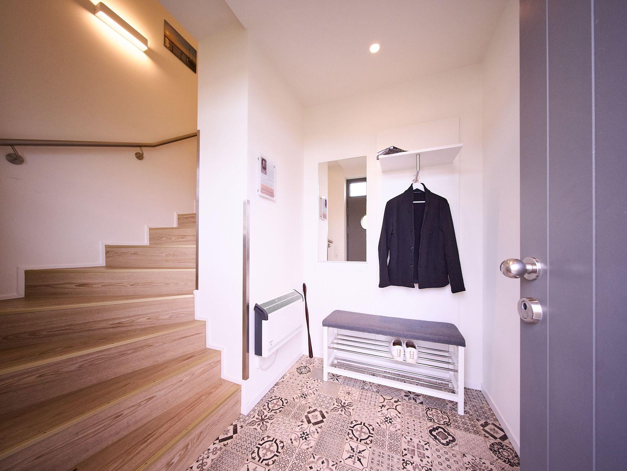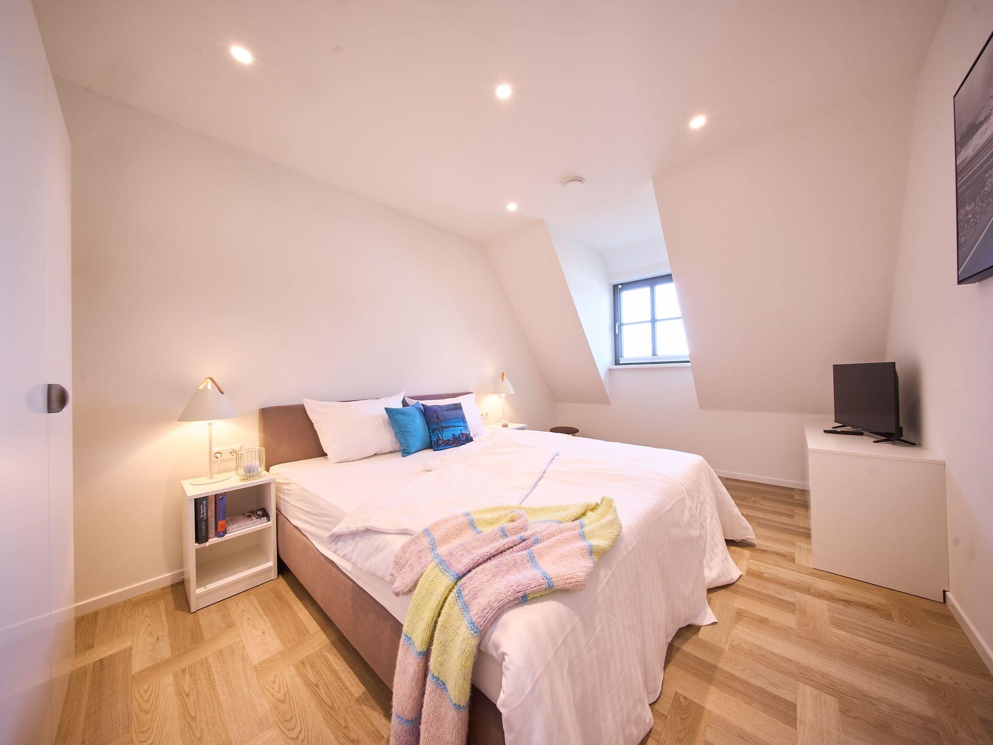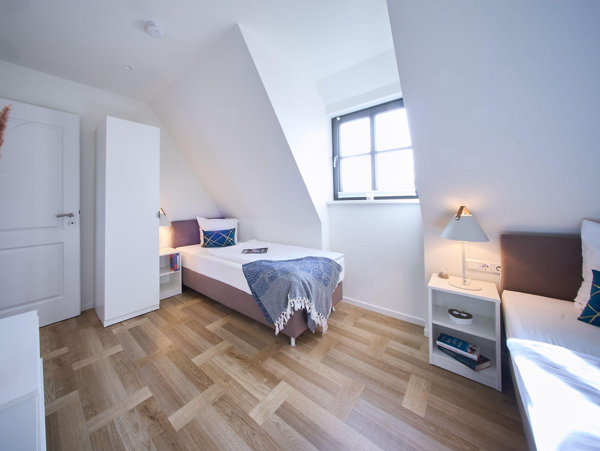 Ebenfalls verfügt die Wohnung über eine Waschmaschine. Der Wohnraum ist durch die ca. vier Meter hohe offene Decke geprägt und die fast 12 qm große Dachterrasse bietet einen weiten Blick über die Felder auf das Haff und das Wasser. Das große Tageslichtbad ist mit einer bodentiefen Dusche mit Glasabtrennung ausgestattet. Das Hauptschlafzimmer verfügt über ein Doppelbett und das zweite Schlafzimmer über zwei Einzelbetten. Bei allen Betten handelt es sich um Boxspringbetten. Im Wohnzimmer, sowie in einem Schlafzimmer befindet sich jeweils ein Flachbildschirm. Kinderreisebett sowie Hochstuhl können nach Verfügbarkeit bei der Verwalterin telefonisch gegen Gebühr bestellt werden.