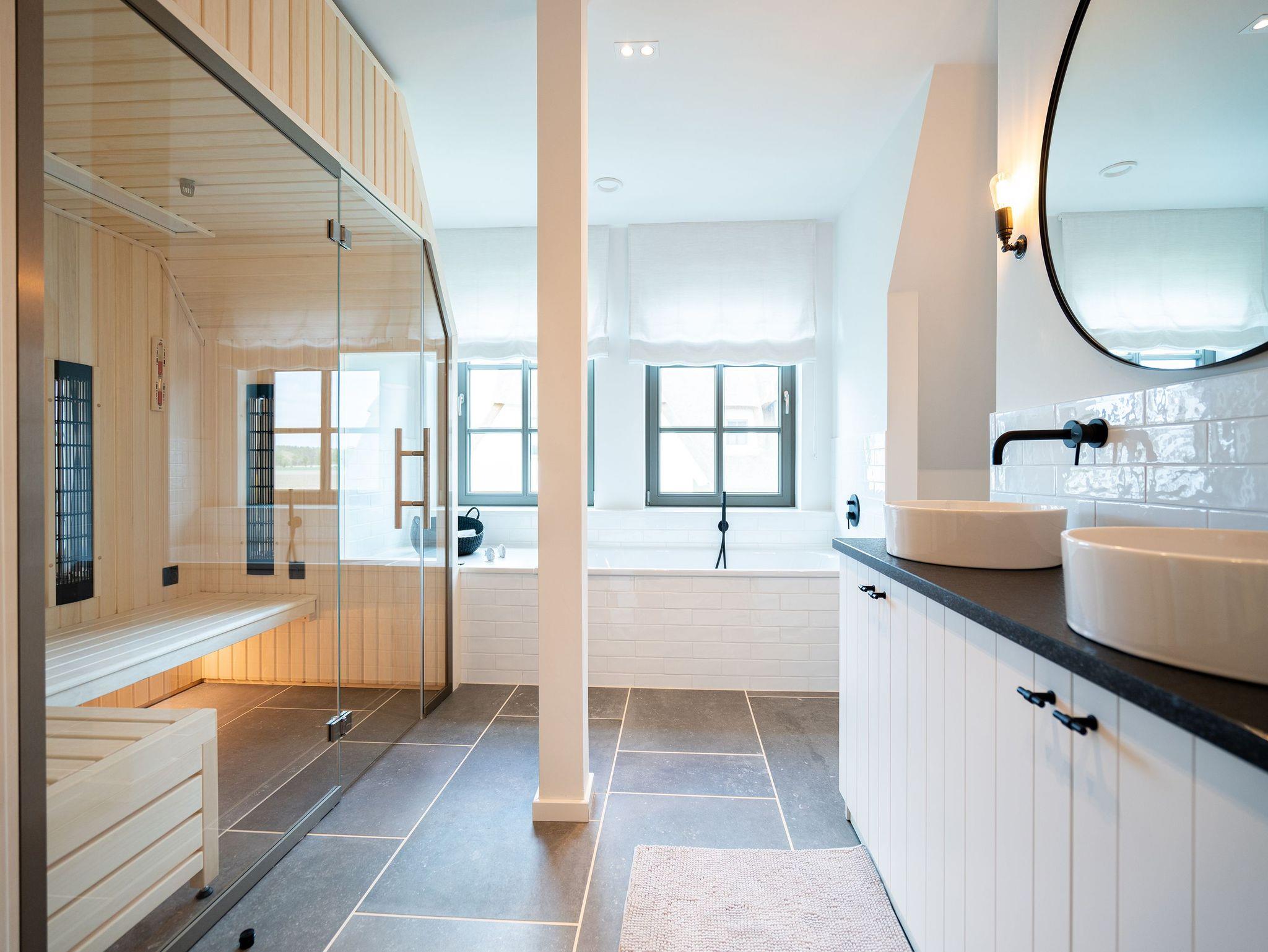 Willkommen in Ihrem exklusiven Haus N° 1 im malerischen Friesenstil! Umgeben von unberührter Natur und idyllischer Ruhe erwartet Sie hier ein traumhaftes Reetdachhaus, das Ihnen einen unvergesslichen Aufenthalt beschert. Die Lage ist perfekt nur wenige Gehminuten trennen Sie vom Haff und der Badebucht, wo Sie entspannte Stunden am Wasser genießen können. Auf großzügigen 130 m² bietet das Ferienhaus Platz für bis zu vier Personen und begeistert mit einer hochwertigen Ausstattung. Edle Echtholzböden und italienische Steinfliesen schaffen eine stilvolle und gemütliche Atmosphäre. Der offene Wohnbereich im Erdgeschoss lädt mit einer komfortablen Sitzgruppe, einem elektrischen Kamin und einem Flachbildfernseher zum Verweilen ein. Die moderne, voll ausgestattete Küche verfügt über eine Kochinsel mit Tresen sowie einen großen Esstisch mit zwei Bänken ideal für gesellige Mahlzeiten. Ein Gäste-WC sowie ein Hauswirtschaftsraum mit Waschmaschine und Trockner sorgen für zusätzlichen Komfort. Im Obergeschoss erwarten Sie zwei gemütliche Schlafzimmer, jeweils mit einem komfortablen Doppelbett (1,80 m x 2,00 m) und einem Flachbildfernseher. Hier können Sie sich zurückziehen und die Erlebnisse des Tages entspannt Revue passieren lassen. Ein Kinderreisebett findet ebenfalls problemlos Platz. Das Haus verfügt über zwei moderne Badezimmer: Das Hauptbad beeindruckt mit einer Badewanne, einer Dusche, einem Doppelwaschtisch und einer entspannenden Infrarot-Sauna, während das zweite Bad als Masterbad direkt an eines der Schlafzimmer angeschlossen mit einer Dusche, einem WC und einem weiteren Doppelwaschtisch ausgestattet ist. Für Ihren Komfort sind die Betten bei Anreise frisch bezogen und Handtücher liegen bereit. Der weitläufige Garten lädt mit zwei Sonnenterrassen dazu ein, die Natur in vollen Zügen zu genießen. Ein gemütlicher Strandkorb bietet den perfekten Platz für entspannte Stunden. Selbstverständlich steht Ihnen kostenloses WLAN zur Verfügung, sodass Sie jederzeit mit Ihren Lieben in Verbindung bleiben können. Ein eigener PKW-Stellplatz (Nr. 30) direkt am Haus, ein abschließbares Fahrrad-Gartenhaus mit Steckdose für E-Bikes sowie eine zusätzliche E-Ladestation auf dem Gelände des Inseldomizils runden das Angebot ab. Erleben Sie unvergessliche Urlaubsmomente in diesem luxuriösen Ferienhaus und lassen Sie sich von der Schönheit der Umgebung und der wohltuenden Ruhe verzaubern. Wir freuen uns darauf, Sie willkommen zu heißen!