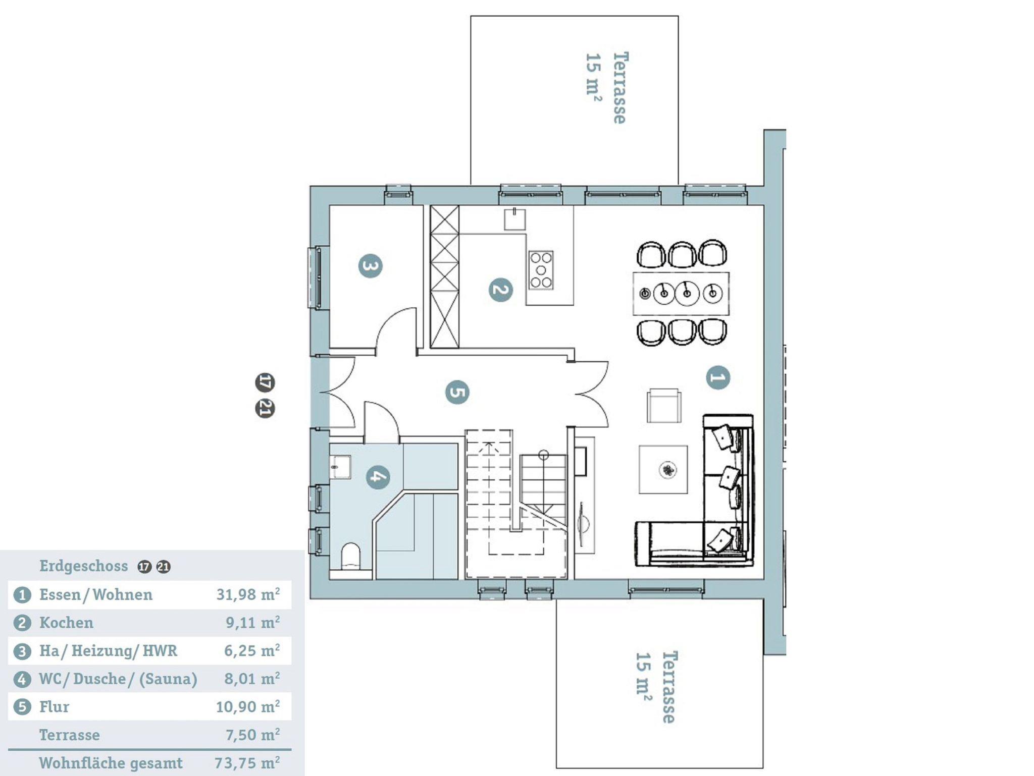 Für den Wellness-Faktor sorgt das Badezimmer mit exklusiver hauseigener Sauna, Waschbecken, bodentiefer Dusche und WC. Durch zwei verschiedene große Terrassen, die einen weiten Blick über die Felder bieten, ist ganztägig Sonnengenuss möglich. Eine Waschmaschine sowie Elektrogrill stehen Ihnen ebenfalls zur Verfügung.