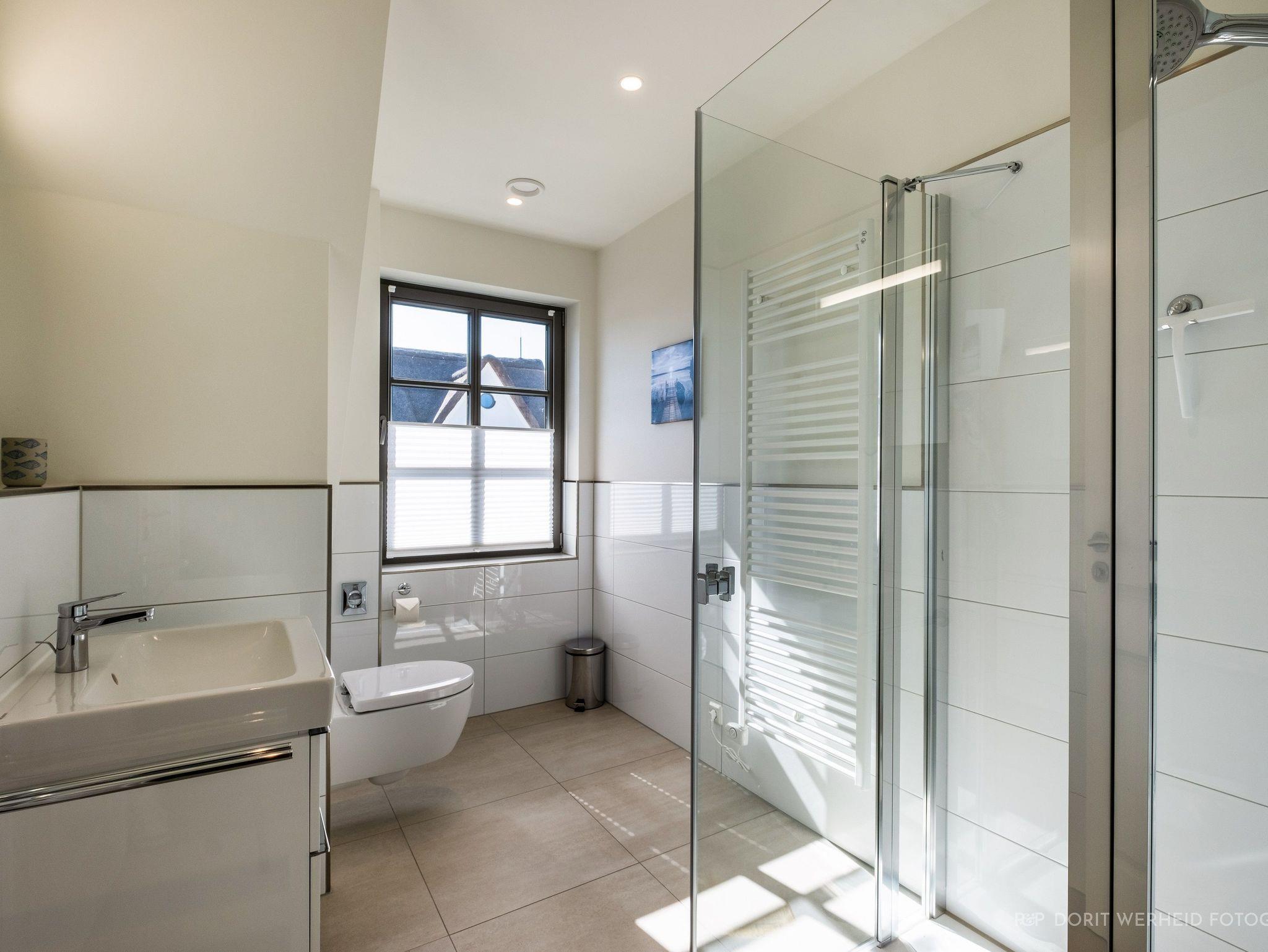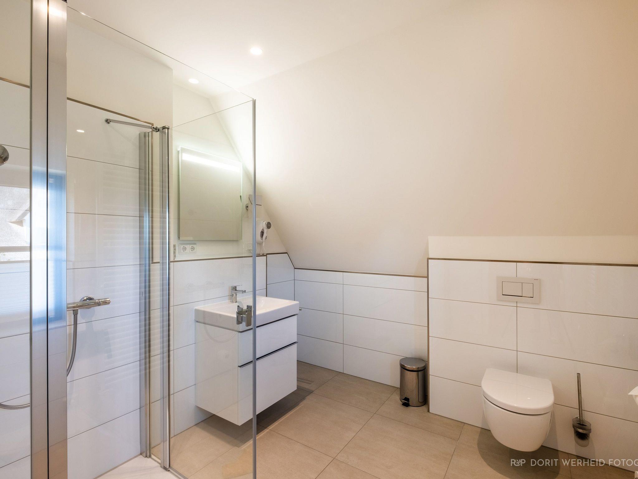 Alle Badezimmer sind mit bodentiefen Duschen, WCs und Waschbecken ausgestattet.