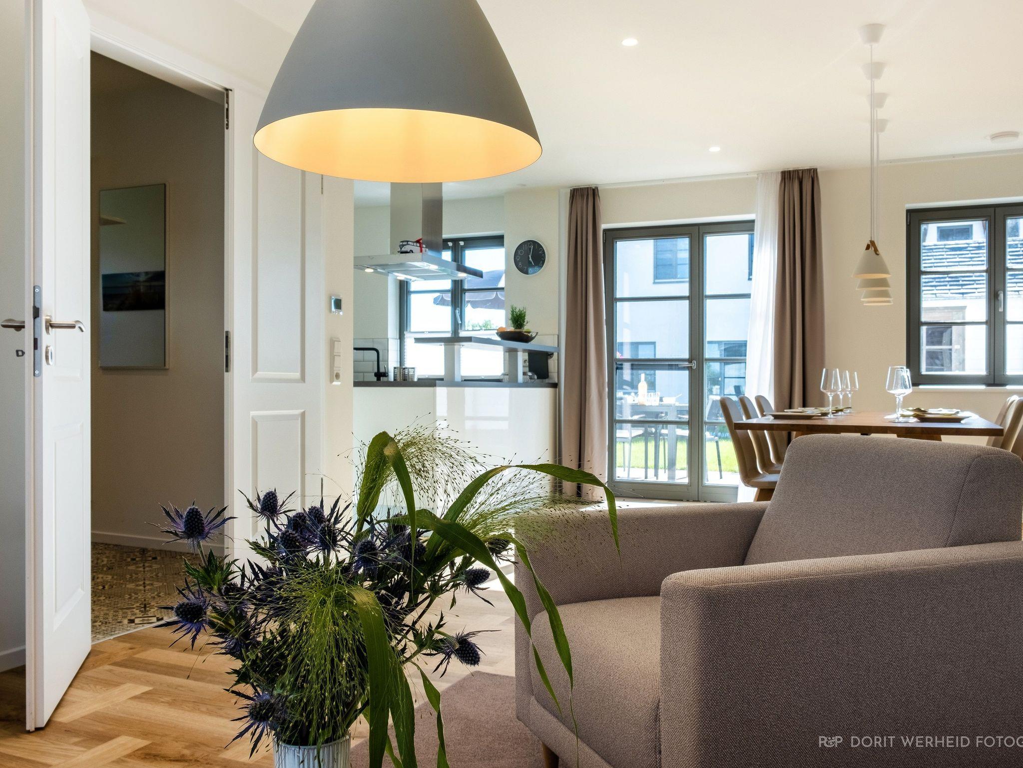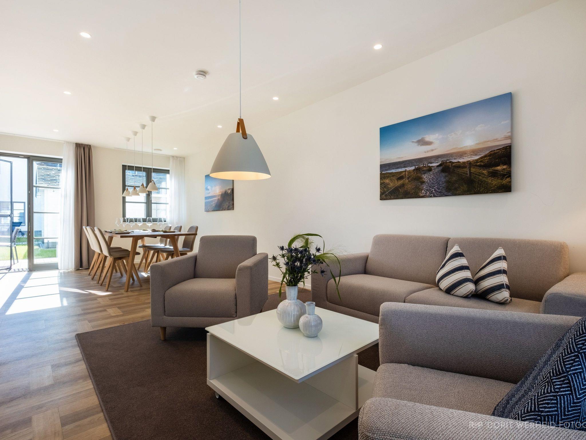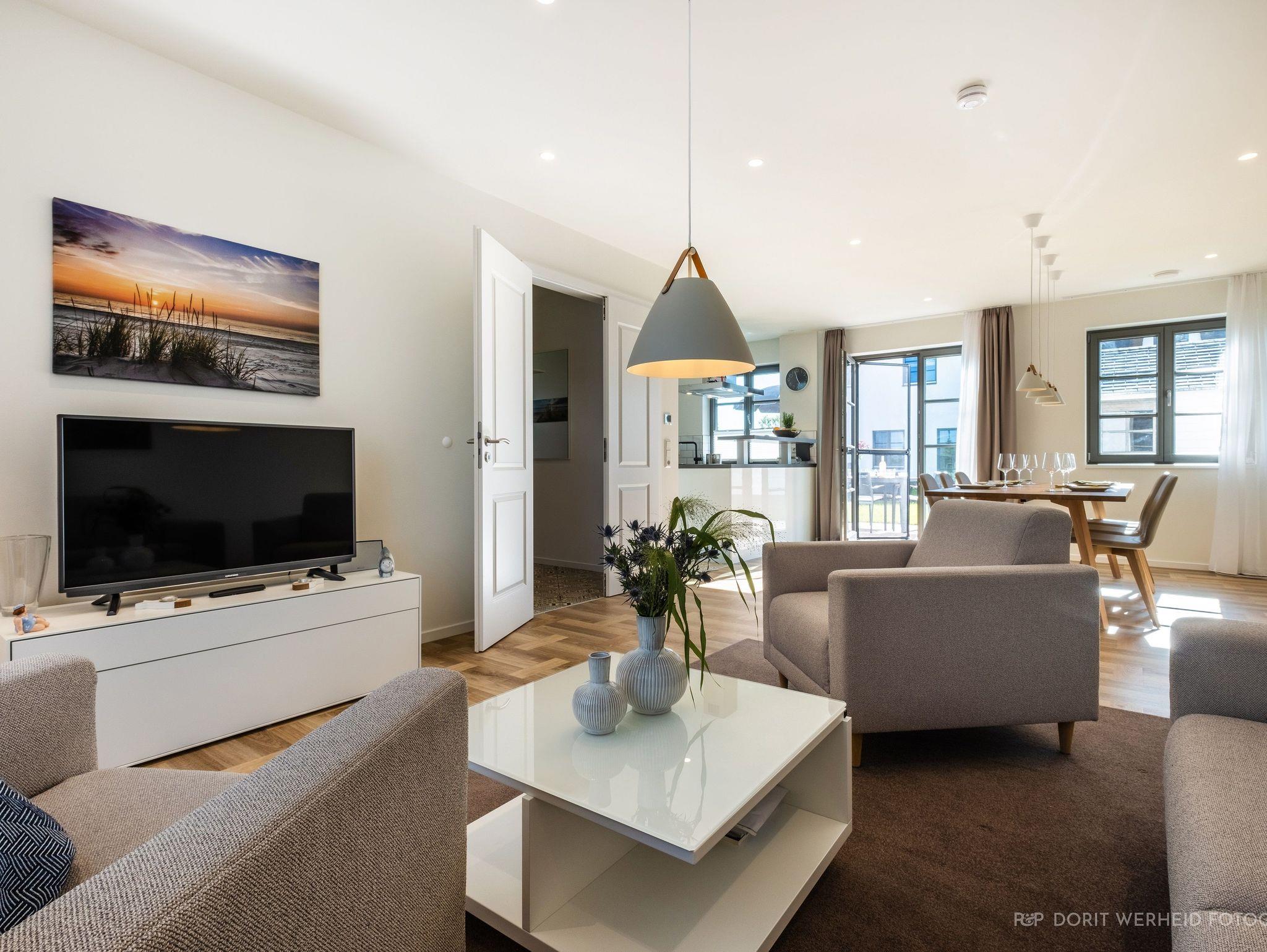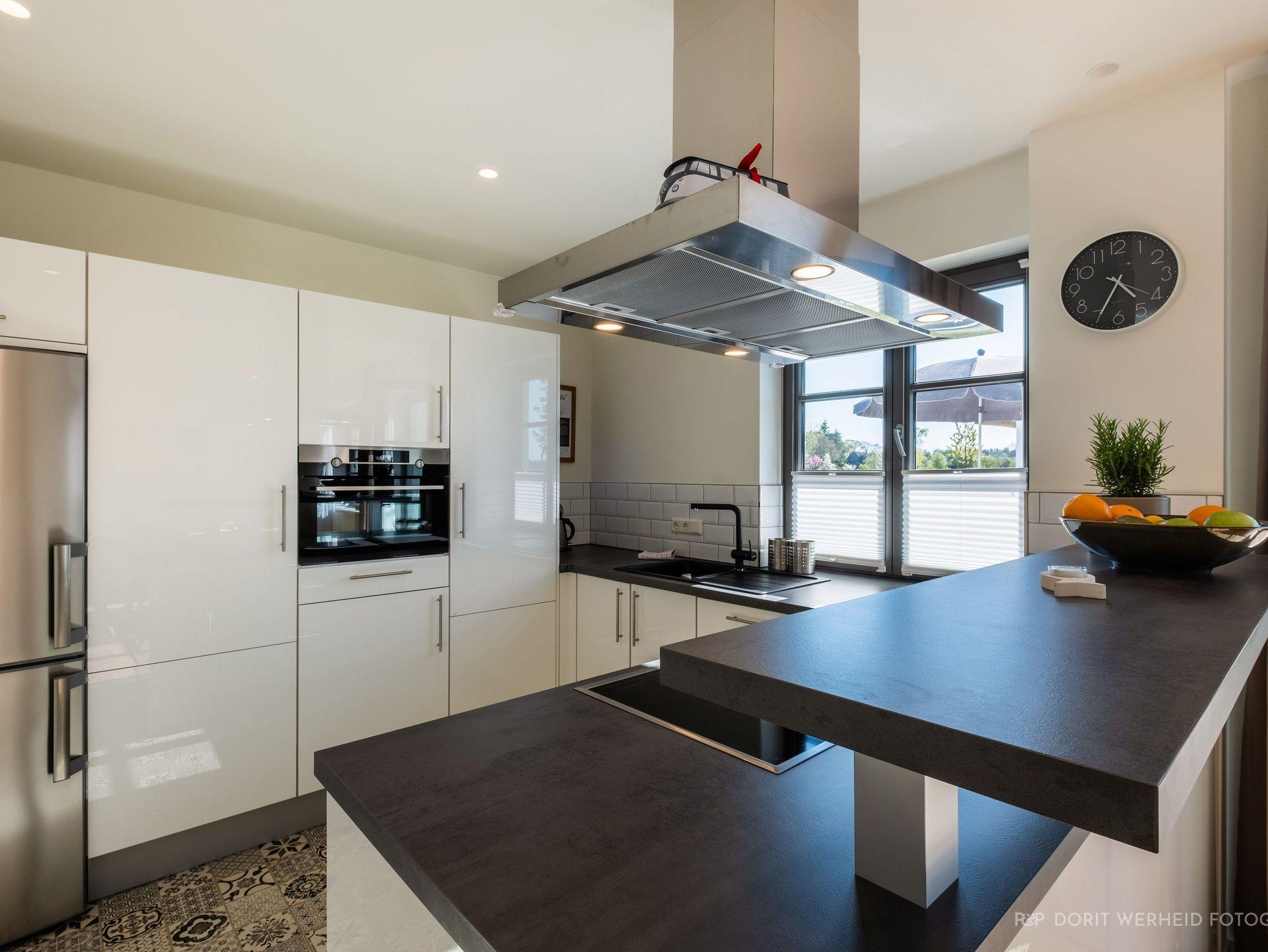 Die komplett eingerichtete Wohnküche verfügt über Spülmaschine, Mikrowelle, Induktionsherd und großem Kühlschrank mit separatem Gefrierfach sowie Kaffeemaschine, Wasserkocher und Toaster, einen Esstisch für 6 Personen sowie eine gemütliche Wohnlandschaft mit Flachbild-TV und Musikanlage.