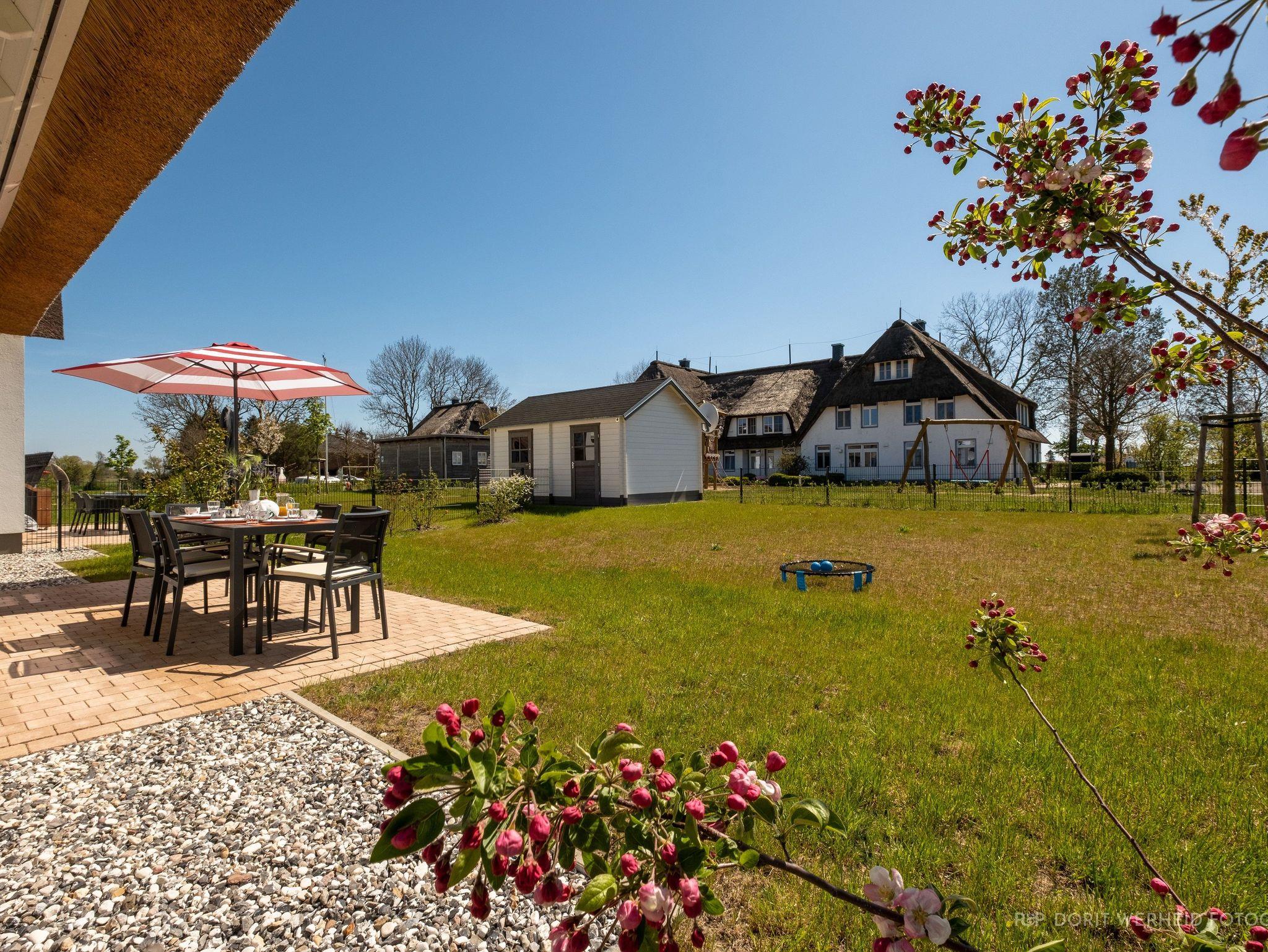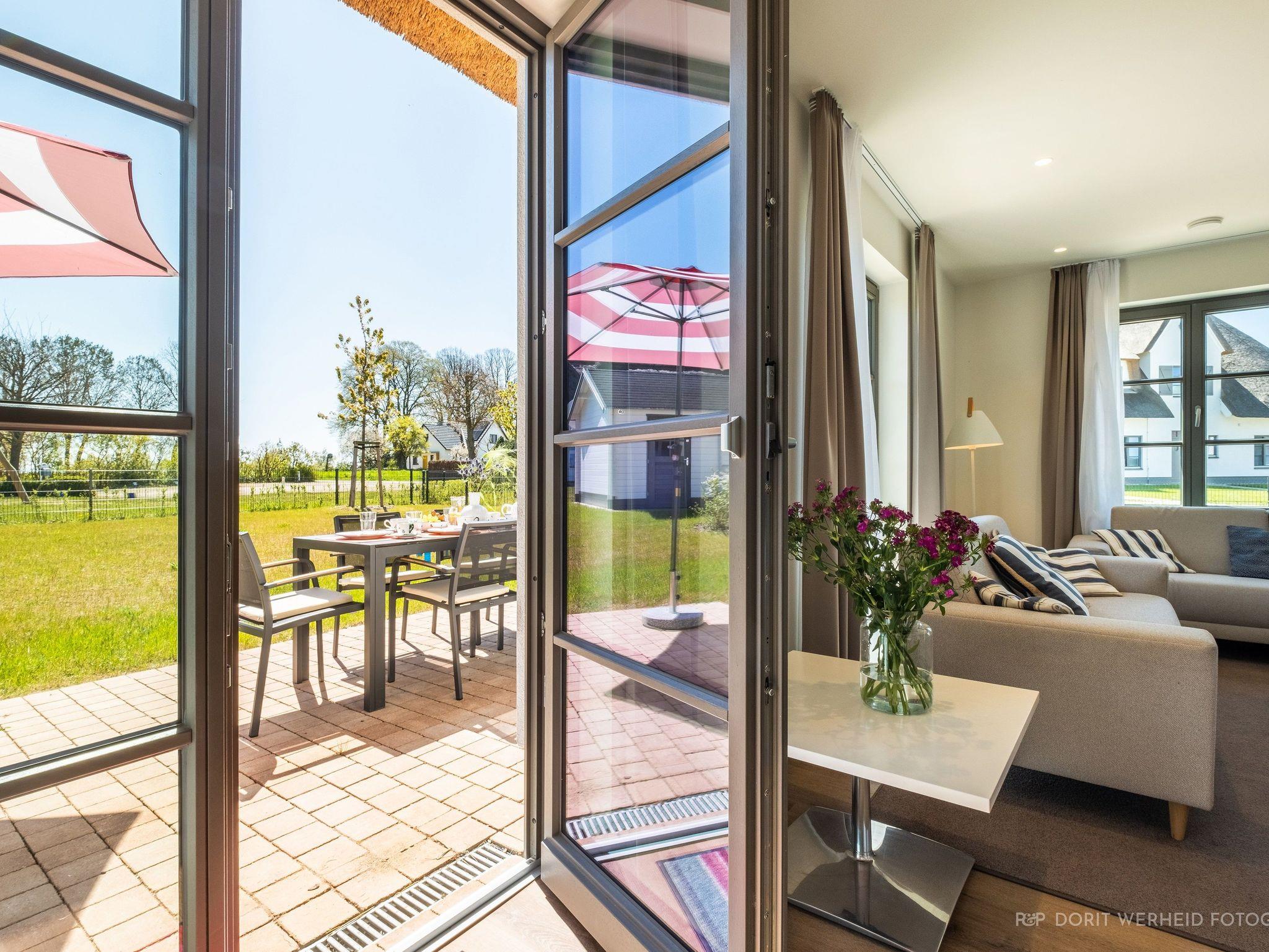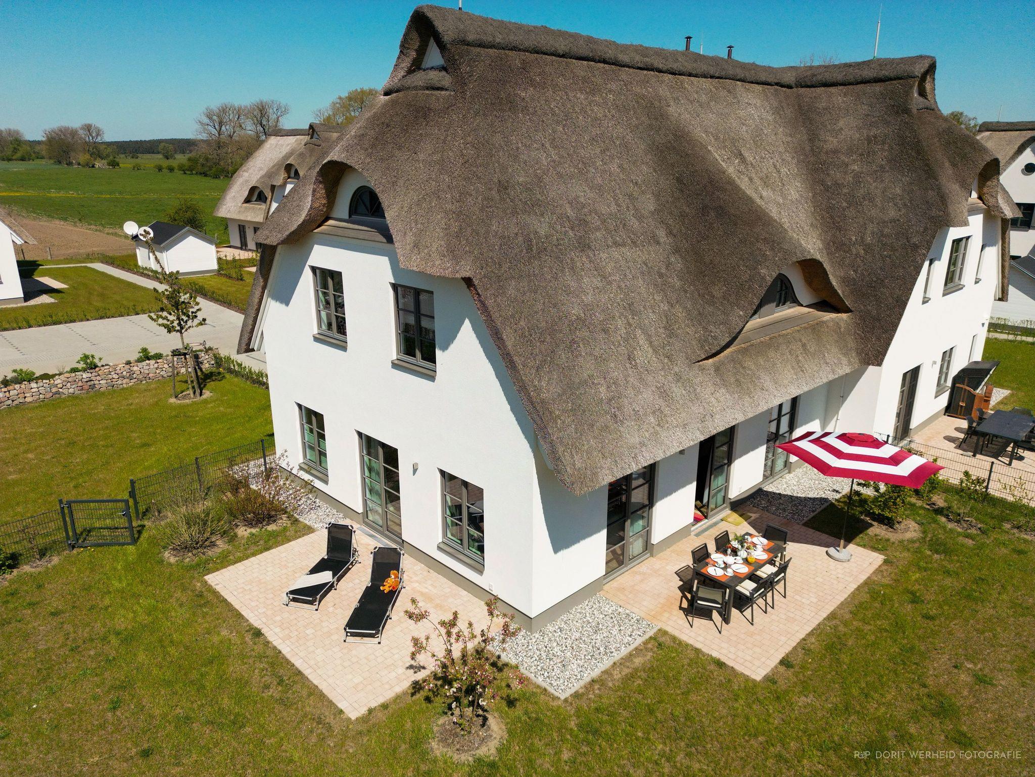 Die Reet gedeckten Häuser wurden in nachhaltiger Holzbauweise errichtet und die Einrichtung ist durch helle sowie freundliche Farben geprägt. Der Blick auf die Haffküste und die umliegende Natur machen Ihren Urlaub einzigartig.