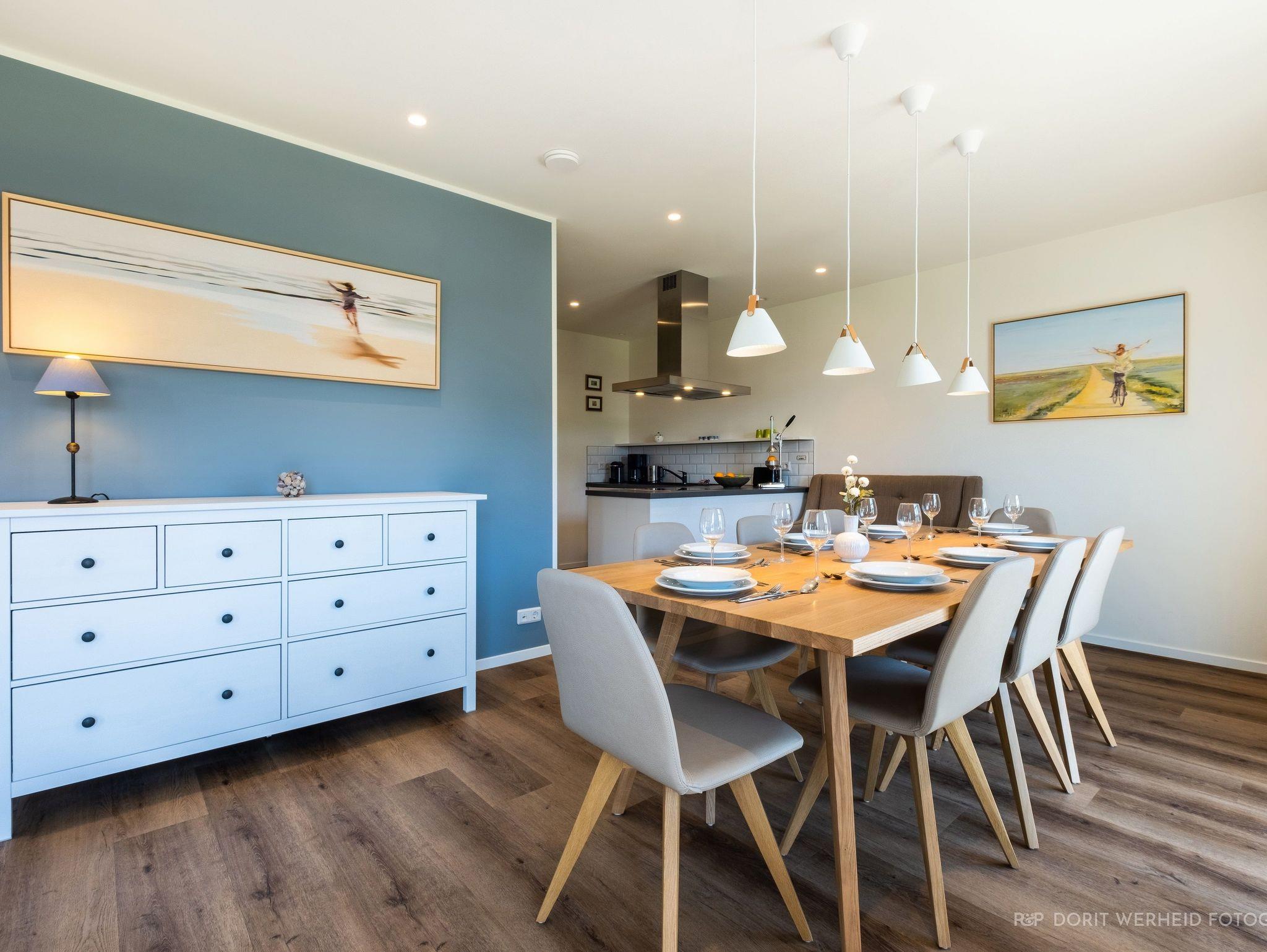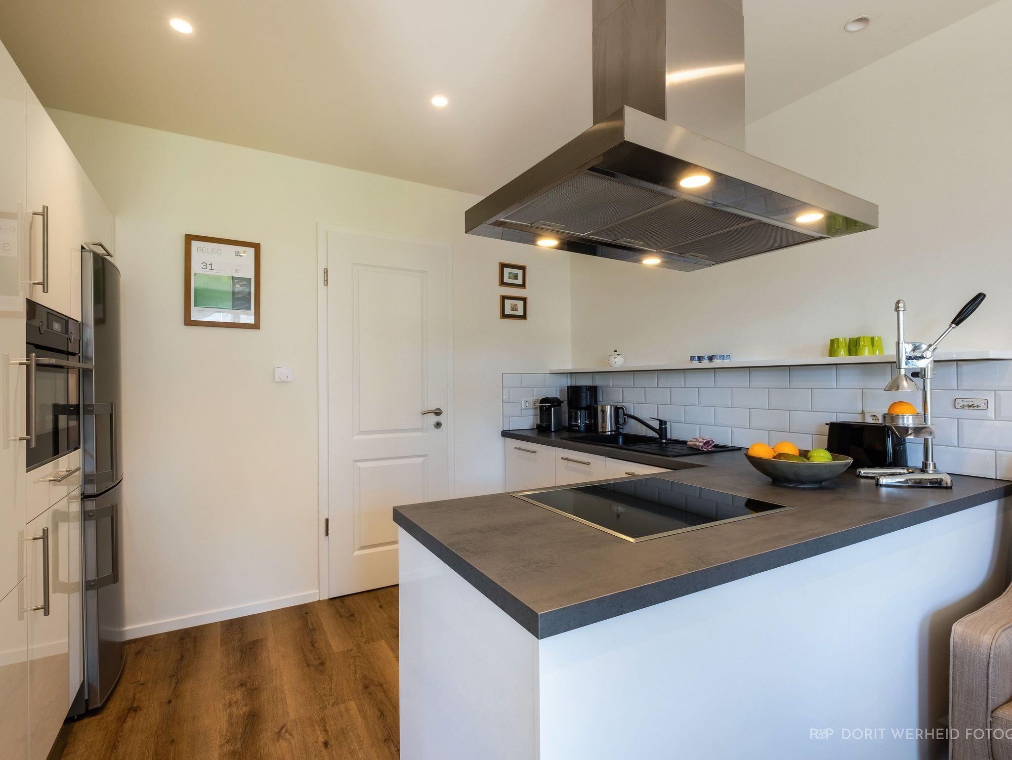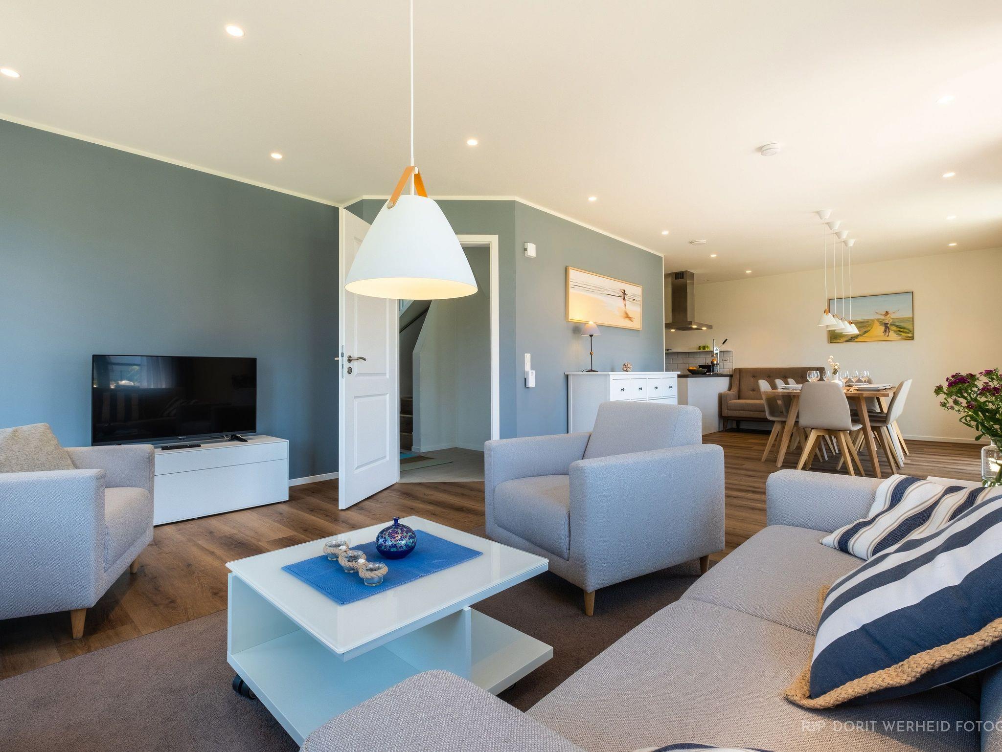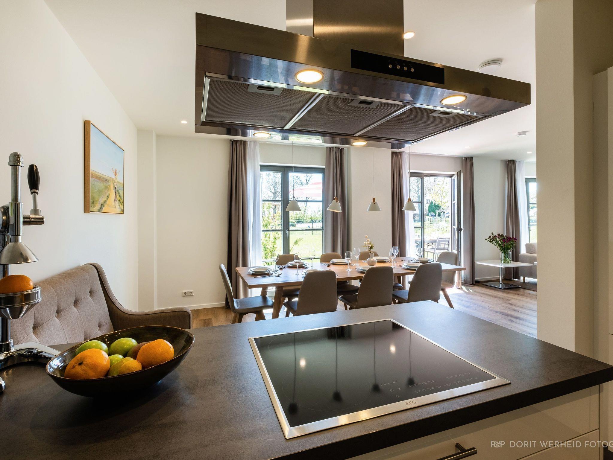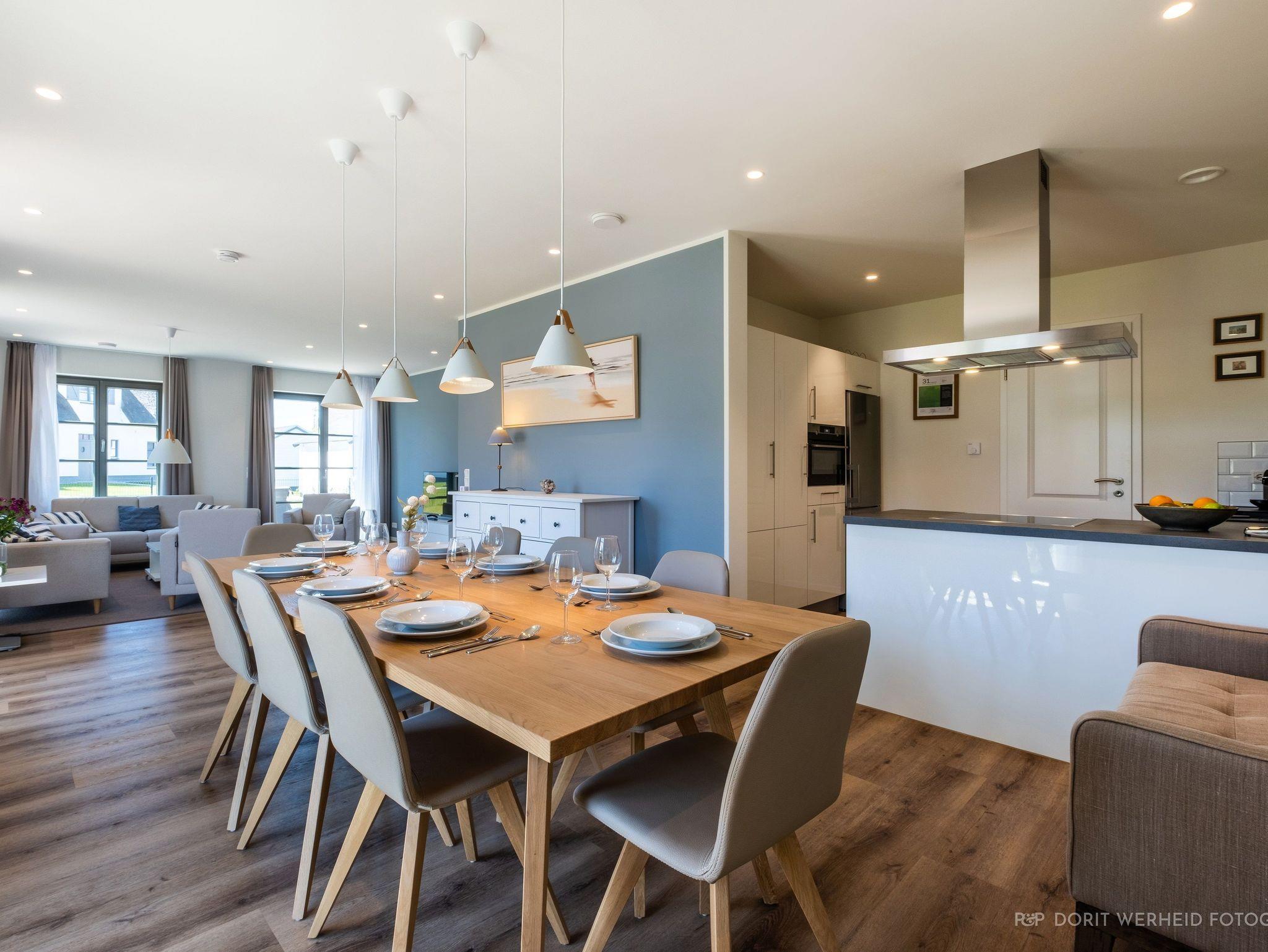 Der großzügige Wohnraum lädt zum Verweilen ein. Hier findest du ein bequemes 3-Sitzer-Sofa, einen Flachbild-TV für entspannte Abende und einen Esstisch, der Platz für bis zu 8 Personen bietet, perfekt für gemeinsame Mahlzeiten und gesellige Stunden. Die moderne Küche ist offen gestaltet und verfügt über ein Cerankochfeld, Backofen, einen Kombi-Gefrierschrank, eine Spülmaschine, eine De Longhi Kapsel-Kaffeemaschine, Filtermaschine, Mikrowelle, Wasserkocher, Toaster und vieles mehr. Von dem Wohnbereich gelangen Sie auf die zwei möblierten Terrassen in südwestlicher Ausrichtung, sie bieten Platz zum Sonnenbaden und Relaxen. Das voll eingezäunte Grundstück sorgt für Privatsphäre und Sicherheit für Ihre Kinder und Vierbeiner.