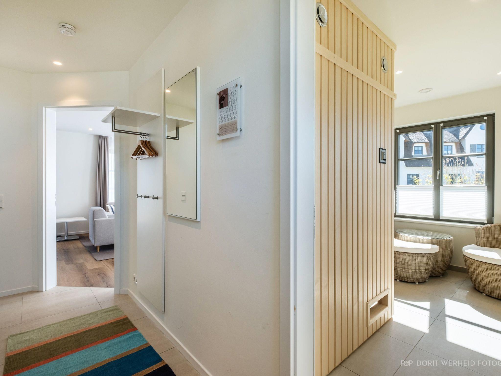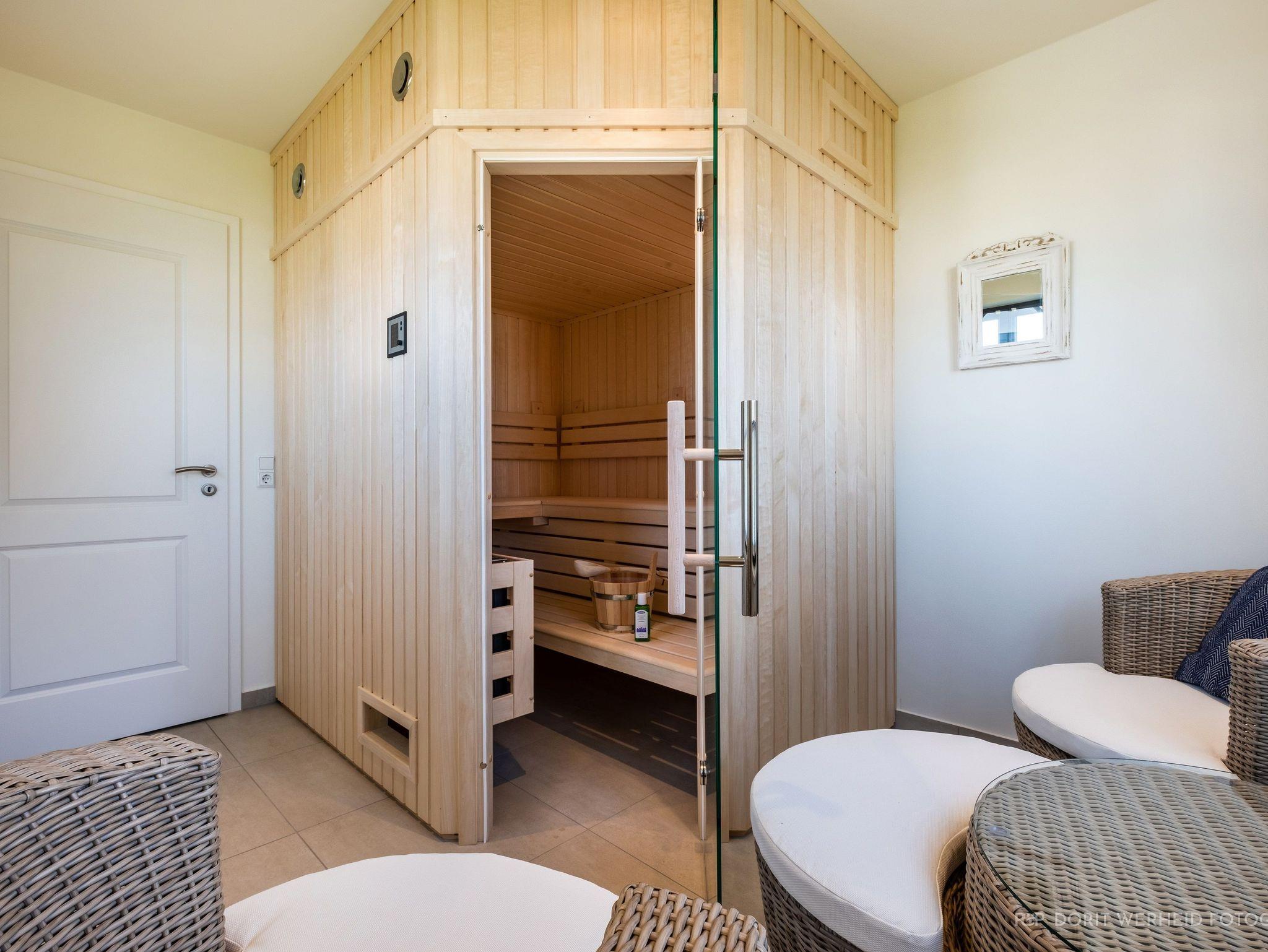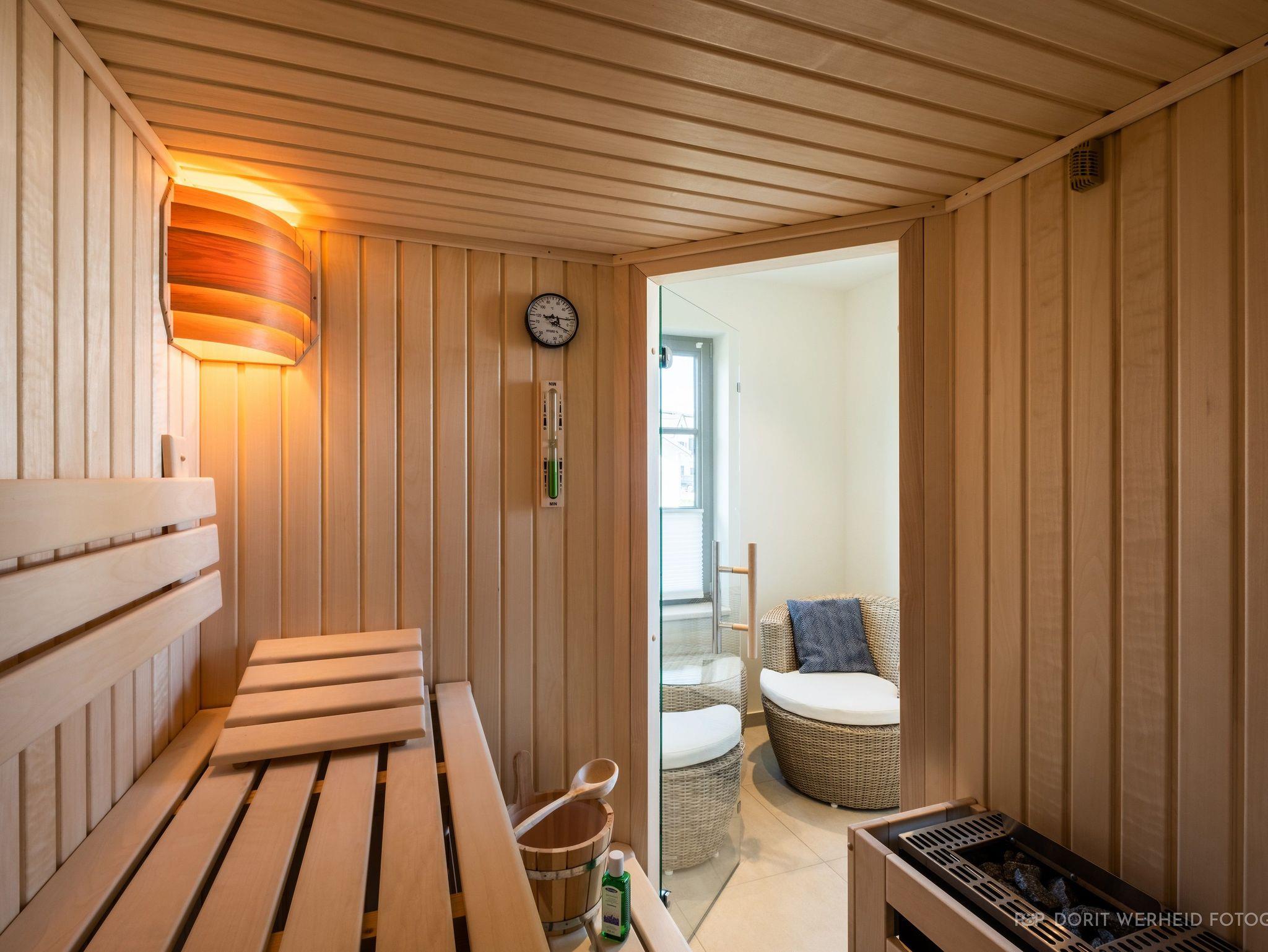 Ein separater Raum mit einer finnischen Sauna für 4 Personen lädt zum Entspannen ein. Zusätzlich gibt es einen Ruhebereich, um die Seele baumeln zu lassen. Gegenüber befindet sich das kleine Badezimmer mit Waschbecken, WC und bodentiefer Dusche.