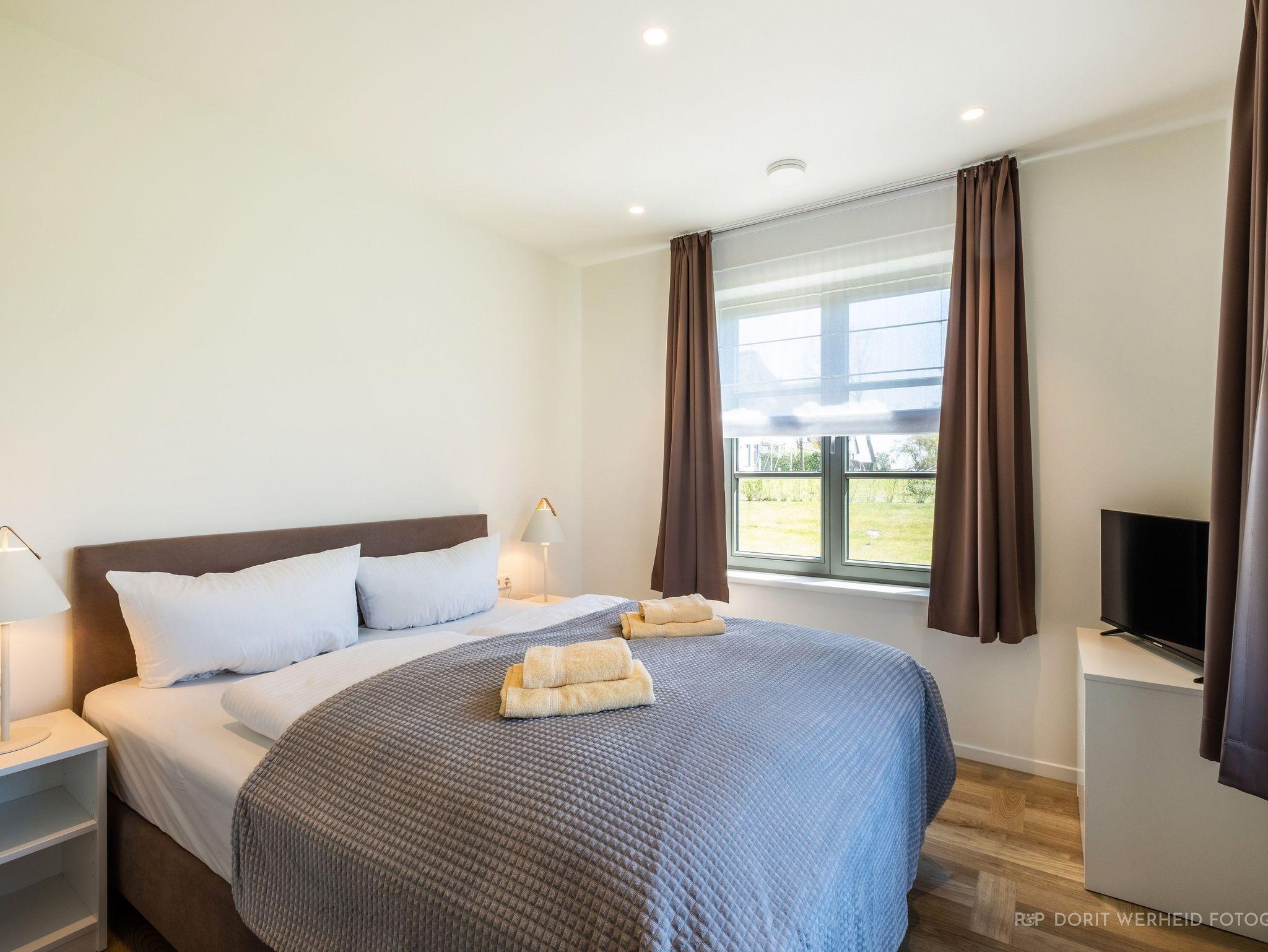 Im Obergeschoss befinden sich die drei Schlafzimmer mit TV sowie zwei Bäder. Alle Schlafzimmer verfügen über ein 1,80 x 2,00m Boxspringdoppelbett. Das Master- Schlafzimmer verfügt über ein Badezimmer en Suite mit Waschbecken, WC und bodentiefer Dusche. Das andere Badezimmer verfügt ebenfalls über ein Waschbecken, WC, bodentiefe Dusche und zusätzlich über einen Waschtrockner. Ein Fön steht Ihnen ebenfalls zur Verfügung.