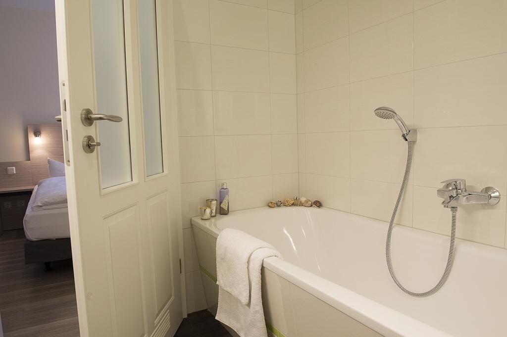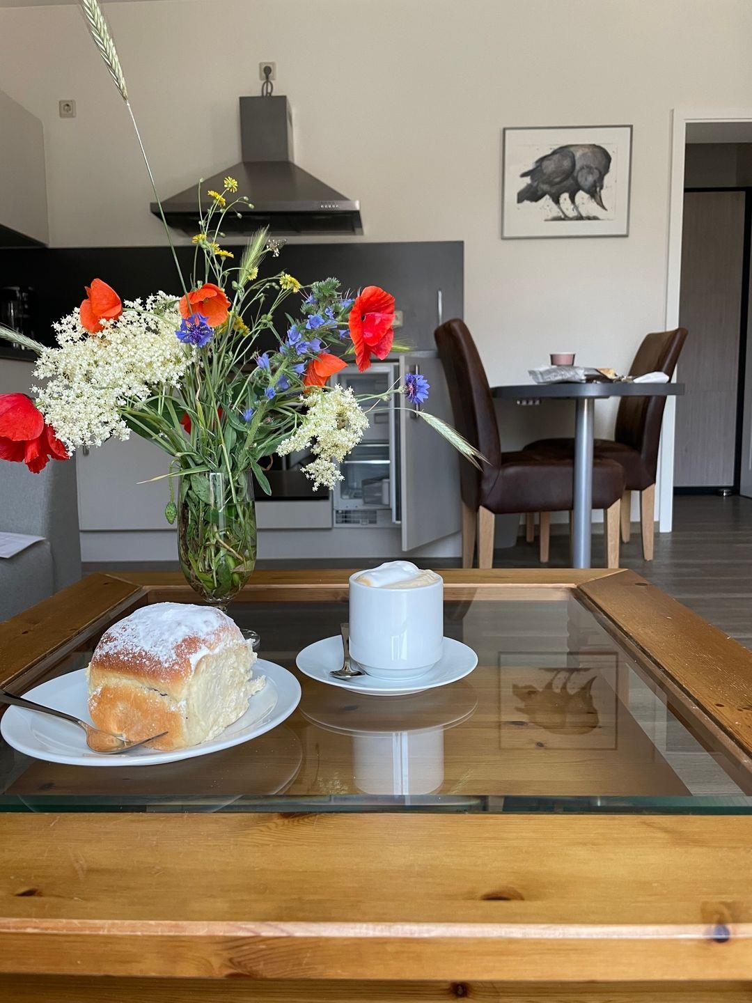 2 Zimmerappartement. für 2-3 Personen, 1 Schlafzimmer mit Komfortdoppelbett, 1 Schlafcouch im Wohnbereich, Bad mit Wanne und Dusche, Fön, Gäste-WC, offene Küchenzeile mit Geschirrspüler, Südterrasse, Fernseher, WLAN, Mückengitter, Parkplatz