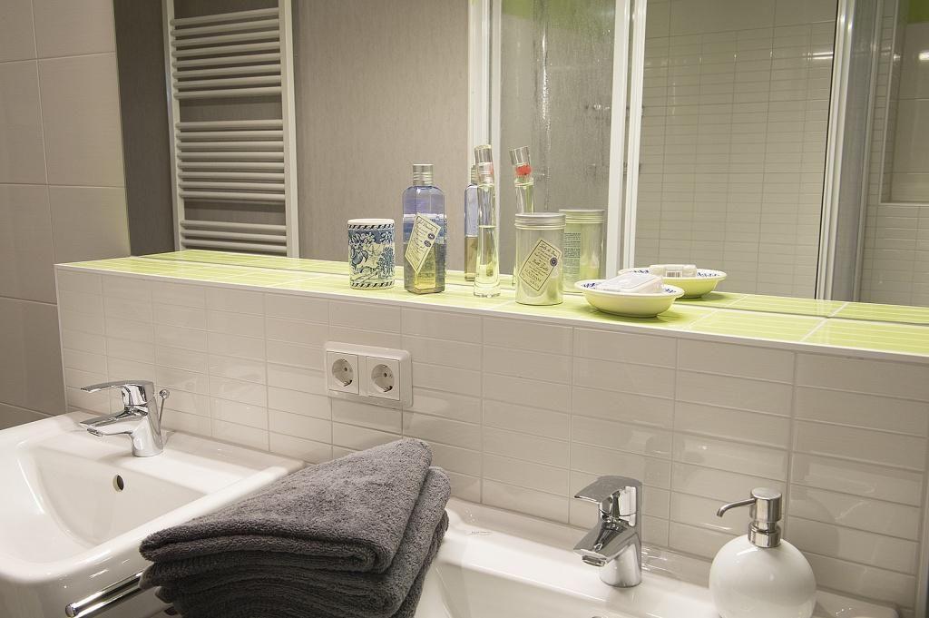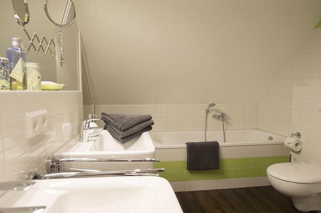 Das Appartement hat ein großes Badezimmer mit Badewanne, Dusche, WC und ein kleines separates Gäste-WC. Das Badezimmer ist zusätzlich mit einer Waschmaschine, Haarfön und Kosmetikspiegel ausgestattet.