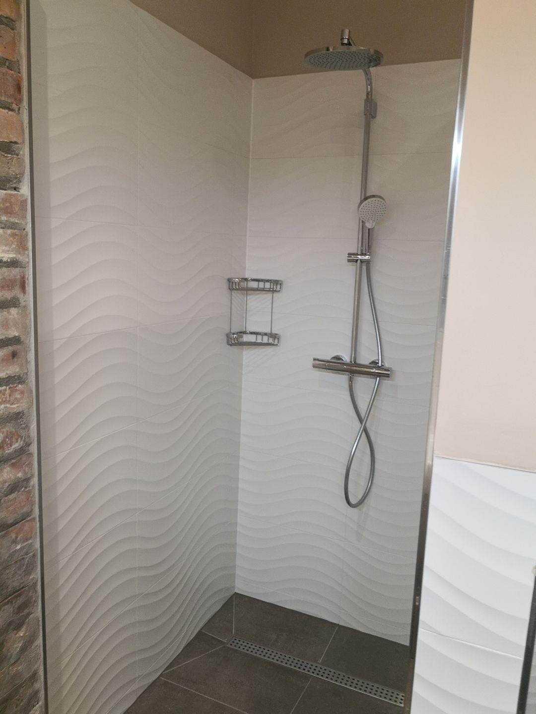 Das Duschbad mit WC, Doppelwaschtisch, Fön, und Kosmetikspiegel ist ausreichend groß.