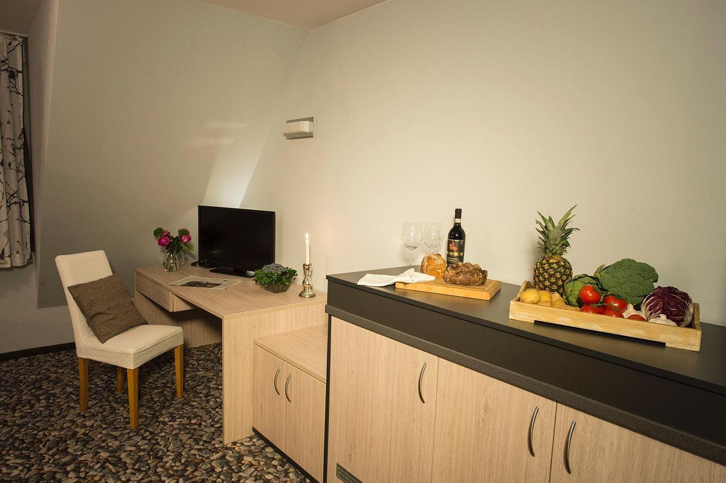 Eine kleine Pantryküche mit 2 Kochplatten, Kühlschrank, Kaffeemaschine, Toaster, Geschirr sind vorhanden, so dass die Möglichkeit ein eigenes Frühstück oder Abendessen zuzubereiten gegeben ist. Es ist aus Brandschutzgründen nicht erlaubt hier in größerem Umfang zu kochen.