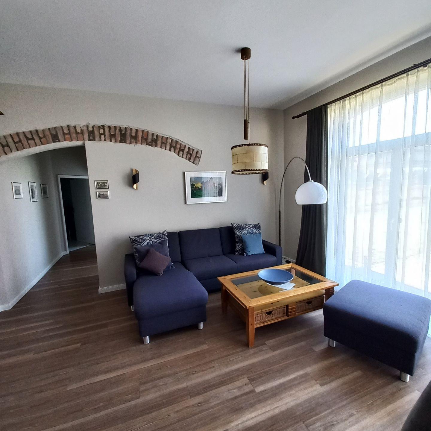 Die zum Innenhof der Remise nach Süden ausgerichtete Terrasse begehen Sie aus der gemütlich eingerichteten Wohnküche. Die moderne offene Küchenzeile ist komplett, incl. Geschirrspüler ausgestattet.