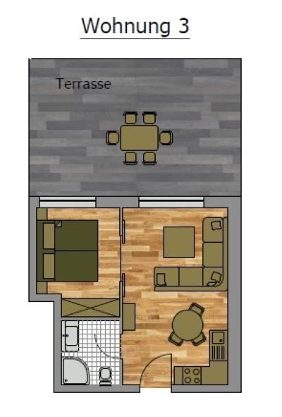 2 Zimmerappartement, für 2 Personen, 1Schlafzimmer mit Doppelbett, Bad mit Dusche, offene Küchenzeile mit Geschirrspüler, Südterrasse, Fernseher, WLAN, Parkplatz