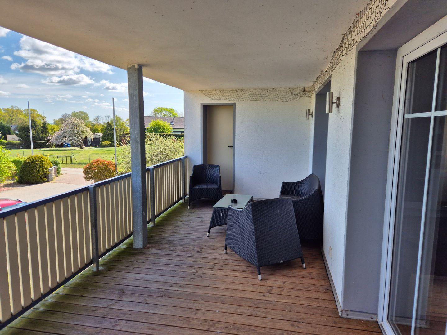 Von einem grossen, 2,6 m tiefen, überdachten Balkon blicken Sie in Richtung Westen zum ca. 300 m entfernten "Schloss Stolpe" und seitlich Richtung Haff.