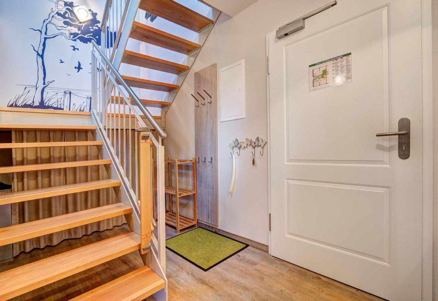 Im 2. Stock befindet sich der Eingangsflur, der Wohnraum mit gemütlicher Sofaecke, der Essgruppe und einer voll ausgestatteten Küchenzeile. Das Schlafzimmer auf dieser Etage ist großzügig möbliert mit komfortablem Boxspringbett für 2 Personen, Schreibtisch und ausreichend Schrankraum.