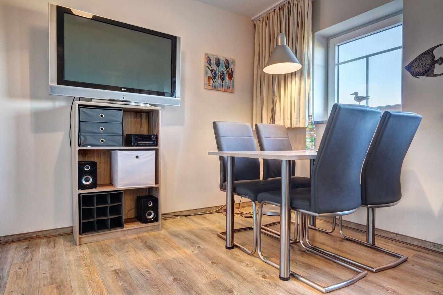 Das Appartement ist ausgestattet mit Flat- TV, CD/DVD-Player, WLAN, Föhn, Mückengittern.
