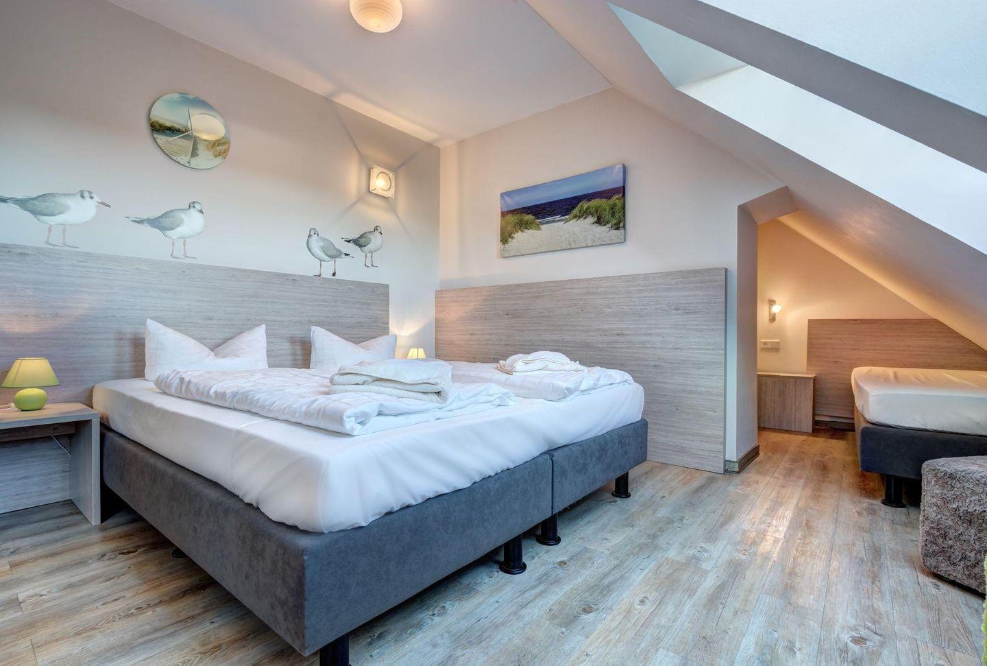 Über eine Treppe erreicht man die obere Etage im 3. Stock mit einem großen hellen Raum. Ein Doppelbett und ein Einzelbett, sowie ein Stauraum bieten hier den Schlafplatz für den Ferienaufenthalt von 2-3 Personen.