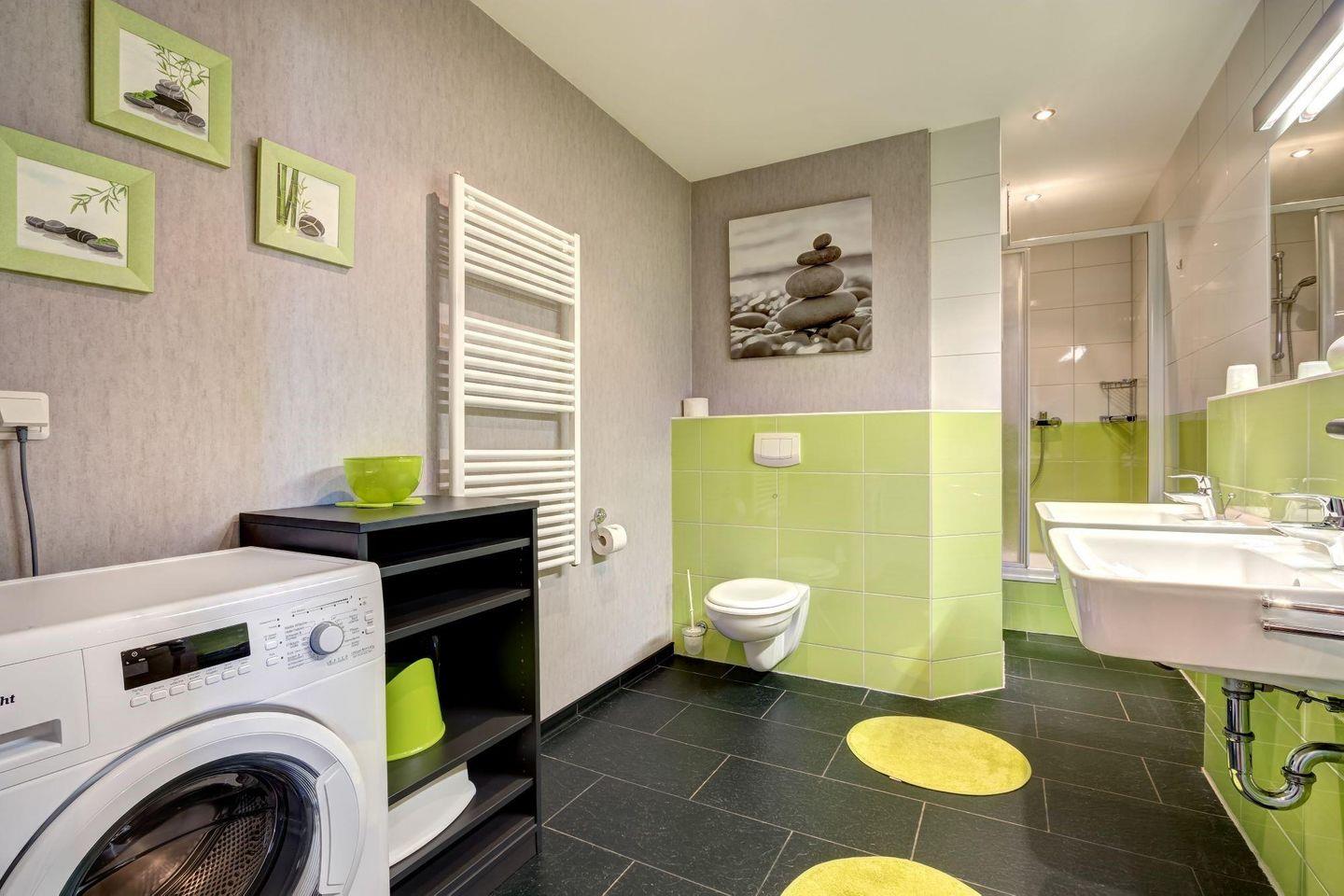 Das Bad ist mit Dusche, WC, Doppelwaschtisch und Waschmaschine ausgestattet.