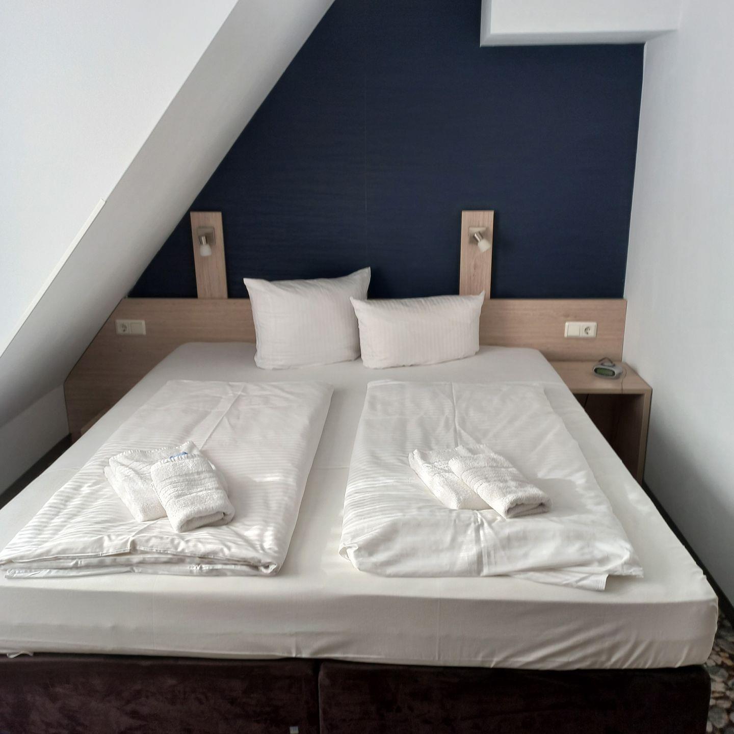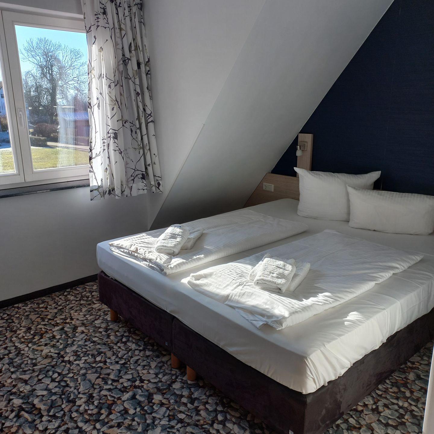 Doppelzimmer Nr. 16 " Copenhagen" in der historischen Remise von Schloss Stolpe gelegen, mit Blick auf den Remise-Innenhof und Westflügel.